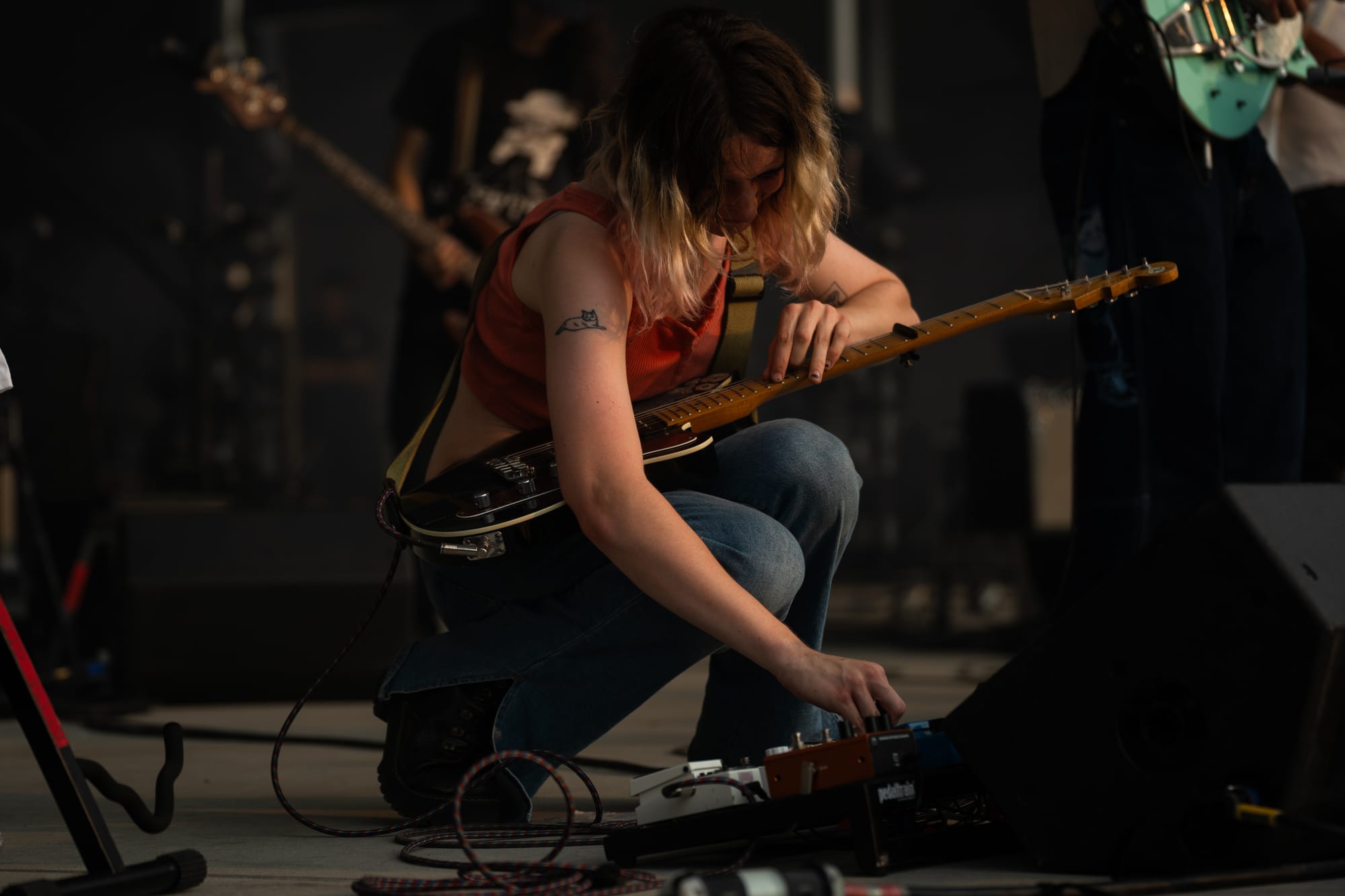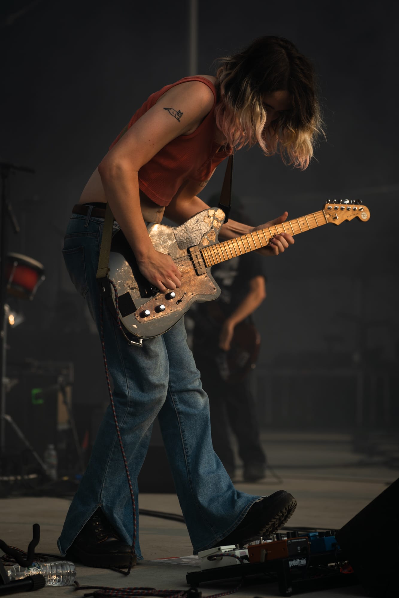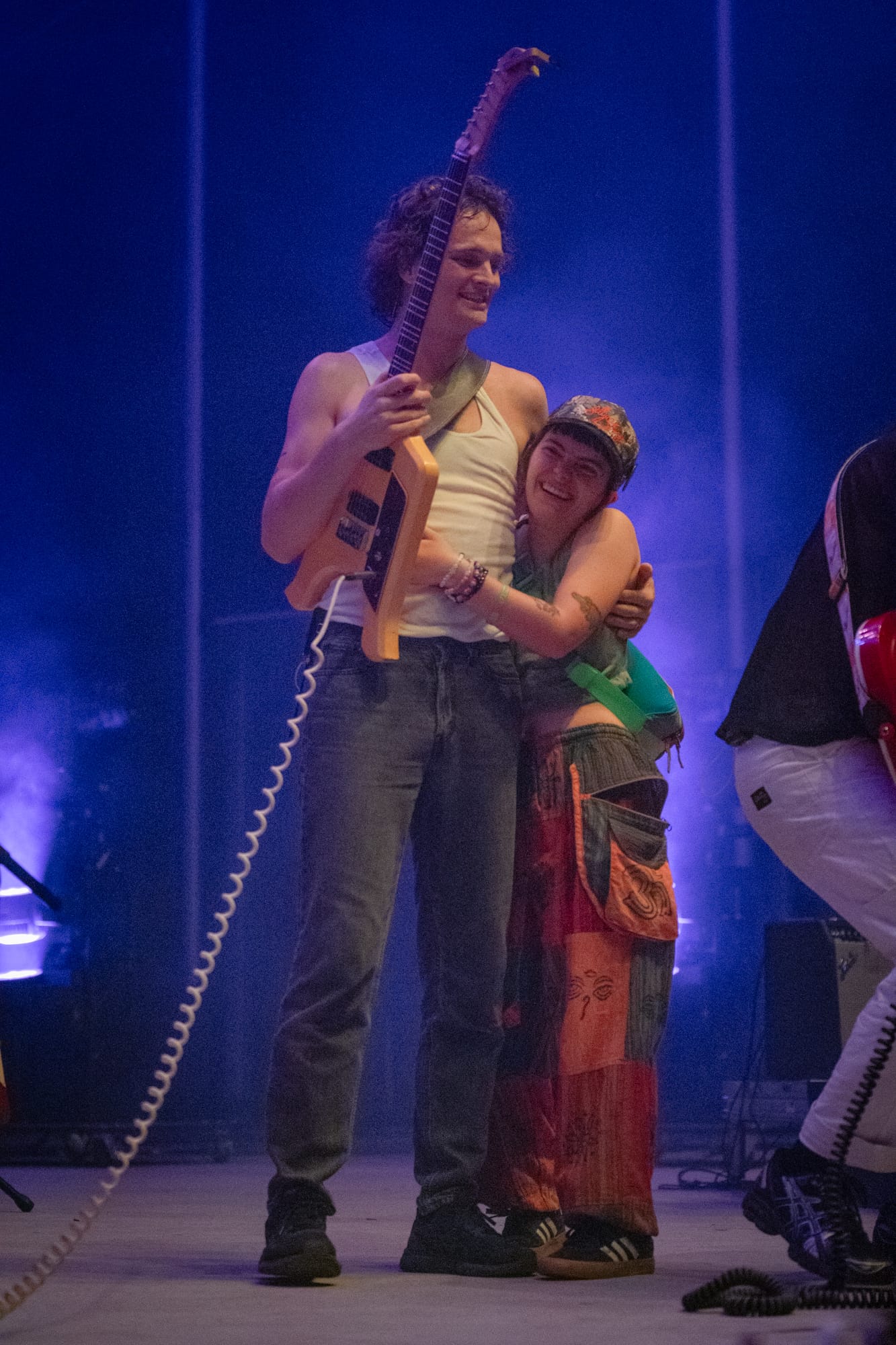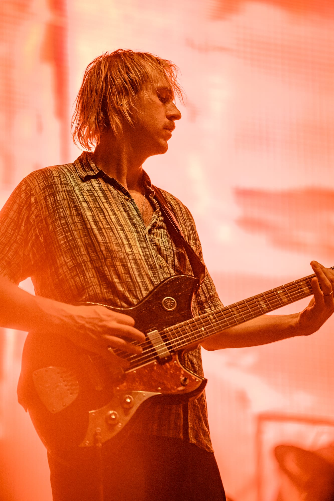 Priming the crowd would be Geese, a rock band from Brooklyn. I was immediately impressed by their vocalist, Cameron Winter. Opening with the first track of their 2023 album of the same name, 3D Country, we were introduced to the band with a cry from Cameron that continued through a crashing cacophony of strings and drums that blew me away. He has a voice that uses so much of his body’s energy that his hands are forced to float through the performance, shaking and pulling in as he expunges all the air in his lungs, contorting to the sides of the mic, just to carry on a note. The rest of the band is no different, sporting various stable and mobile guitars, synths, and keyboards. I was also captivated by their guitarist, Emily Green, who was just always on, and she shreds. During one song, I watched as she crouched right down in front of me, hovering over her pedals, shifting dials with one hand, on the other poking and prodding the strings with her fingers at a 90-degree angle before dragging them across the neck, the result being a screeching shrill that rang through the crowd, a sound of chaos, organized by her right hand on dials perfectly corralling the noise to integrate back into the other four members’ instruments. I really enjoyed hearing Cowboy Nudes live finally and highly recommend getting to the shows early to enjoy them.
