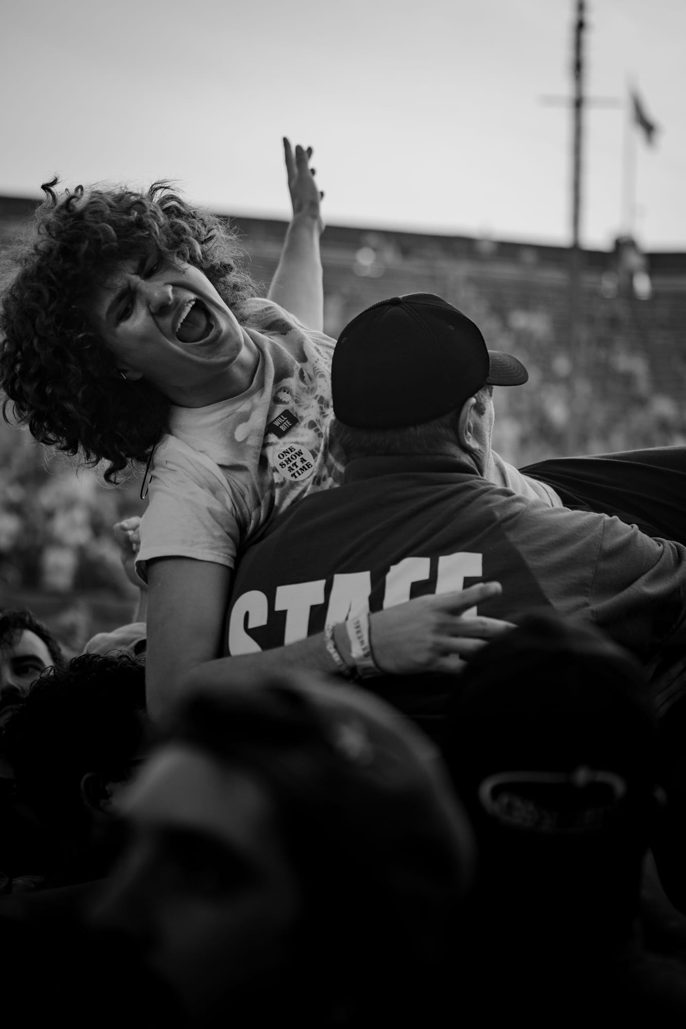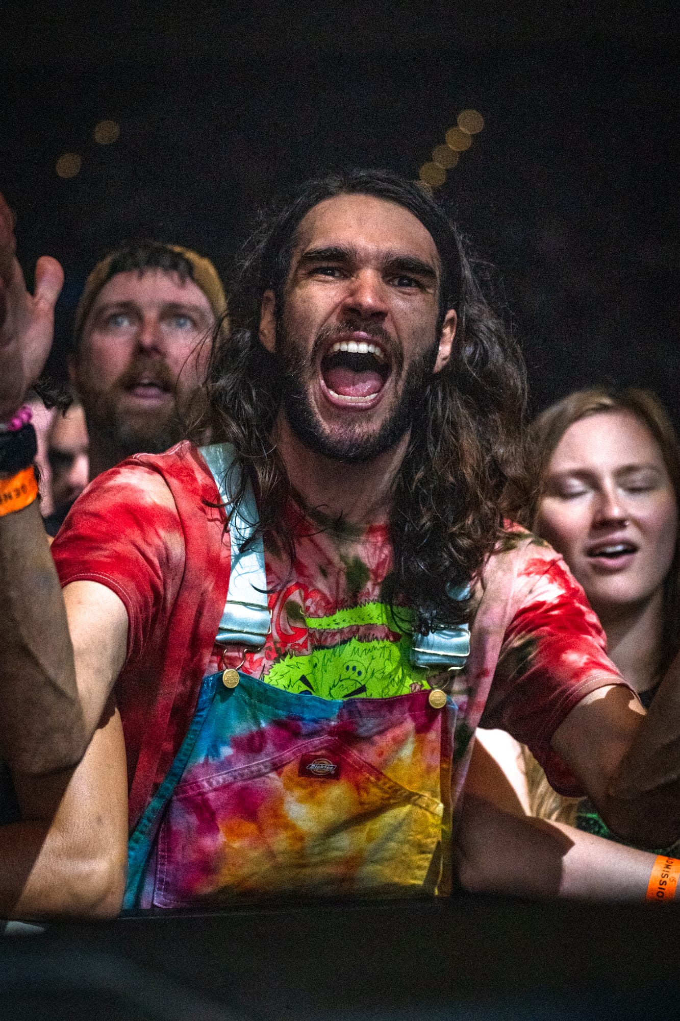 We begin as we begin all things, in a Biergarten in Queens, surrounded by beings in tie-dye and jumpsuits. Four and a half hours before the doors of the stadium swung open, a fan meetup was hosted at Cobblestone’s Pub and Biergarten, organized by the Weirdo Swarm (the moniker given to the fan base). I walked through the back doors of the pub to the Biergarten and was welcomed into the swarm with arms wide open. I was quickly met by two fast friends, Kelly and James, who had flown up from South Carolina for both nights. When they heard this would be my first show and that I was shooting it, they immediately swarmed me with bracelets, stickers, and pins, calling over their friends who became mine, gifted me more stickers, and repeated. I filled my bag, ate good food, had great company, and then took a walk over to the vendors.