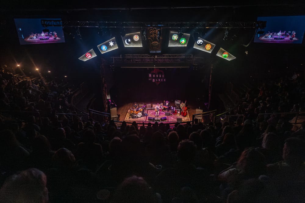 On Friday, January 17th, Ani DiFranco stepped out on to the House of Blues stage in Houston, Texas, which was the second stop of a cross-country and European tour to support her new album, Unprecedented Shit. As the bright lights panned over the stage and into the audience, you could see delighted faces in the crowd waiting in anticipation. The environment on stage lent to the intimate feel, with carpets layered on the stage reminiscent of MTV Unplugged. It almost felt like being in someone's living room instead of a large, multilevel venue. DiFranco was accompanied on stage by a drummer, keyboardist, and a double bassist playing alongside her singing and guitar playing. The audience was seated around the stage, also giving it that close, intimate vibe.