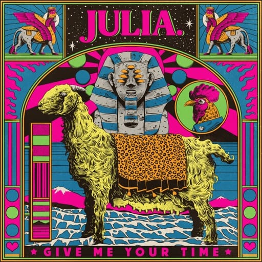 I didn’t even need to hear the song to know that “Give Me Your Time” was going to be a knockout; I just had to see the artwork. Something that can be hard to explain to those on the outside of the psychedelic world is that our niche has a happening poster scene. If you go to a psych show, you’re going to find some wild artwork at the merch table; this is something that dates way back to the psychedelic revolution of the ‘60s and would require an article all its own to explain. The short answer to what I’m trying to say here is that you can tell if a band is with it or not by their cover art. Based on the day-glo goat adorned with a cheetah print shawl surrounded by sphinxes, roosters, and stunning mountain ranges, I could tell JULIA. is hip. And what do you know, I was right.