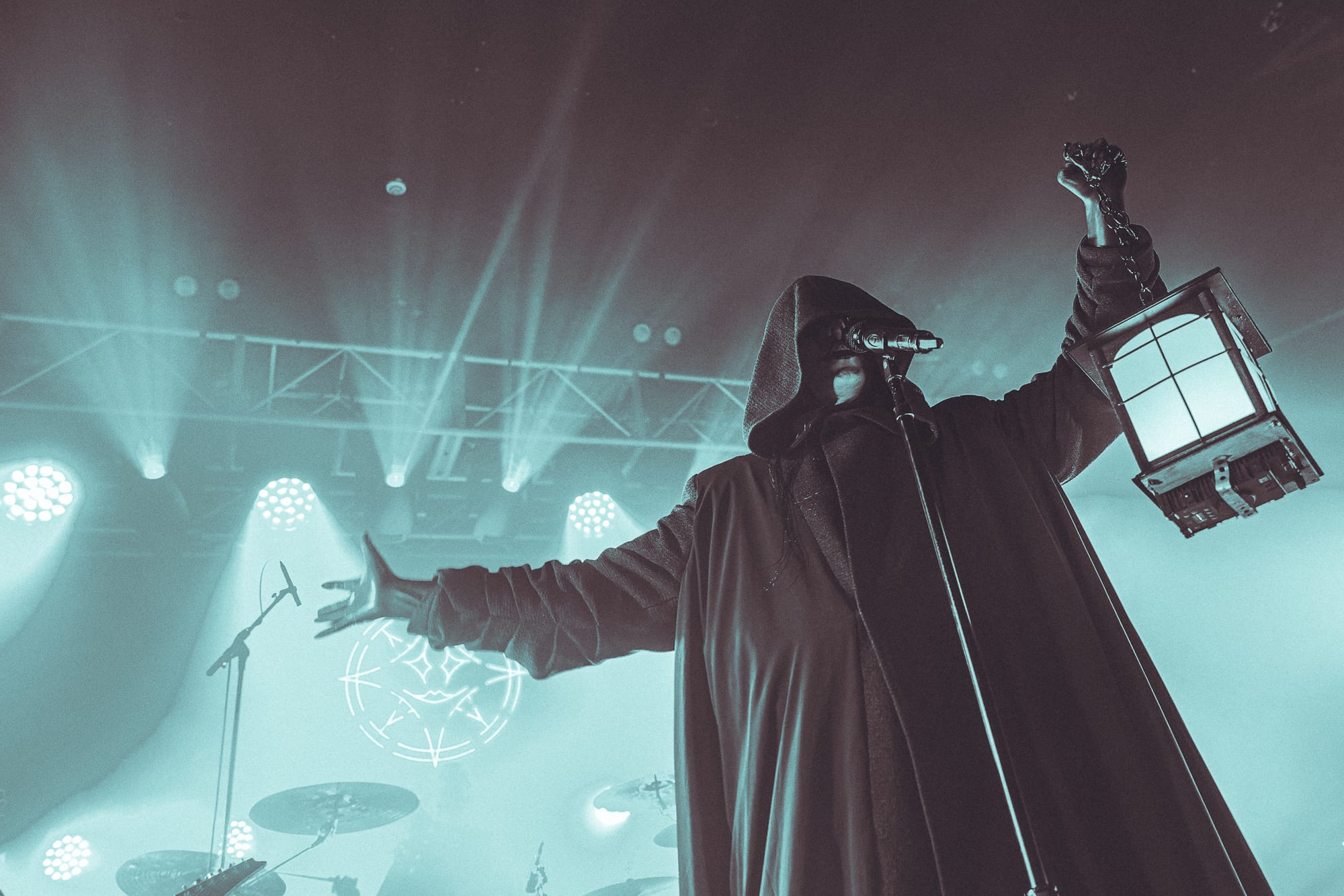The stage was practically ultra-violet with the blue and purple lights that penetrated through the fog, the sounds of a thunderstorm and crashing waves all around; everyone's favourite clown and the ring-master of this particular circus, Johannes Eckerström, hooded and cloaked and carrying a lantern, slowly led the rest of the band out and into the sea-shanty-esque start of "Captain Goat" from the new record.