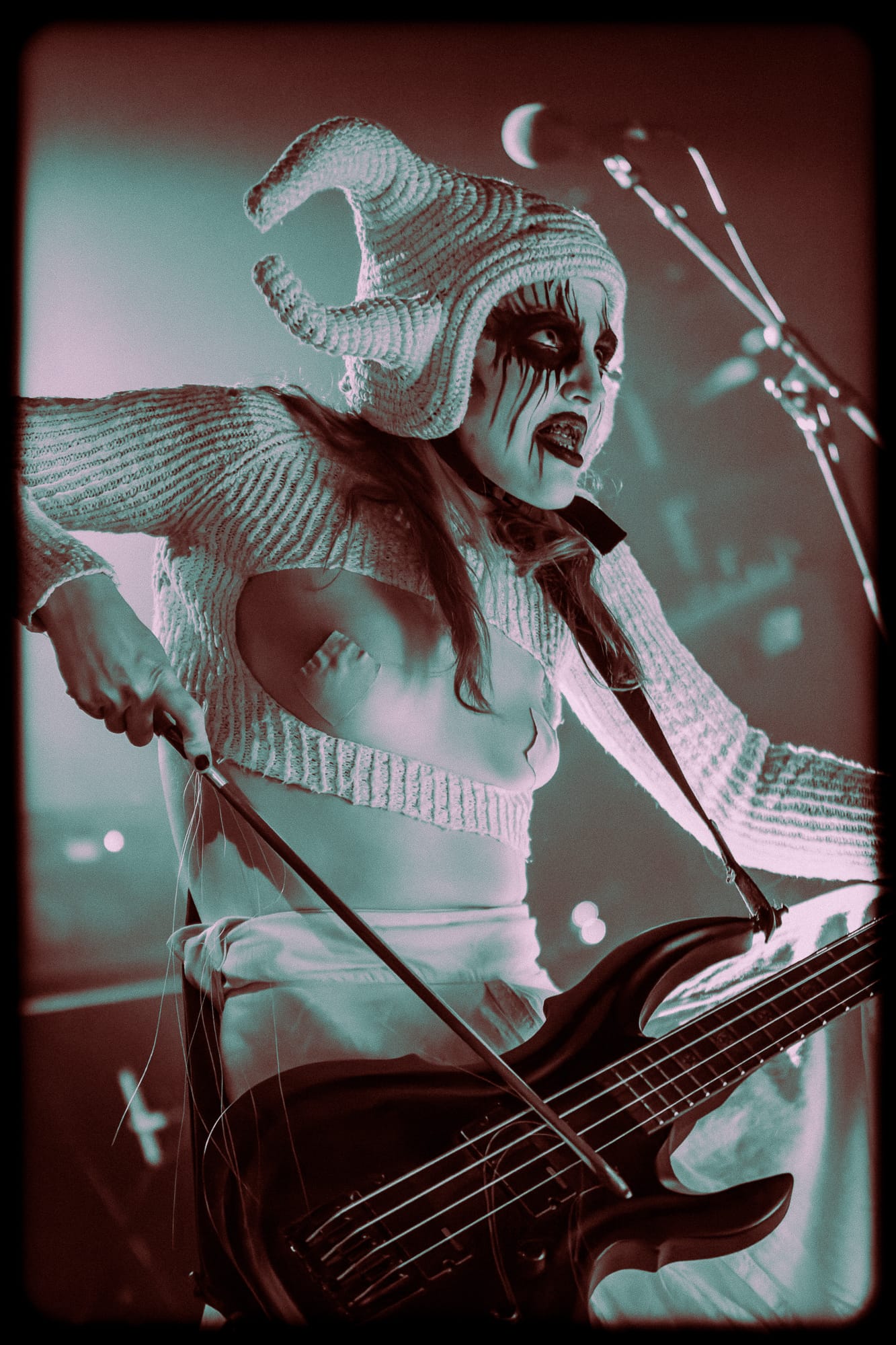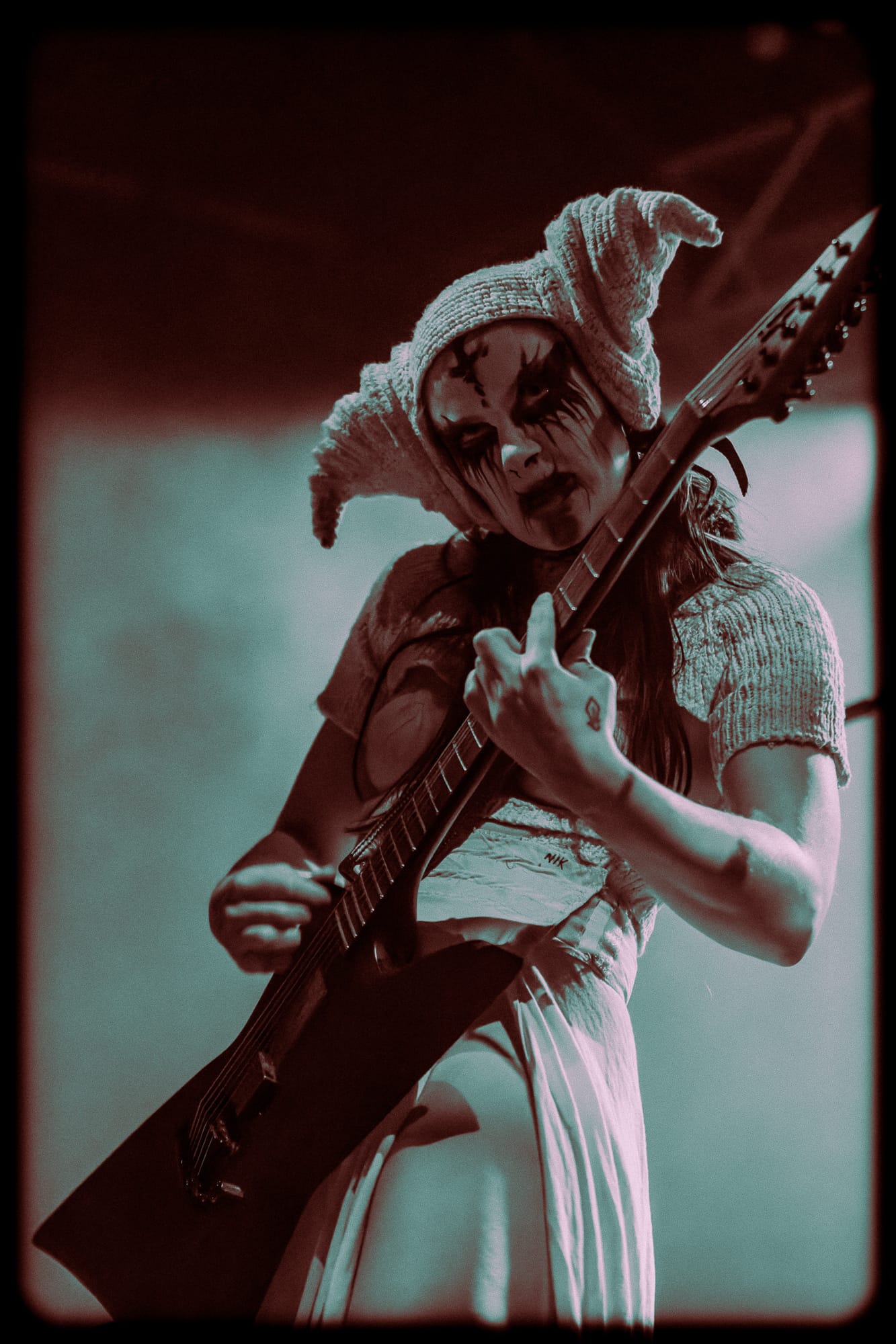 First onto the stage, a trio of witches from Norway, Witch Club Satan are part performative theatre but 100% Black Metal. Emerging in procession onto a stage enveloped in red light and sporting some very 'interesting' knitwear (strategically placed plasters required), the ritual of the evening began, each member holding a smouldering remnants of some form of incense/herb as they gave up an offering to the front row.