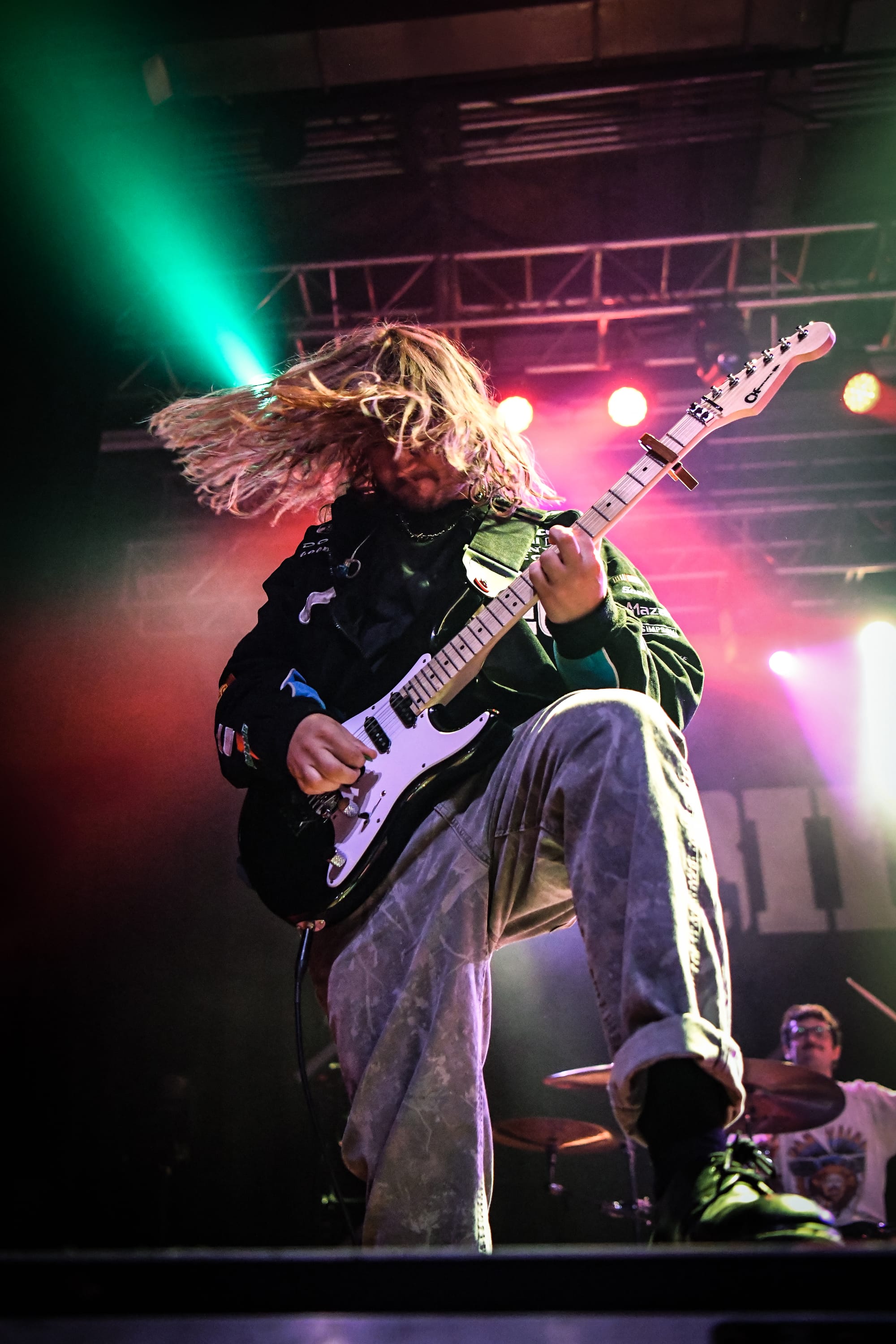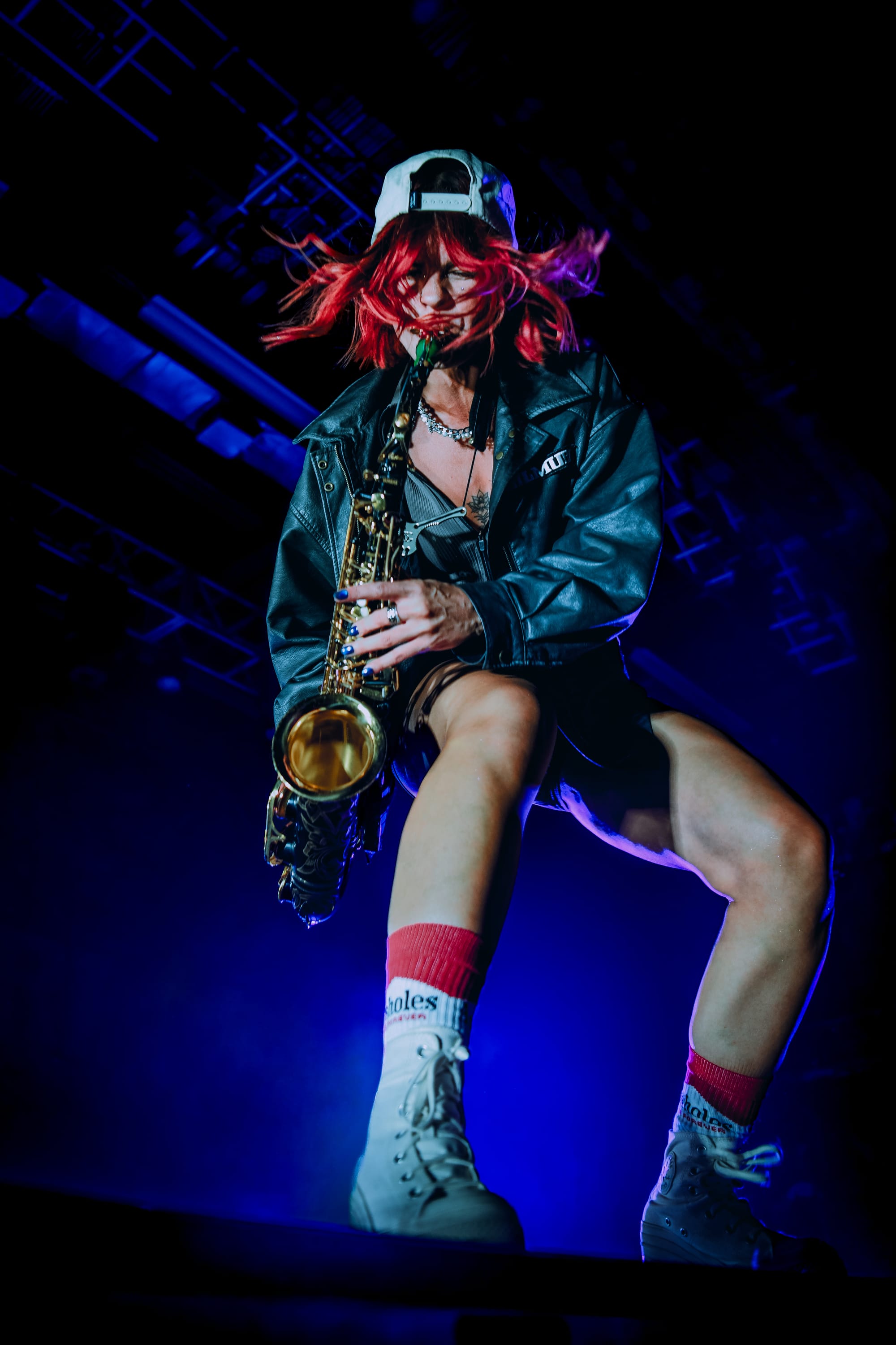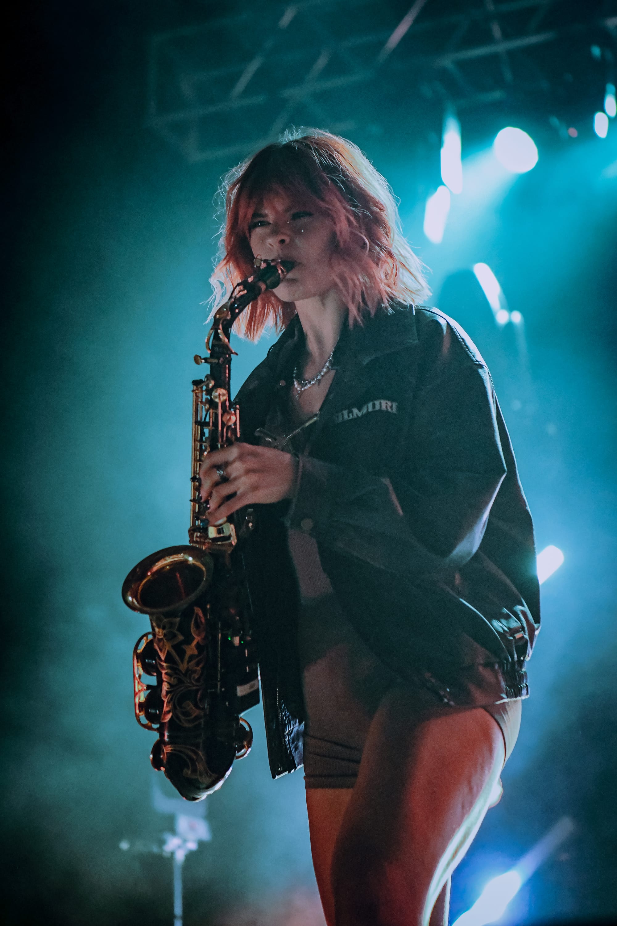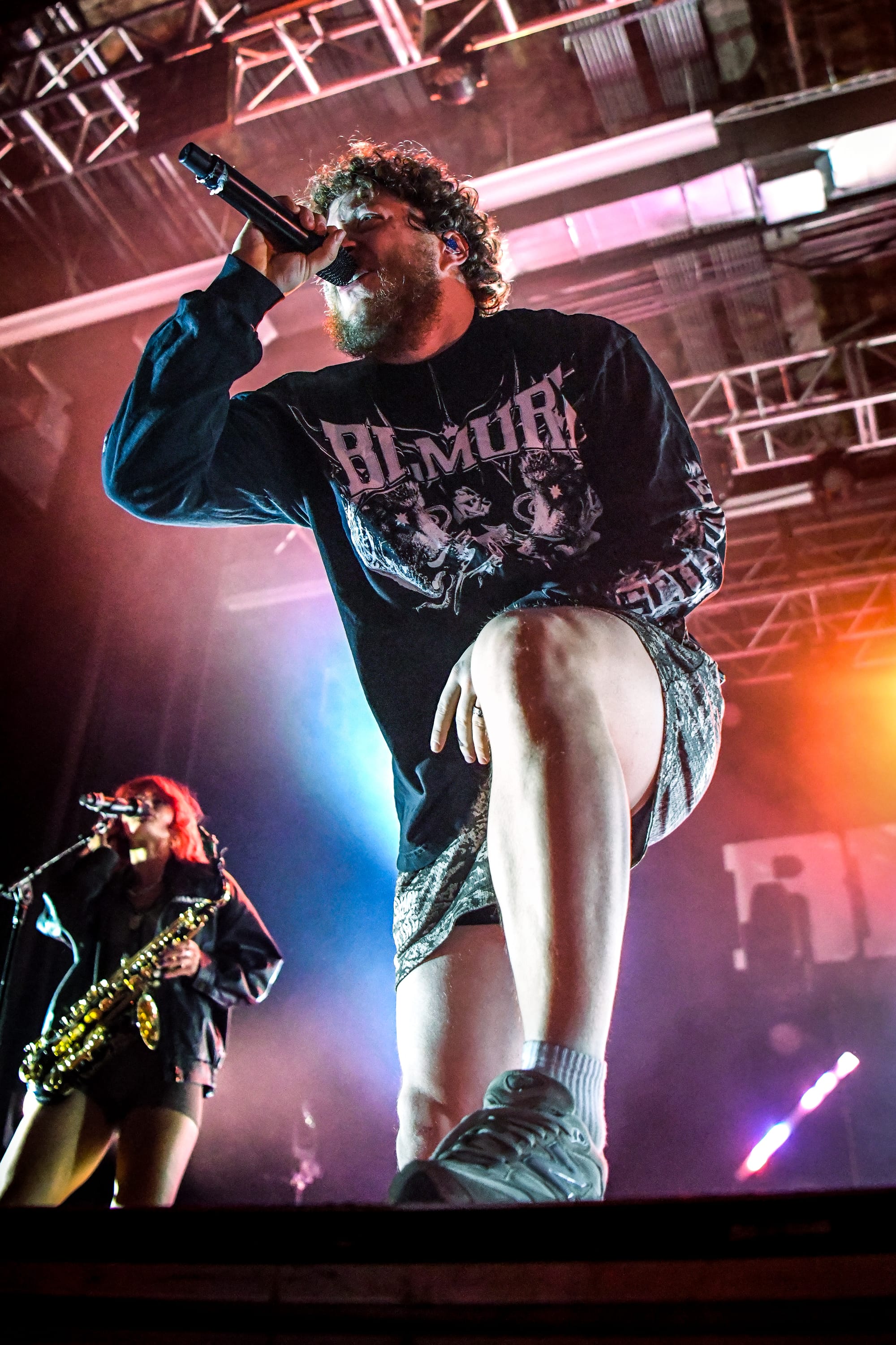 Bilmuri came out swinging with “EMPTYHANDED,” which had the crowd shouting in unison, “START! YOUR! ENGINES!,” and the energy never let up from there. Mosh pits opened, crowd surfers began pouring over the barricade, and the crowd collectively head-banged and screamed the lyrics at the top of their lungs as they continued on with “ALL GAS” and “ABSOLUTELYCRANKINMYMF’INHOG.” Frontman Johnny Franck’s vocals were on point as he bounced around the stage, connecting with fans on both sides by pointing them out, smiling, and making eye contact. Gabi Rose was particularly impressive, showcasing her powerhouse vocals as she took on solos and harmonized with Franck, jumping and dancing around the stage (in heels!), all while absolutely wailing on the saxophone. Reese Maslen thrashed his hair around while he shredded the guitar, and drummer Xavier Ware demonstrated his talents behind one of the most insane drum setups I’ve seen on a stage. Franck encouraged the audience to summon riffs from Maslen by chanting “Reese! Reese! Reese!,” resulting in multiple face melting guitar solos throughout the set.
