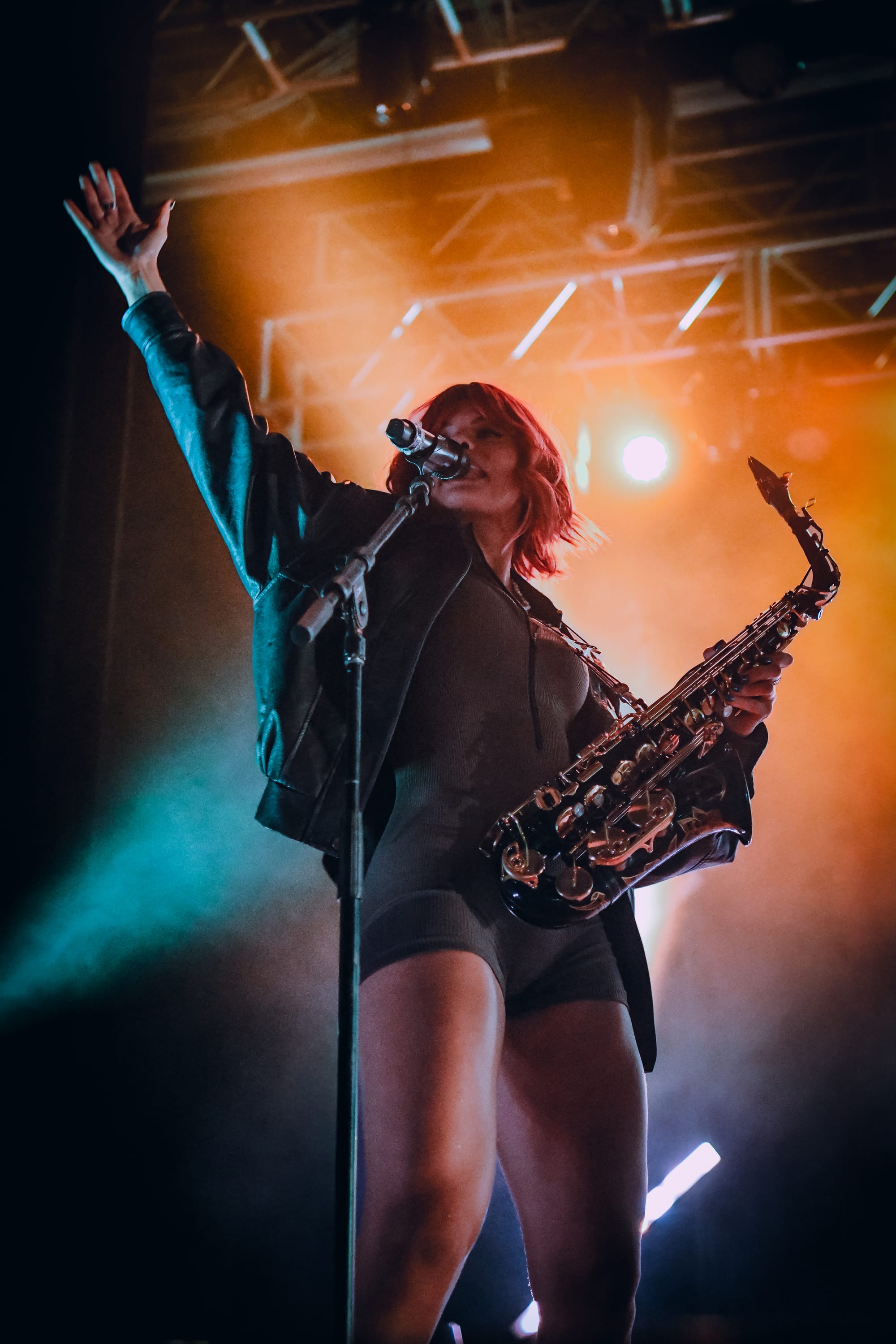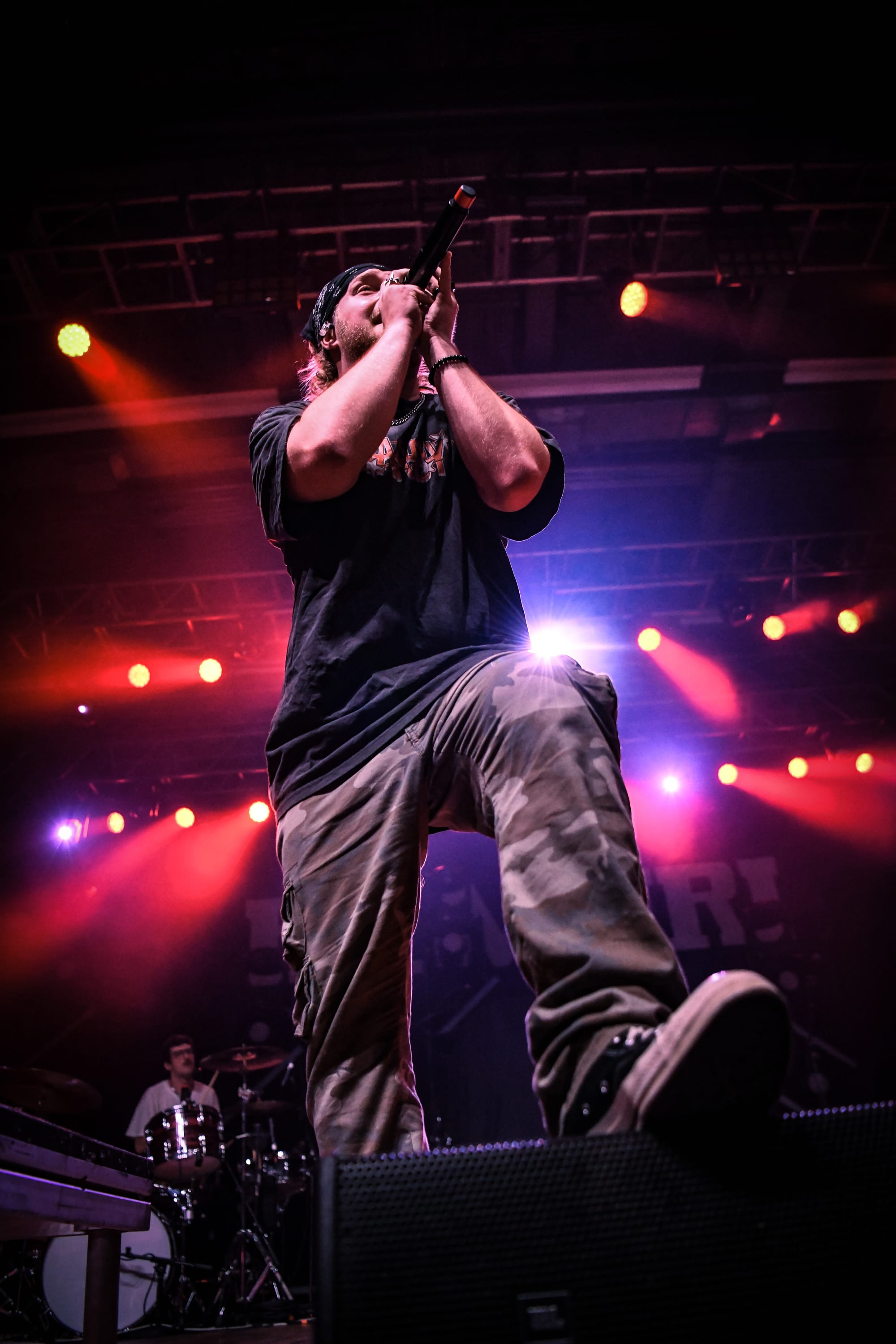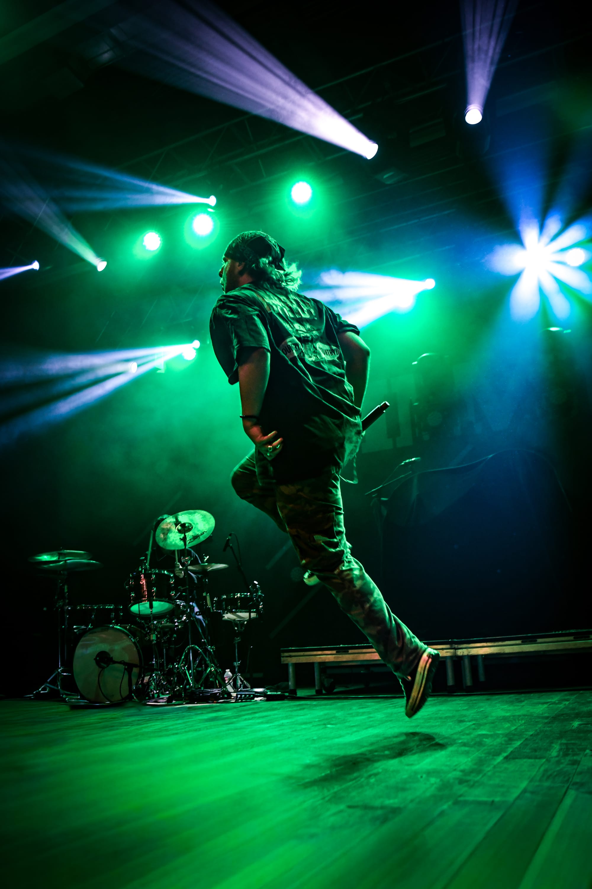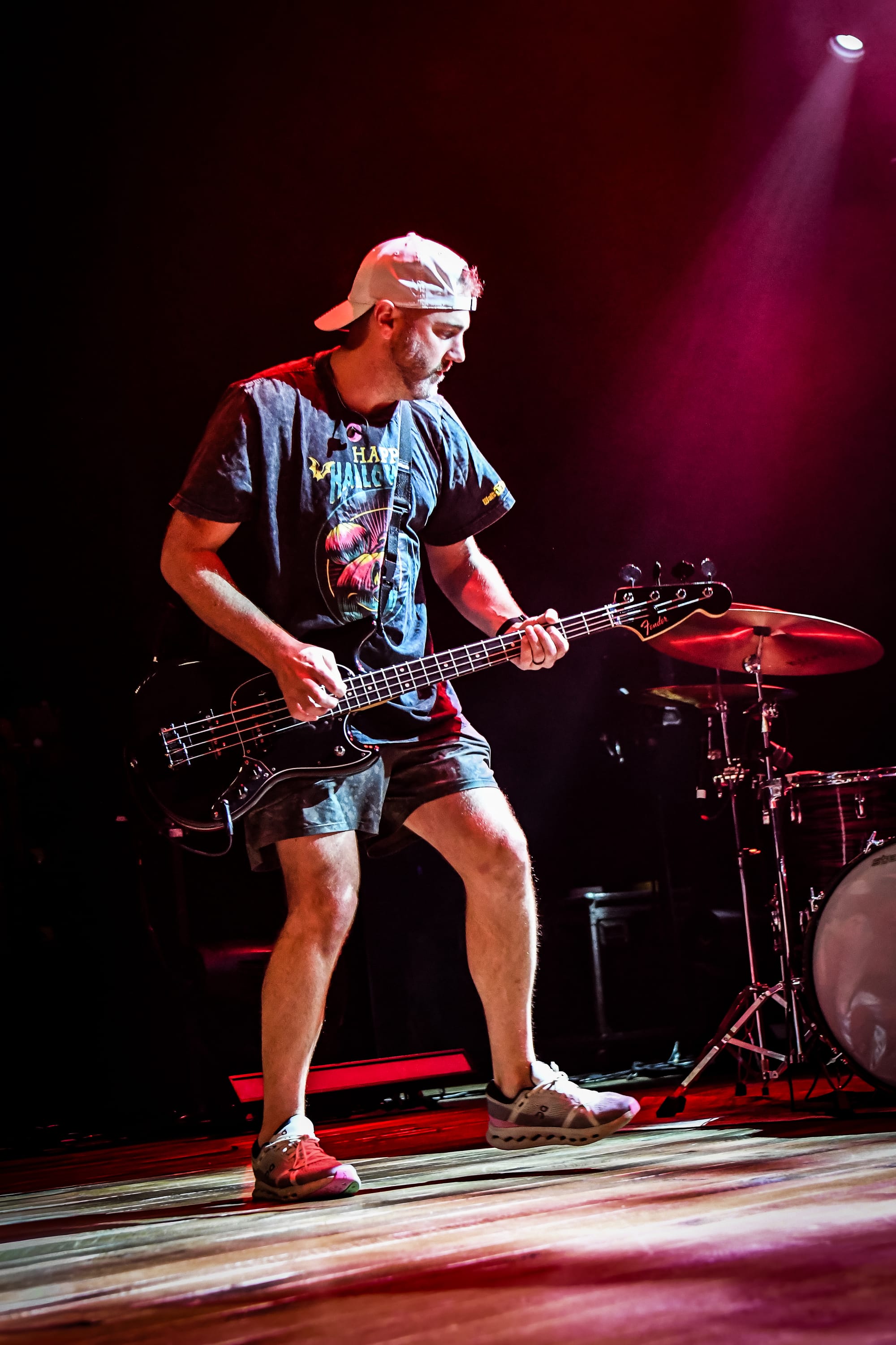 Bilmuri came out swinging with “EMPTYHANDED,” which had the crowd shouting in unison, “START! YOUR! ENGINES!,” and the energy never let up from there. Mosh pits opened, crowd surfers began pouring over the barricade, and the crowd collectively head-banged and screamed the lyrics at the top of their lungs as they continued on with “ALL GAS” and “ABSOLUTELYCRANKINMYMF’INHOG.” Frontman Johnny Franck’s vocals were on point as he bounced around the stage, connecting with fans on both sides by pointing them out, smiling, and making eye contact. Gabi Rose was particularly impressive, showcasing her powerhouse vocals as she took on solos and harmonized with Franck, jumping and dancing around the stage (in heels!), all while absolutely wailing on the saxophone. Reese Maslen thrashed his hair around while he shredded the guitar, and drummer Xavier Ware demonstrated his talents behind one of the most insane drum setups I’ve seen on a stage. Franck encouraged the audience to summon riffs from Maslen by chanting “Reese! Reese! Reese!,” resulting in multiple face melting guitar solos throughout the set.