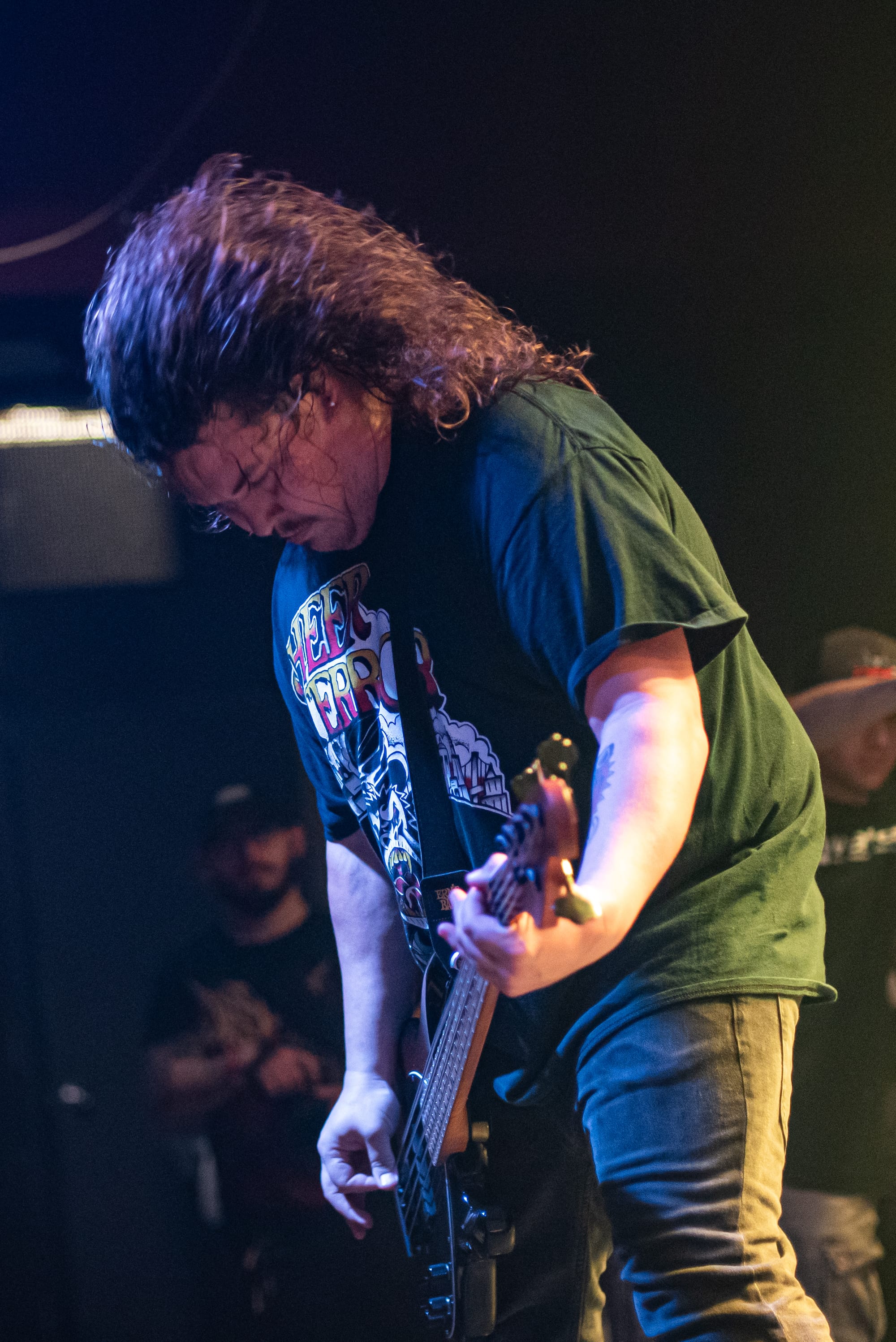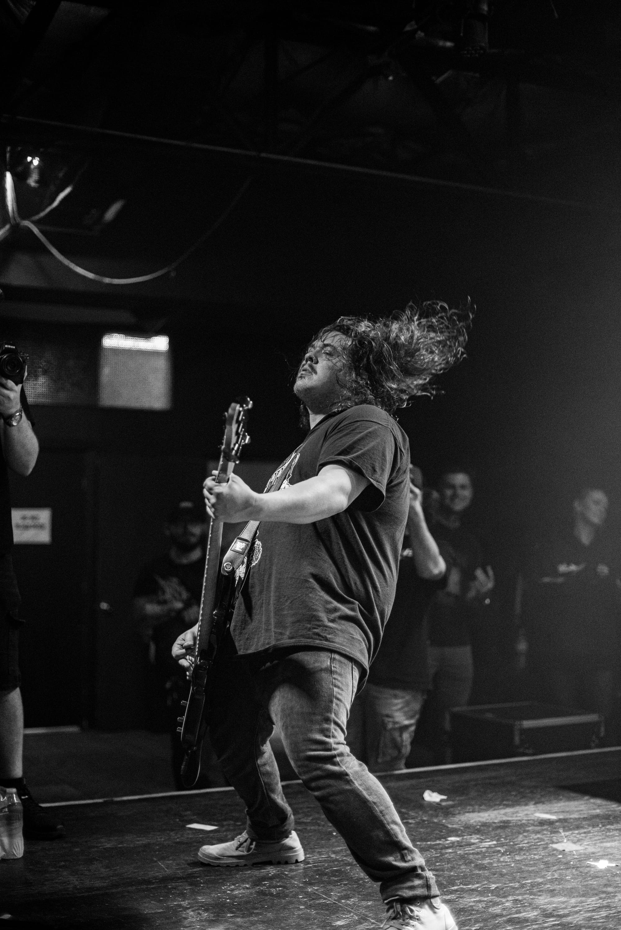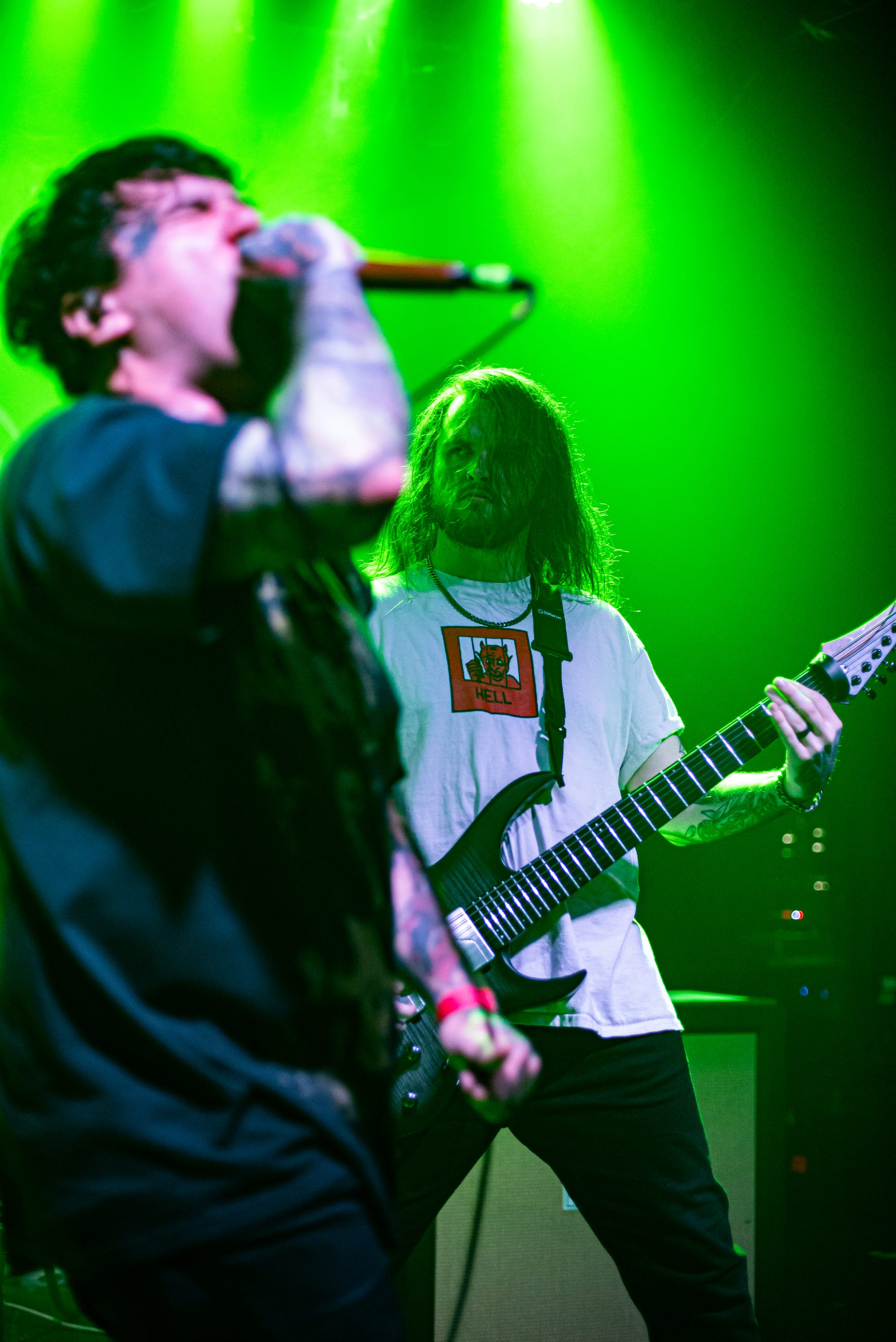 As Bodysnatcher took the stage, the crowd was more than ready to set these plans into motion, with mosh pits and daring acts of stage diving well underway. The band kicked off their intense performance with tracks off their latest EP, Vile Conduct, including "Infested," "Severed," and, later, "Confession." Their set continued with seamless transitions into songs from their older albums, keeping the crowd's energy high and the moshing alive and well. With stray elbows and kicks constantly flying at me, the electrifying performance certainly kept me entertained and my head on a swivel.