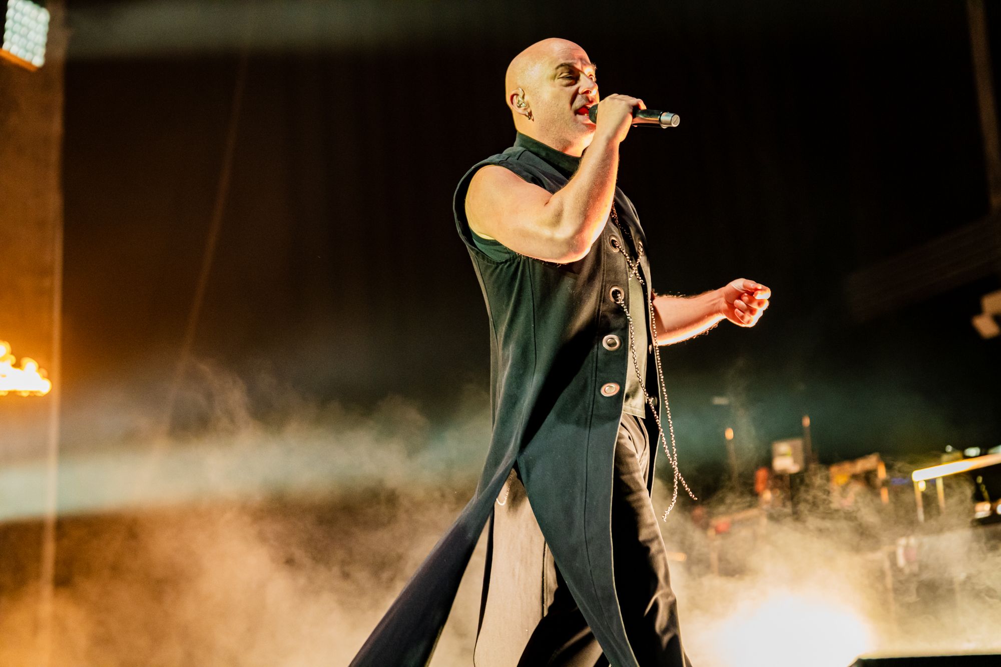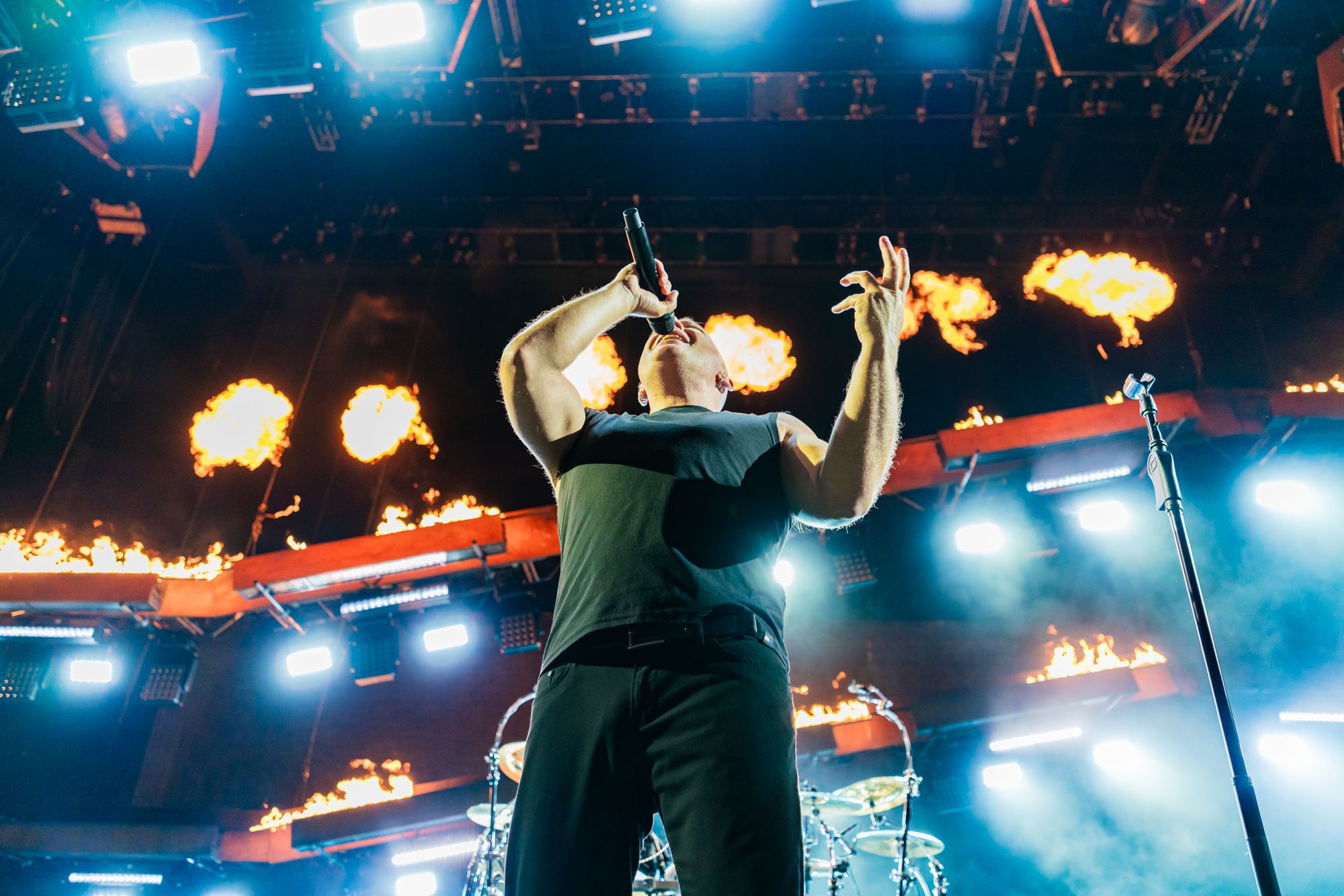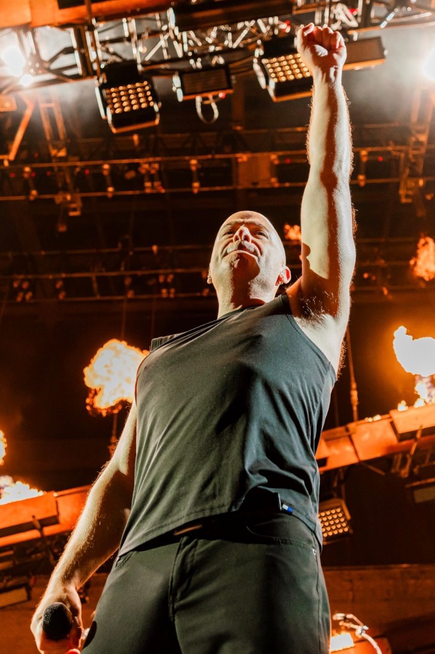 Regardless, it was great to see him and the rest of the band (guitarist Dan Donegan, drummer Mike Wengren, and bassist John Moyer) as they took the stage blaring 'Hey You', the lead song off last year's Divisive. Prowling a stage that was constantly in various states of 'on fire' ranging from 'wow, that's a lot of fire' to 'holy shit, the whole stage is on fire', Draiman looked and sounded just like he did on the night we became best friends, immediately tearing into back to back hits 'Stupify' and 'Ten Thousand Fists', both Donegan and Moyer jumping in the air during choruses, Father Time be damned.