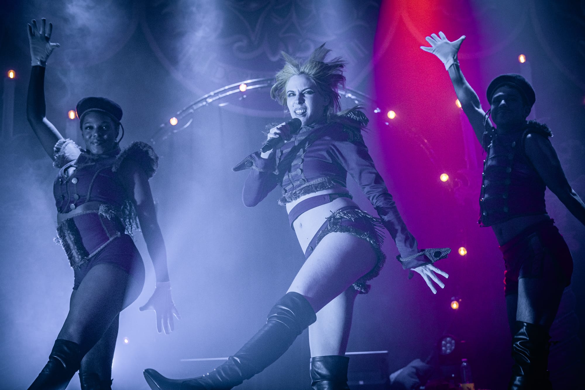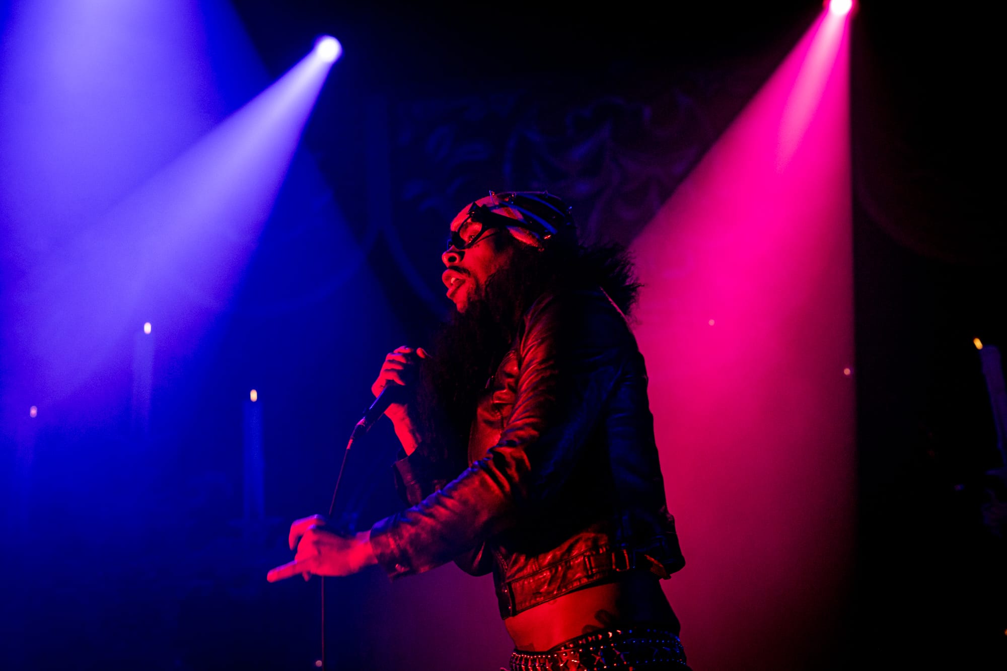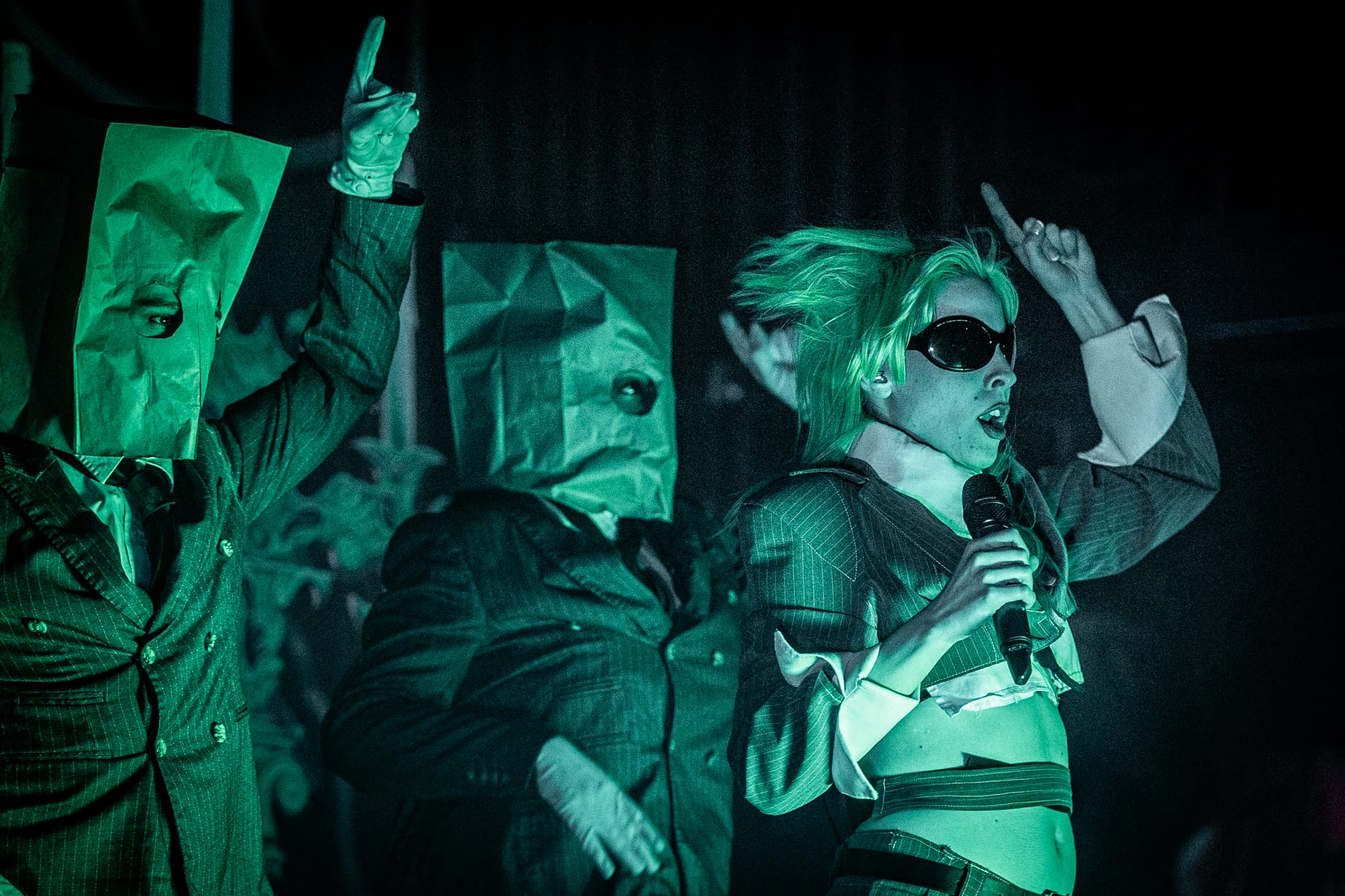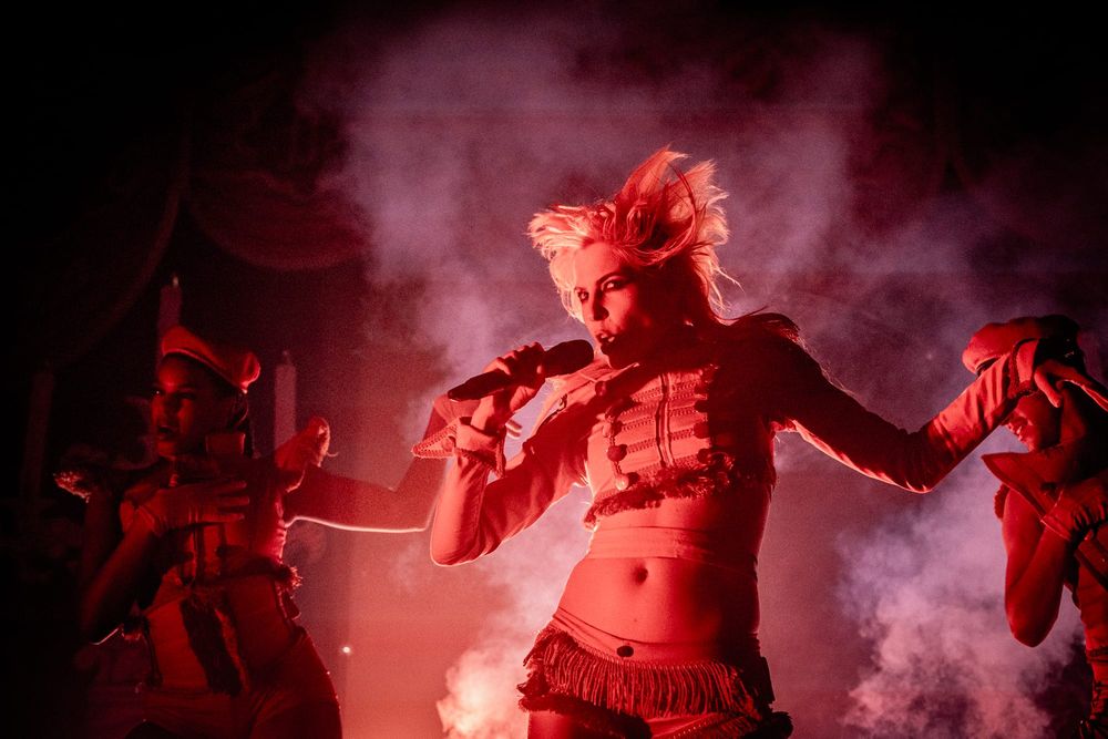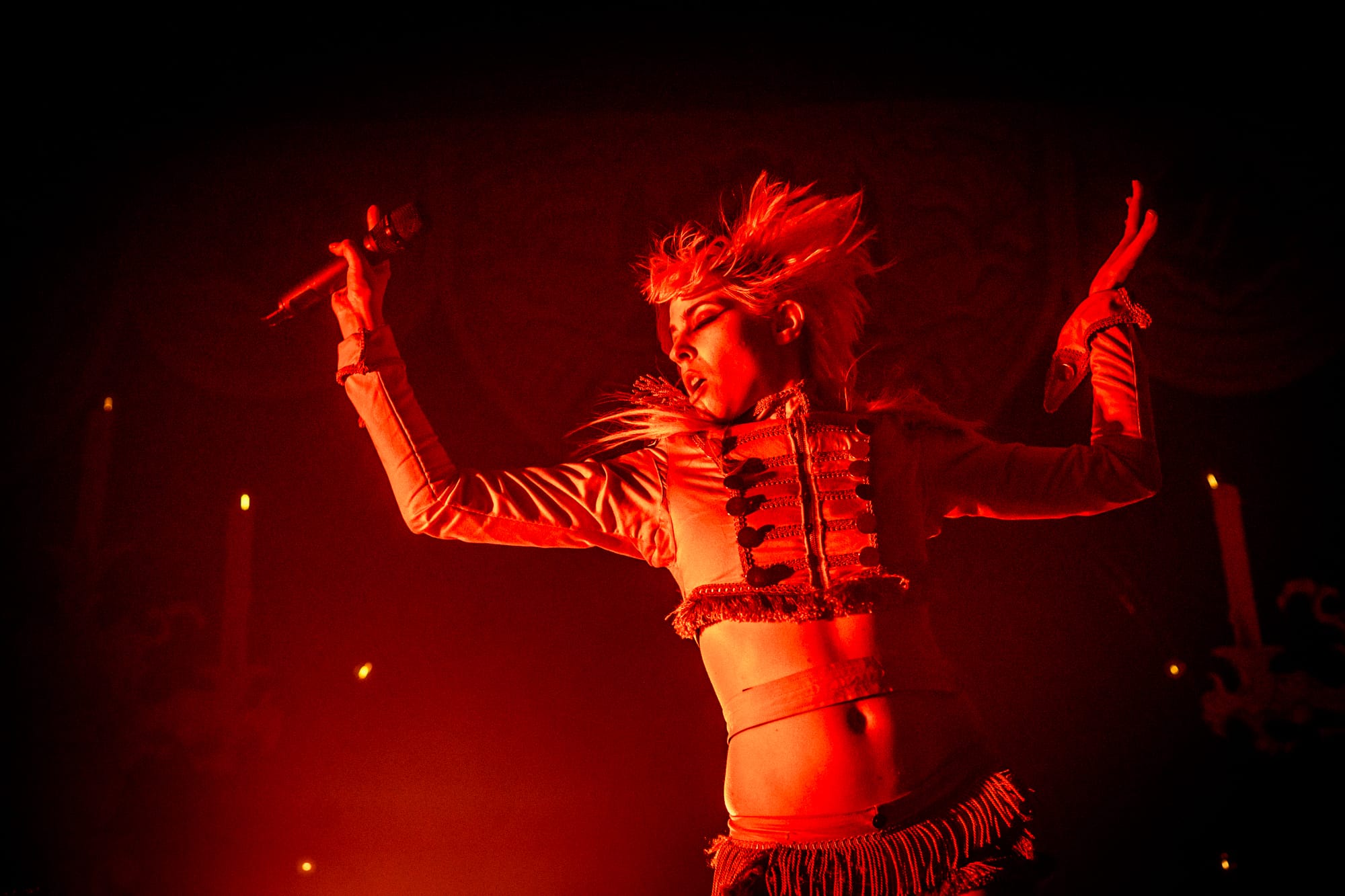 Dorian Electra takes the stage next for the main event of the night. 10 minutes prior to arriving on stage, the lights went out and Bach’s “Toccata and Fugue” played in preparation for Dorian’s grand entrance. The smoke started billowing and once the spotlight flicked on Dorian Electra stood in the middle of an arch adorned by Edison light bulbs and opened the night with their tracks, “Symphony”, “Idolize” and “Flamboyant”. Continuing from the opening tracks Dorian goes into their song “Puppet”, as a giant marionette creature adorned with Melpomene and Thalia masks chased Dorian around the stage. Performing their track “Adam & Steve”, Dorian dedicated the song to their queer fans in the audience. Prior to the first interlude of the night, the two backup dancers battle with trombones, capturing Dorian, tying them up and executing them. They hold up what looks to be a decapitated head before vanishing from the stage in preparation for the shows second act.