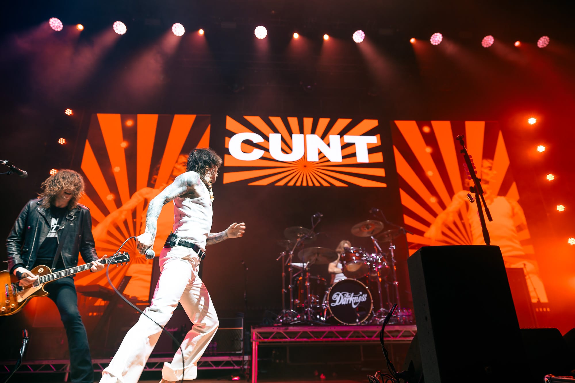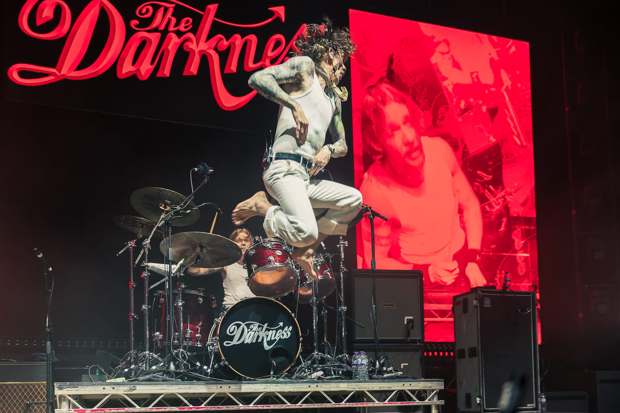 The Darkness are probably still best known for their debut album, 2003's Permission to Land, and the set list reflected this, as it boasted an almost equal number of tracks from Permission and their most recent album. Their venture into the past started with "Growing on Me" where the show briefly paused following the opening notes. Hawkins then encouraged the crowd to put their phones away, to be present, and to have "a little boogie" with the band before launching back into the track.