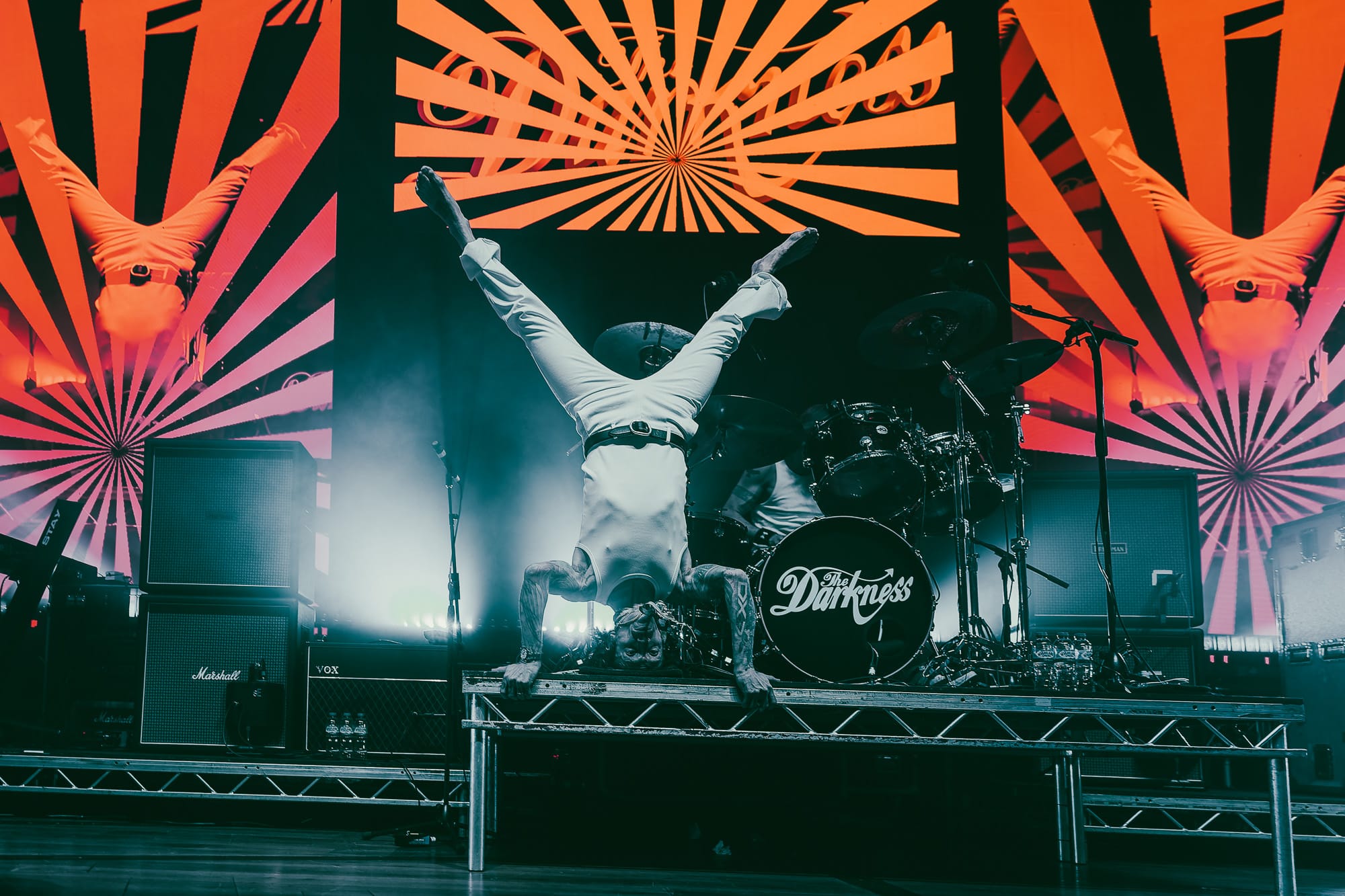 There was some more crowd work before the next song, with Hawkins commenting on how slippery the stage was. Soon after, sparkly boots were jettisoned, trousers rolled up, and feet bare. "Get Your Hands Off My Woman" then followed and with it, some on-stage gymnastics, as Hawkins performed a headstand atop the drumkit and encouraged the crowd to clap along to the song using his feet.
