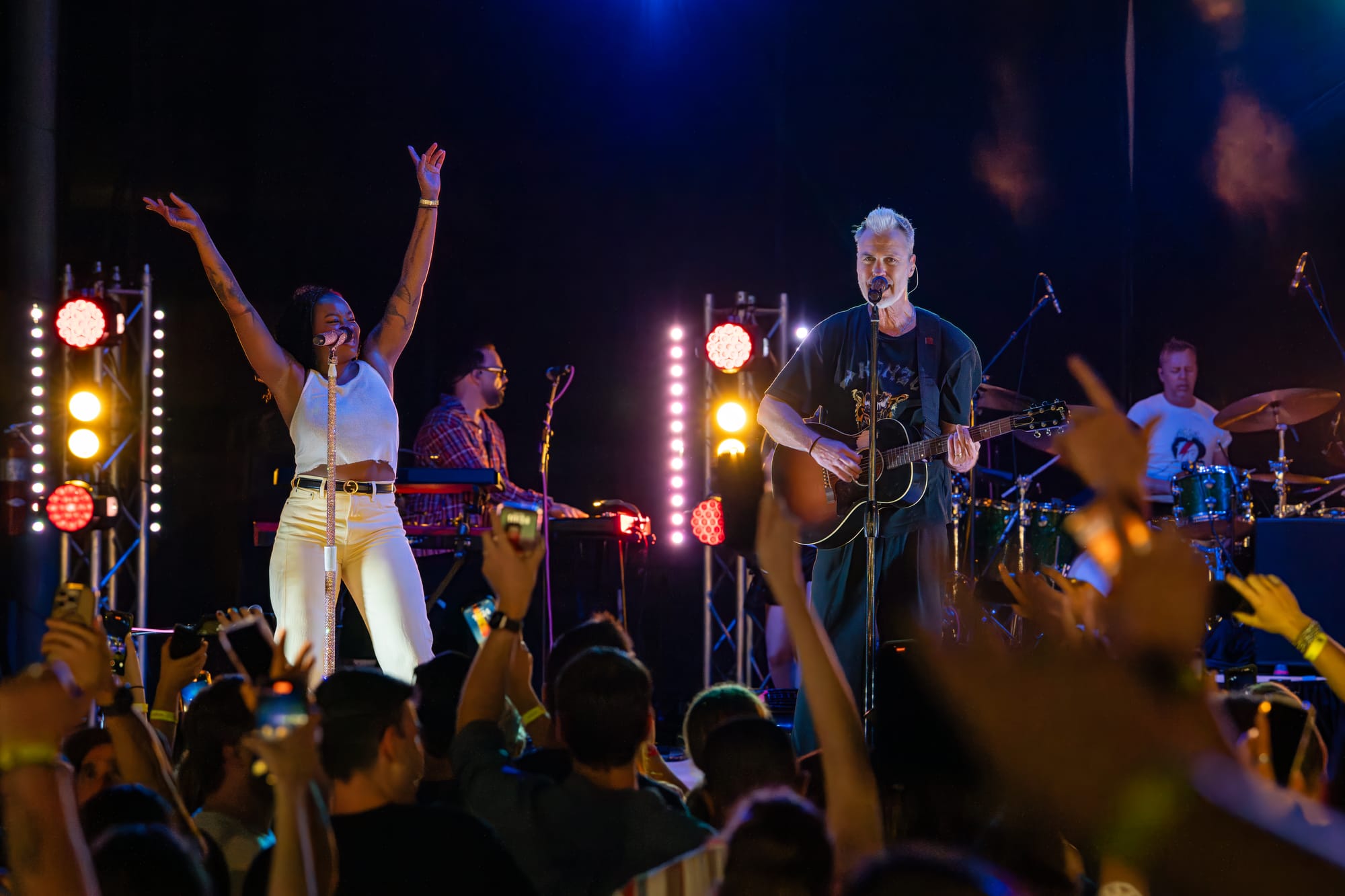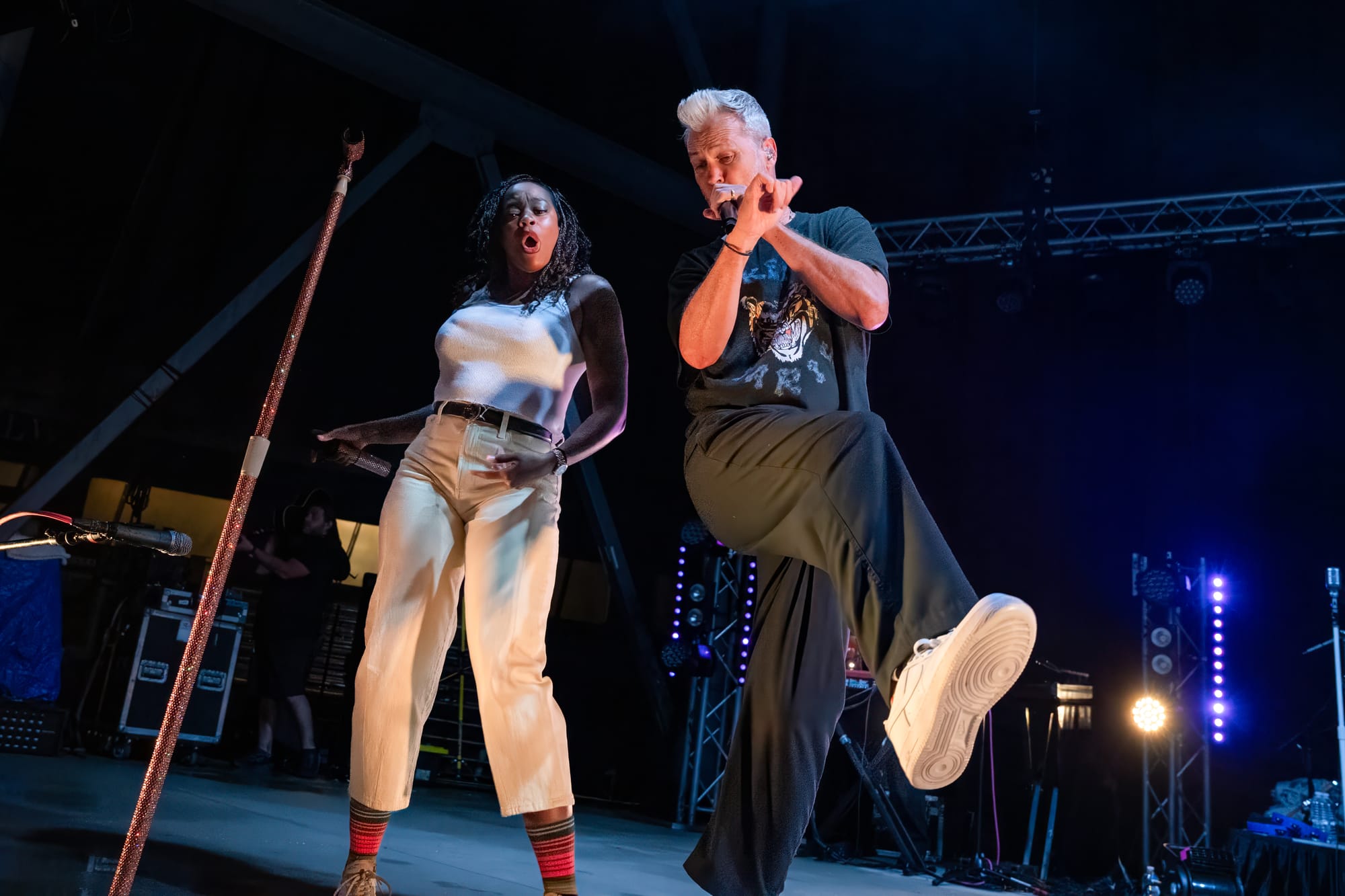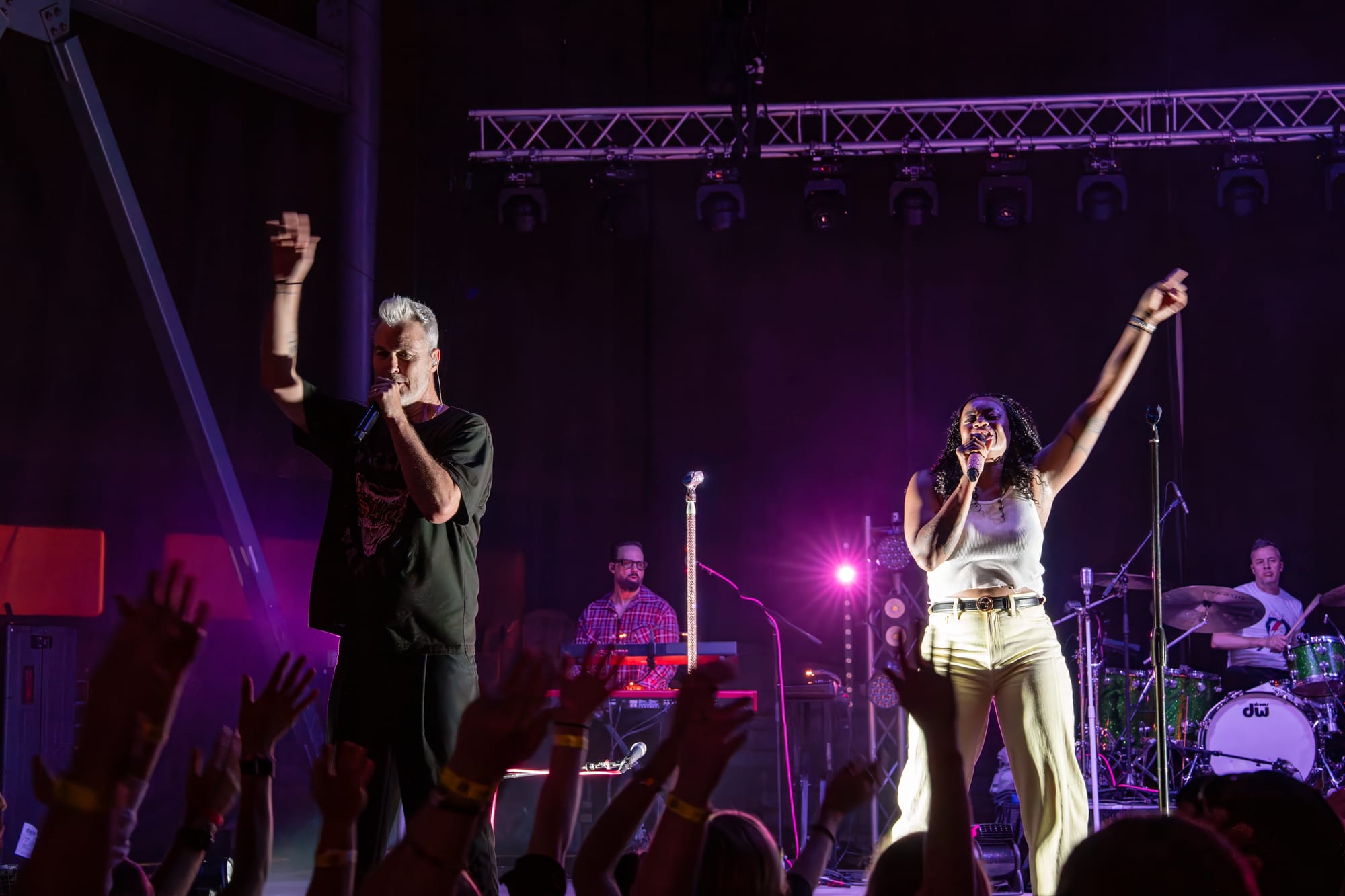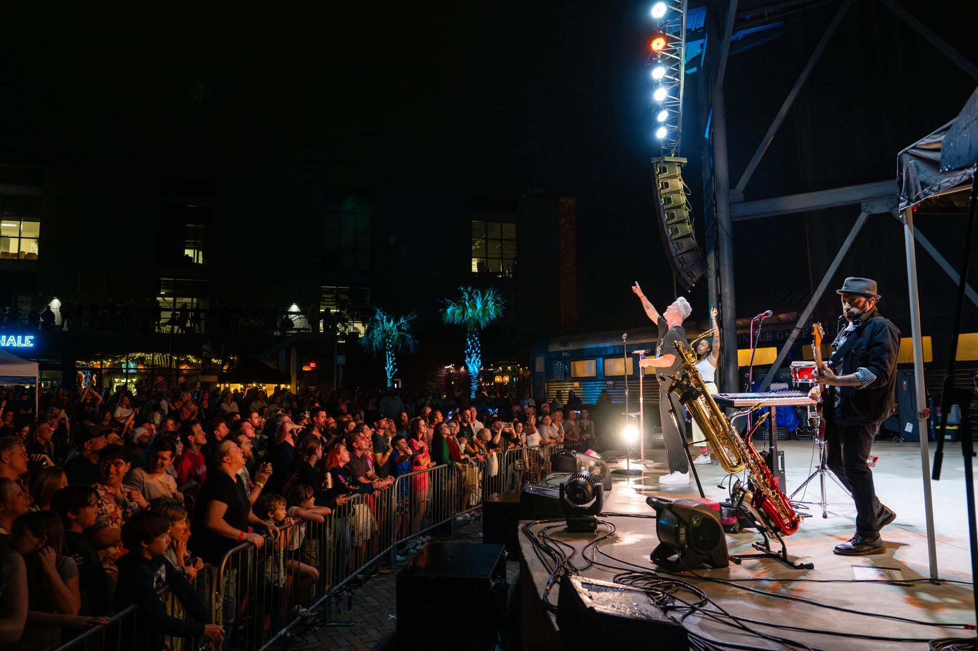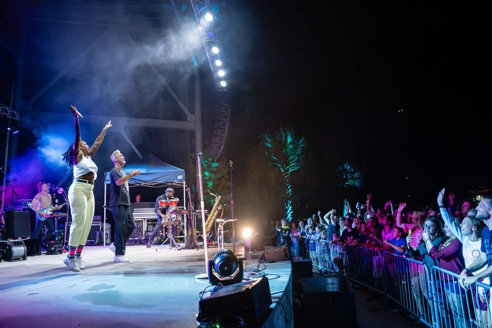 Fitz and the Tantrums took the stage, and the crowd went nuts. Co-lead vocalists Michael Fitzpatrick and Noelle Scaggs thanked the crowd for sticking it out and launched right into “Sway,” a feel-good pop bop from their 2022 album Let Yourself Free that immediately had the crowd dancing and singing. What's great about Fitz and the Tantrums is that their music is infectious but also incredibly adaptable. Versatile enough to be played to pump up crowds at sports stadiums, or to be played at kids' birthday parties to make kids dance off their sugar high. Their music is approachable and unoffensive, and that's great. There were plenty of families there to take in the tunes. It was fun for kids to dance along with their parents to songs like “123456” from All the Feels. Fitz and the Tantrums create an atmosphere where everyone can have fun. No time was this more apparent than when they began to play “Out of My League” from More Than Just a Dream. Hips were shaking, hair was swaying, and the lyrics were passionately belted out into the night sky. People had forgotten that there had even been rain at any point in the night, carelessly dancing in puddles and having a good time. I didn't think the positive vibe could grow any bigger, but I was proven wrong when Fitz began to play “Living for the Weekend.” It was like a full-blown hockey stadium level of excitement for that song! It being a Friday night only amplified the energy, and you could feel it as the crowd sang the choruses. Noelle asked the crowd if it would be ok for them to play a new song and introduced the crowd to the next track, “Man on the Moon”, their latest single. A vibrant, and of course, upbeat pop track that highlighted the group's signature blend of funk and disco. The lyrics, however, seemed a bit more melancholy than most Fitz tracks. It was different but in a great way. Fitz and the Tantrums continued through their setlist full of hits from “ Fool” off their hit Self-Titled album to “ The Walker” and deep cuts in between like “Moneygrabber” from their debut album Pickin’ Up the Pieces. If you closed your eyes long enough, their music almost transported you to a different time filled with dance TV shows like Soul Train or American Bandstand. Their sound is undeniably retro in the best way. James King’s saxophone melodies and John Wicks' big band style drum fills highlight the effect 10-fold. They get that massive big band sound of yesteryear. The crowd stood steadfast after the band had cleared the stage after the “The Walker”. Chanting encore, whistling, and clapping their hands raw. The stage remained dark. The band seemed to relish in that a bit as they took a few minutes to return, but when they did, it was an epic finale.