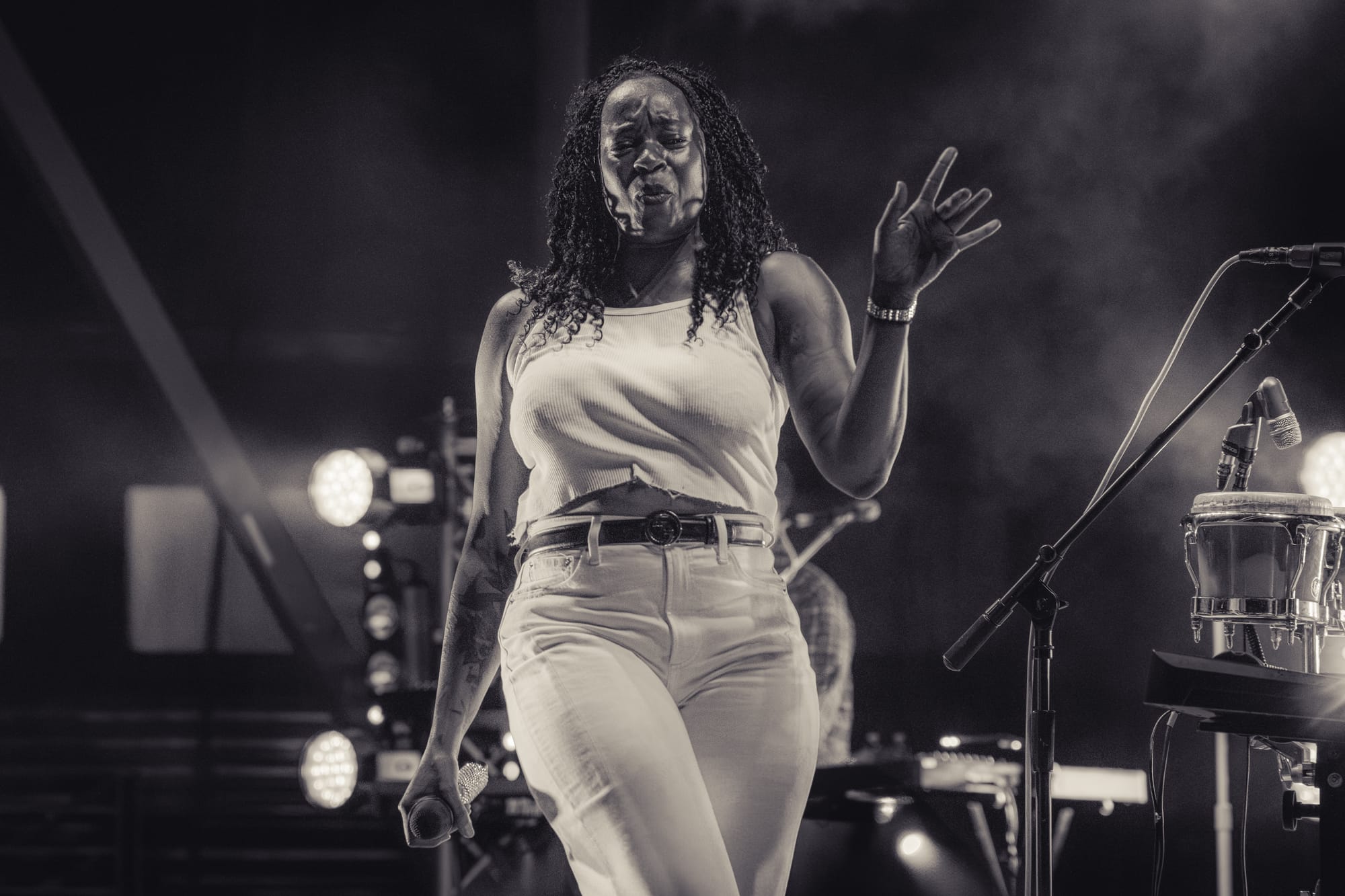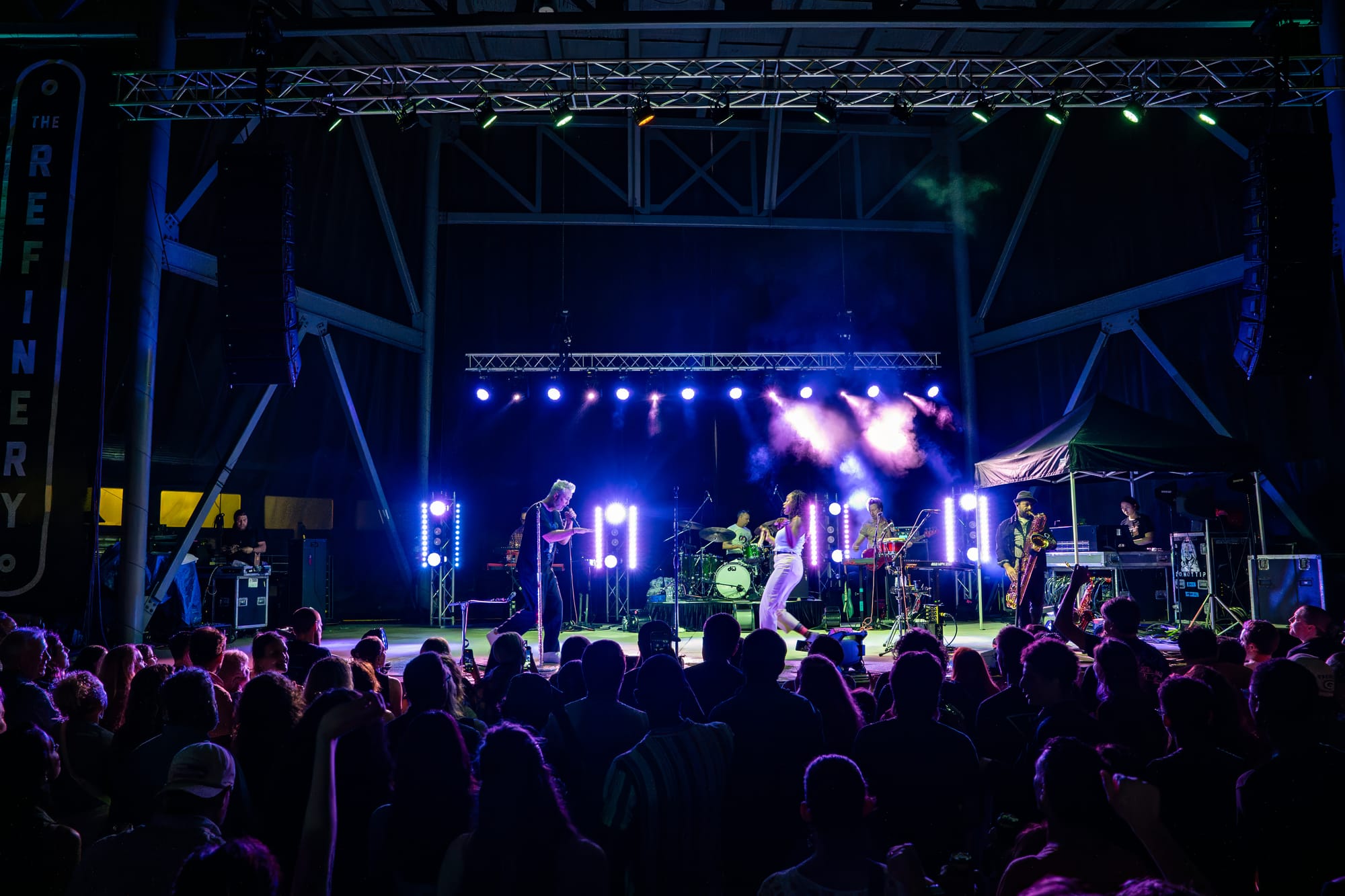 Rain, thunder, and lightning did their best to stop the party. The day didn't look promising in the morning; storms had rolled in, it was raining, and no sun was in sight. By midday, things were looking up. Clear blue skies and a nice breeze to cut the heat. The thought of rain drifted from memory, and the crowd rushed to fill The Refinery field, eagerly awaiting the moment to let it all go and dance their butts off. But Charleston’s weather is fickle, very fickle. Charleston’s own Brave Baby was to be the opening act, but Mother Nature had other plans. A voice rang over the mic and explained that there was incoming lightning and they were delaying the show's start. Eventually, a storm did roll through, ending Brave Baby’s chance to take the stage and forcing concertgoers to take shelter. Again, a voice on the mic assured the crowd that Fitz and the Tantrums would go on if the weather cooperated. Lightning lit up the sky, and a heavy rain began to fall. The Refinery, having a no-reentry policy, made it impossible to shelter in vehicles. Some of the crowd gave up entirely, causing a wave of people to exit the venue. But for those with a little patience and who stuck it out, they were treated to something special! Nearly an hour and a half later, the storms died out, and the crowd that was left began to file out of the venue's sheltered establishments. I was surprised to see that there was still a pretty massive crowd. They were soggy, and the humidity was creeping in, but the open field filled with bodies nonetheless. The mood was not at all diminished by the weather; people were still smiling and eager to party, and we all know Fitz and the Tantrums know how to party!