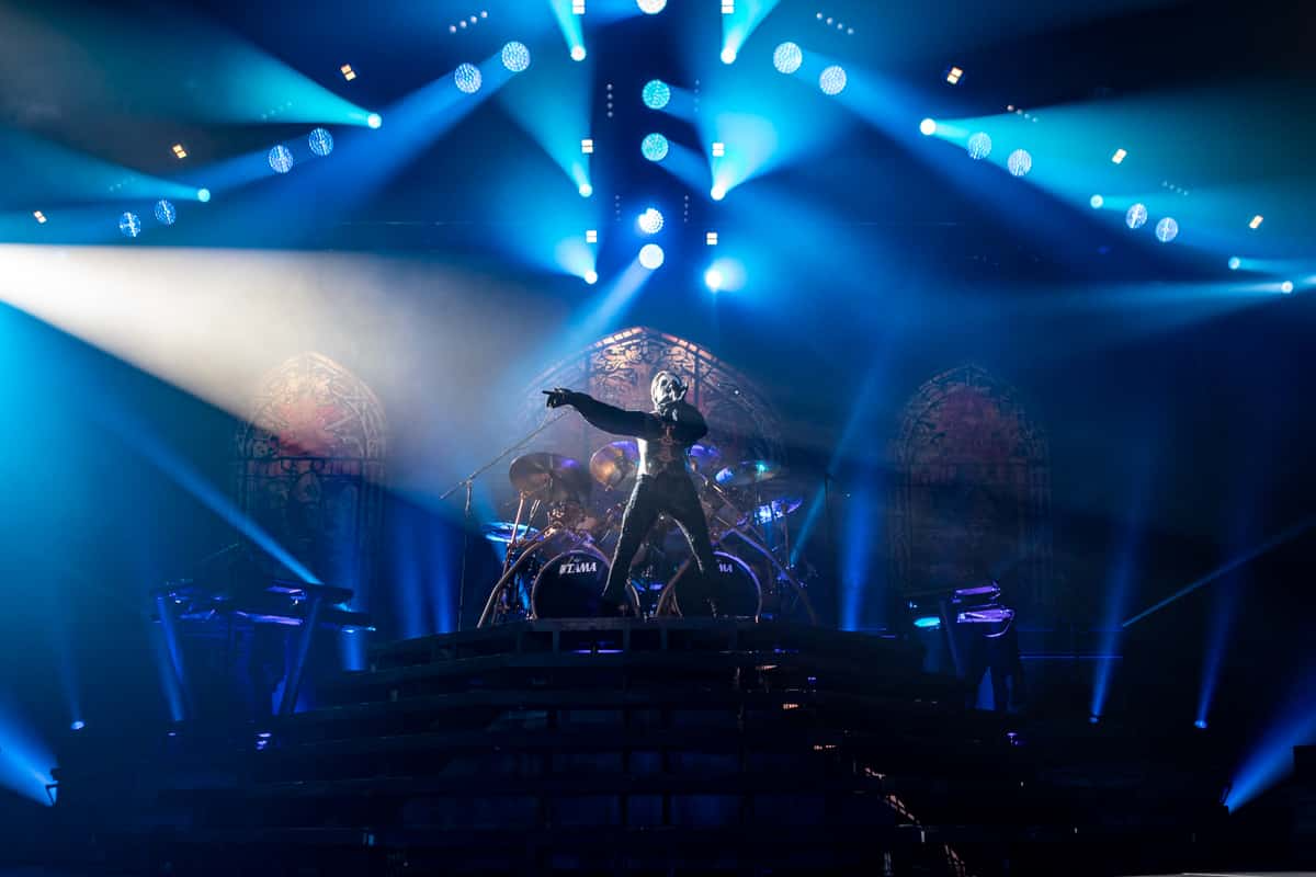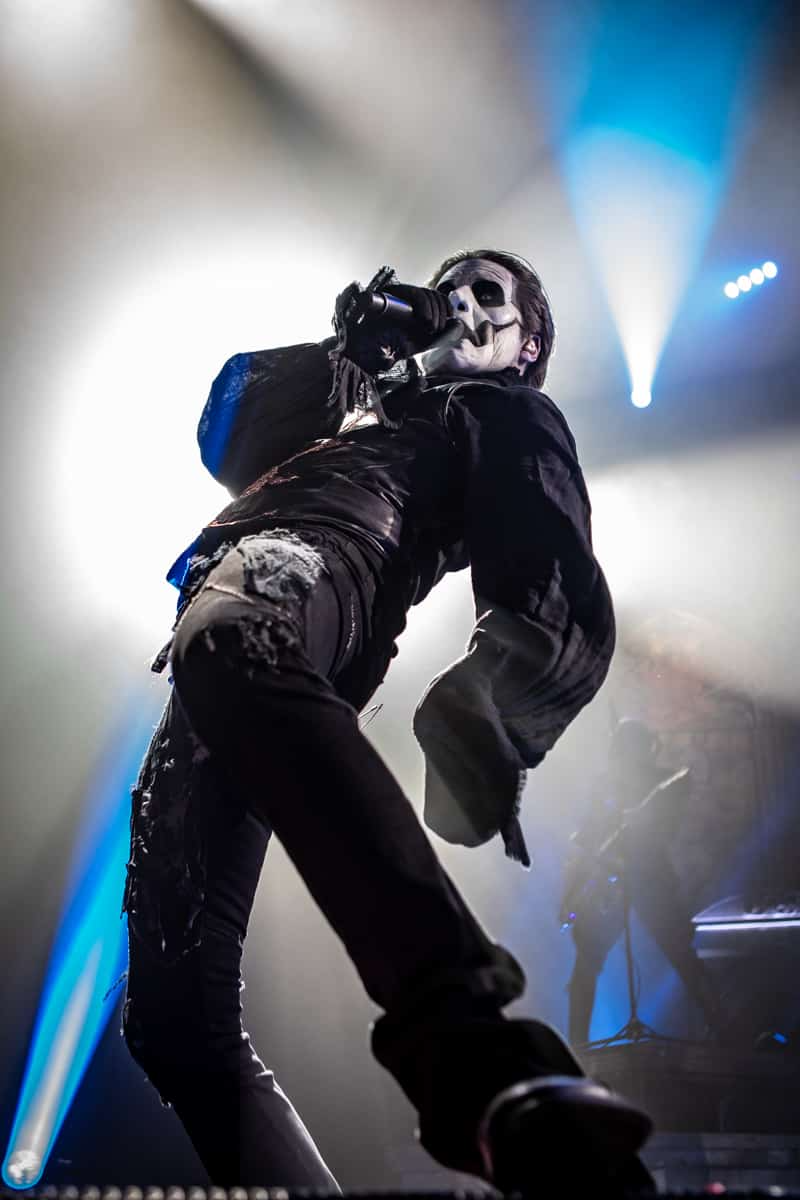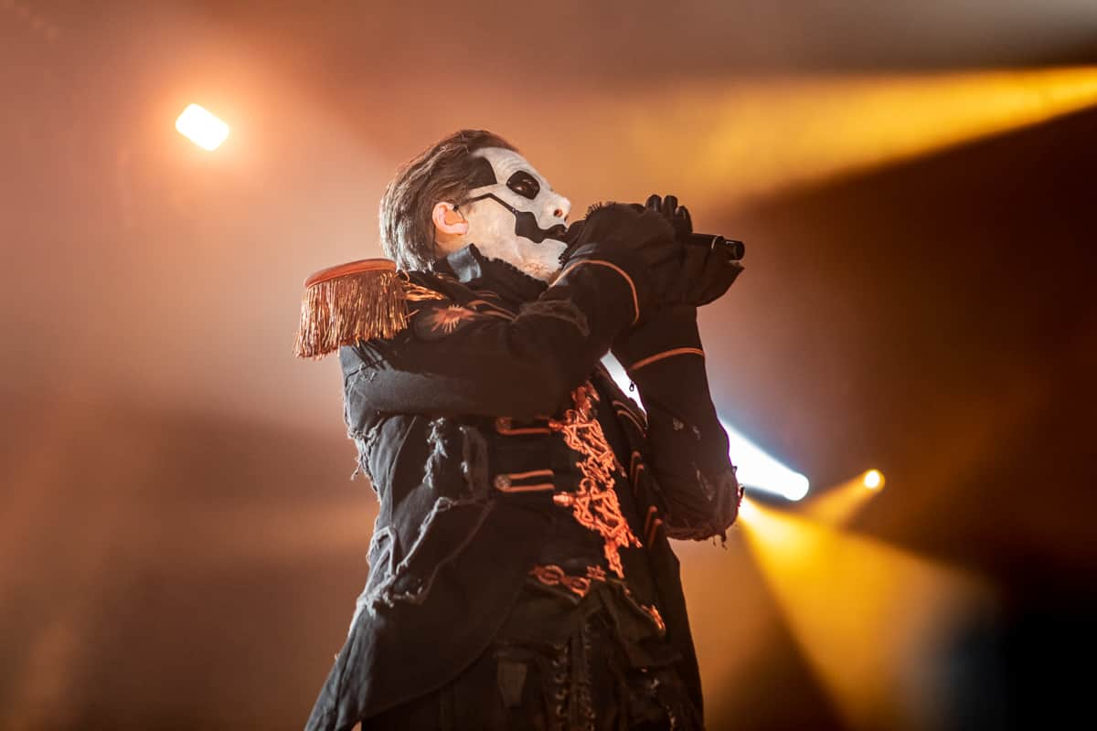 I want to start out by noting the setup. The drums sat about 15’ above the stage on a riser with a wraparound staircase. On either side of this massive staircase were four (two on each side) smaller risers that would play host to Nameless Ghouls and Ghoulettes on keyboards and background vocals. Behind all the platforms were the tops of stone structures, as if the band was playing atop a church, and in the very back, three massive stained-glass windows that featured images of Papa Emeritus. As the stage setup was being completed a massive curtain was raised to the ceiling and then the lights went down. A backlight shown from behind the curtain and the silhouettes of three Nameless Ghouls appeared. Then, the intro to “Kaisarion” began to play and at the first hit of the cymbals they executed a flawless Kabuki Drop and the three Nameless Ghouls strode to the front of the runway. At this moment, I couldn’t help but feel a little overwhelmed. This was one of those “Keep your hands, and feet inside the vehicle at all times because this is going to be one hell of a ride” moments.
