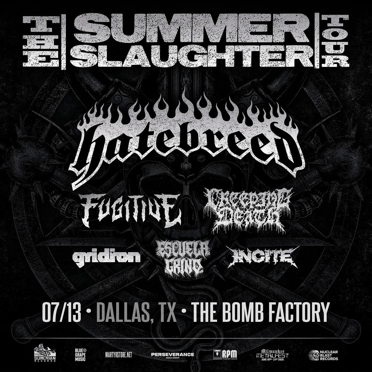 I had the chance to experience one of the heaviest tours in years this past Sunday, and I don't think I'll ever be able to get over the post-concert depression. Hatebreed gave a rebirth to The Summer Slaughter Tour, and what a slaughter it was. The Dallas, TX date incorporated a blend of hardcore, death metal, and dare I say punk and nu-metal to The Bomb Factory in Deep Ellum. Accompanied by Incite, Escuela Grind, Gridiron, Creeping Death, and Fugitive, fans in attendance were able to have the time of their life in the best way possible.