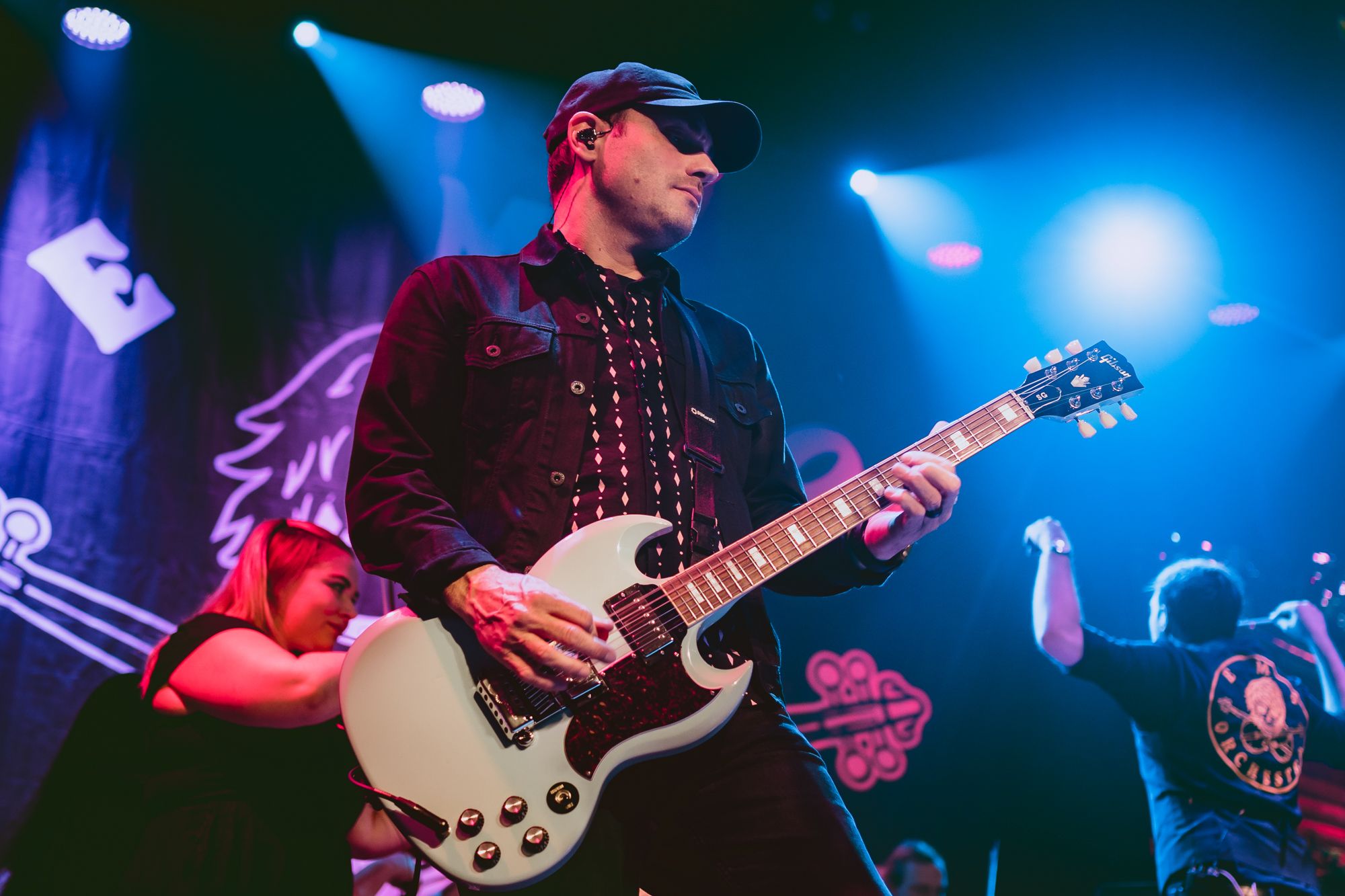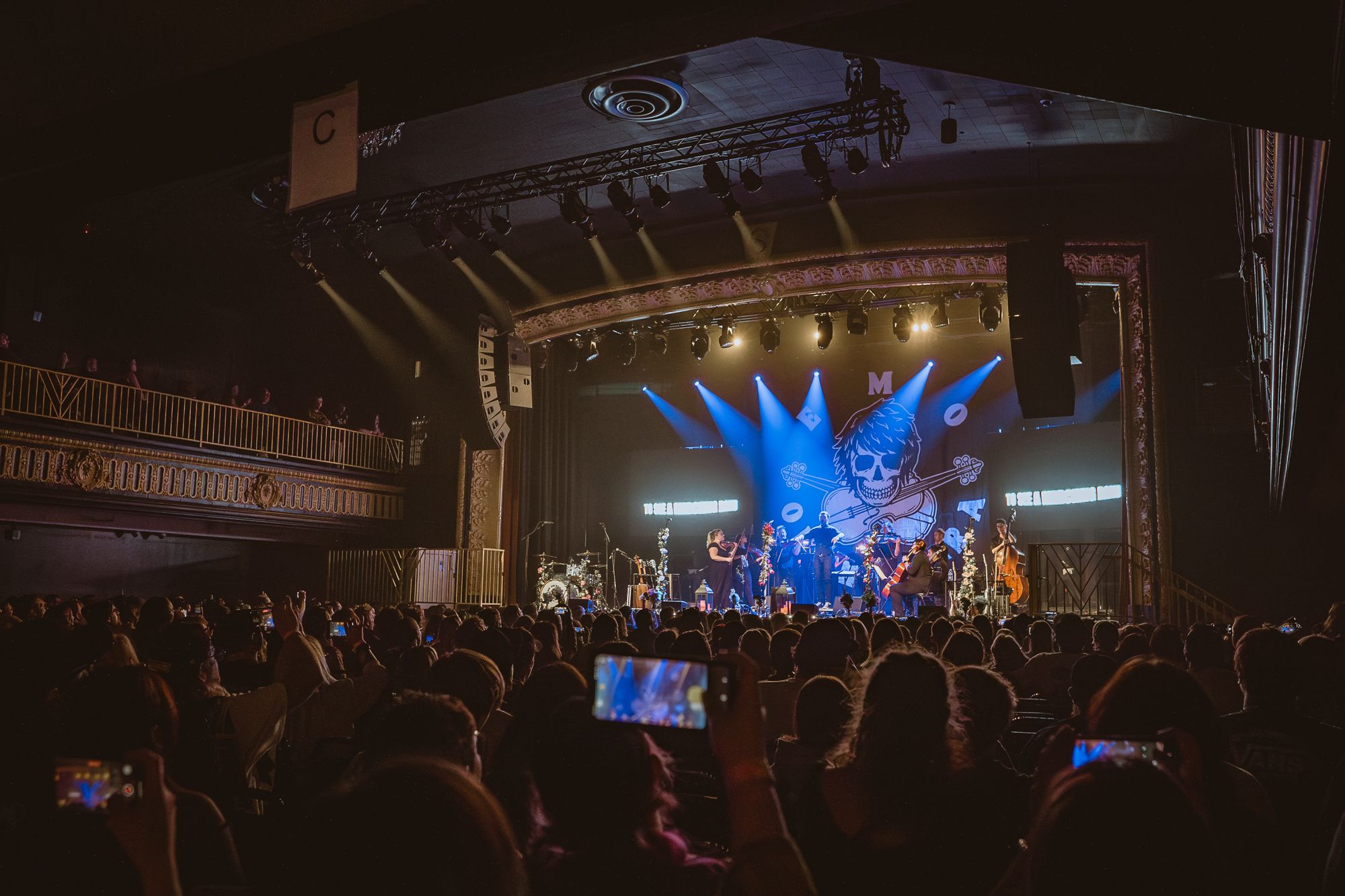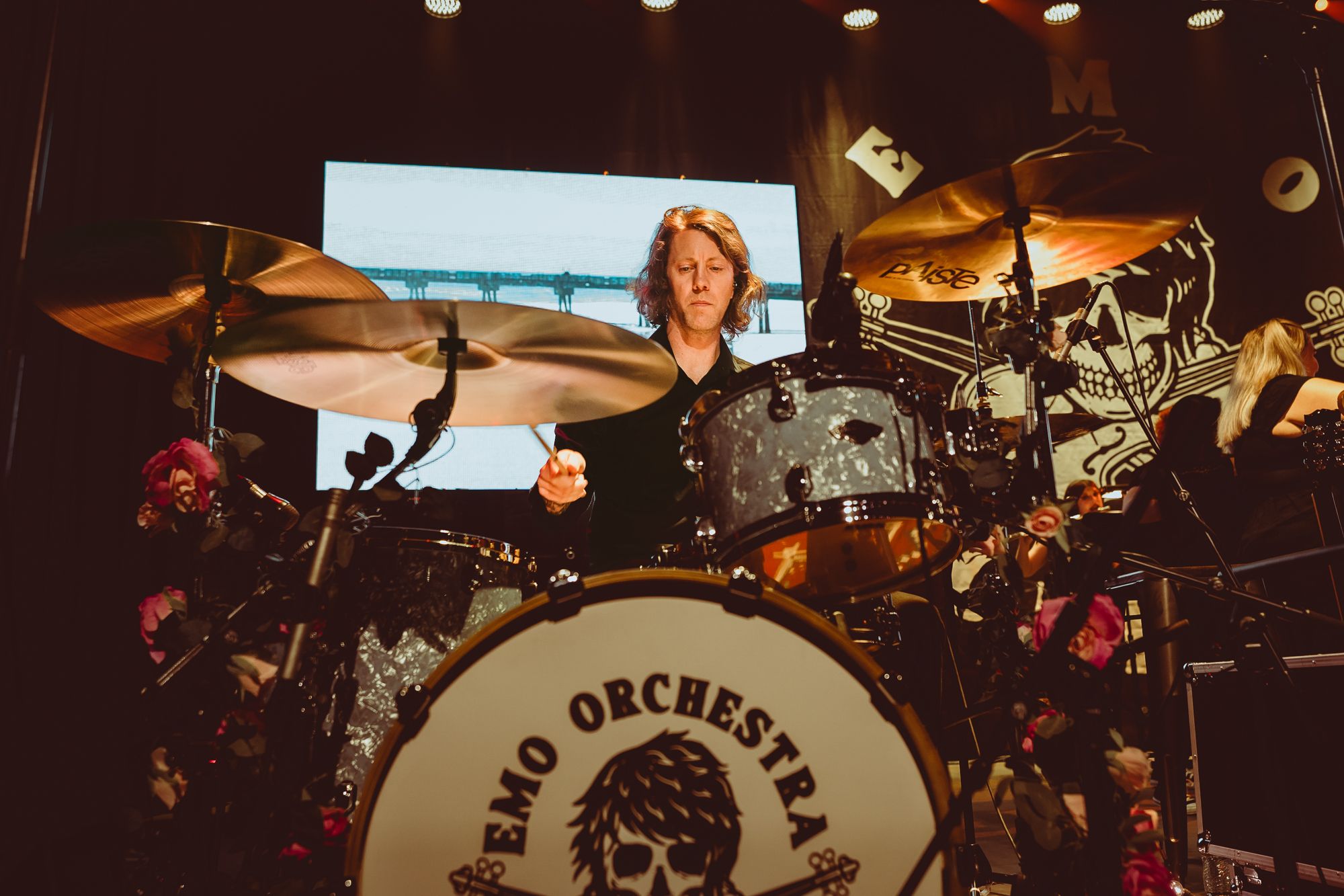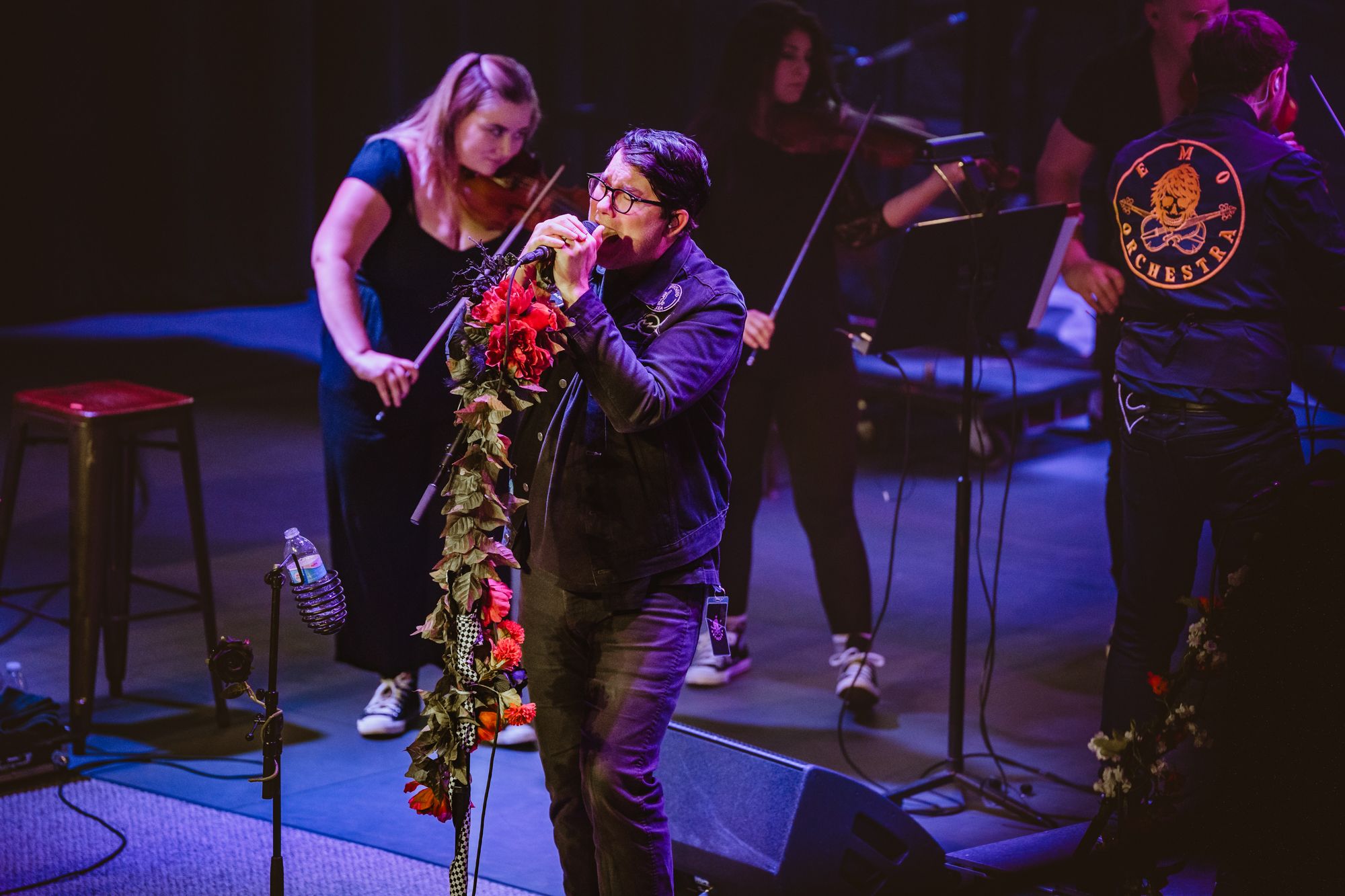 The setting was a little different than what I’m used to at The Admiral. Where I’m used to seeing a sea of kids moshing and crowd surfers, was fully seated. The stage was mood lit with candles. The mic stands and edge of the stage decorated with lanterns and candles.. A large Emo orchestra banner hung at the back of the stage behind a half circle of stringed instruments.