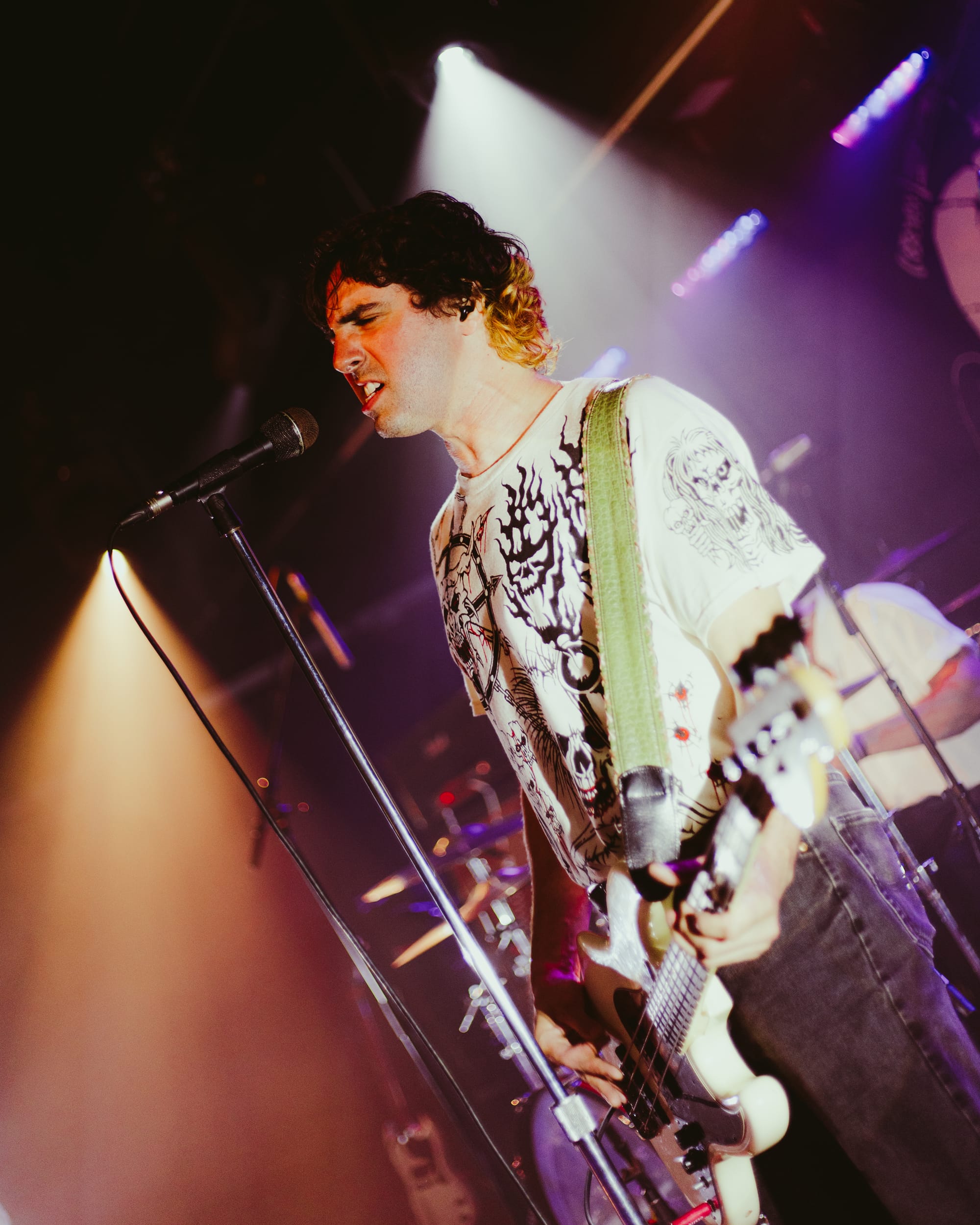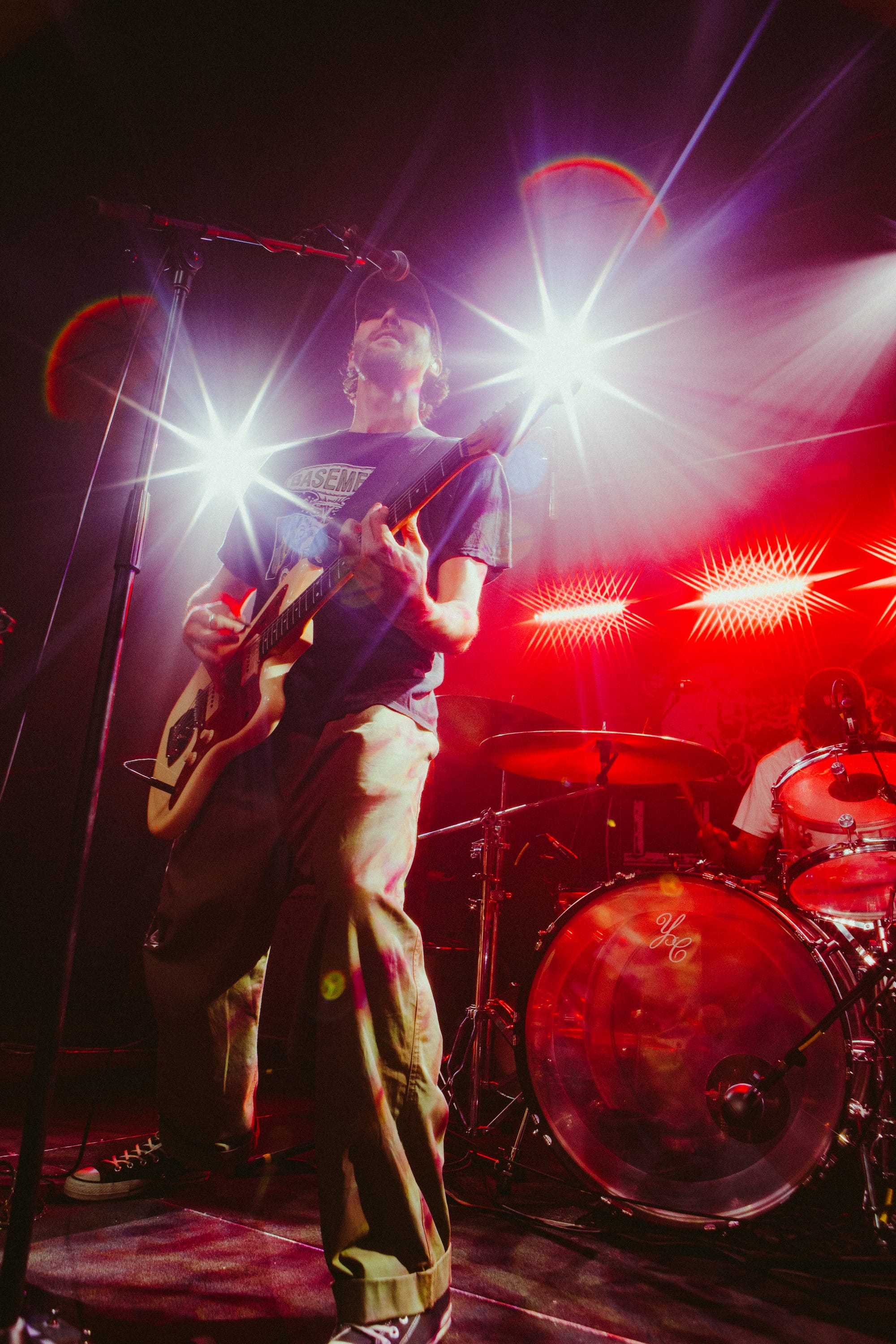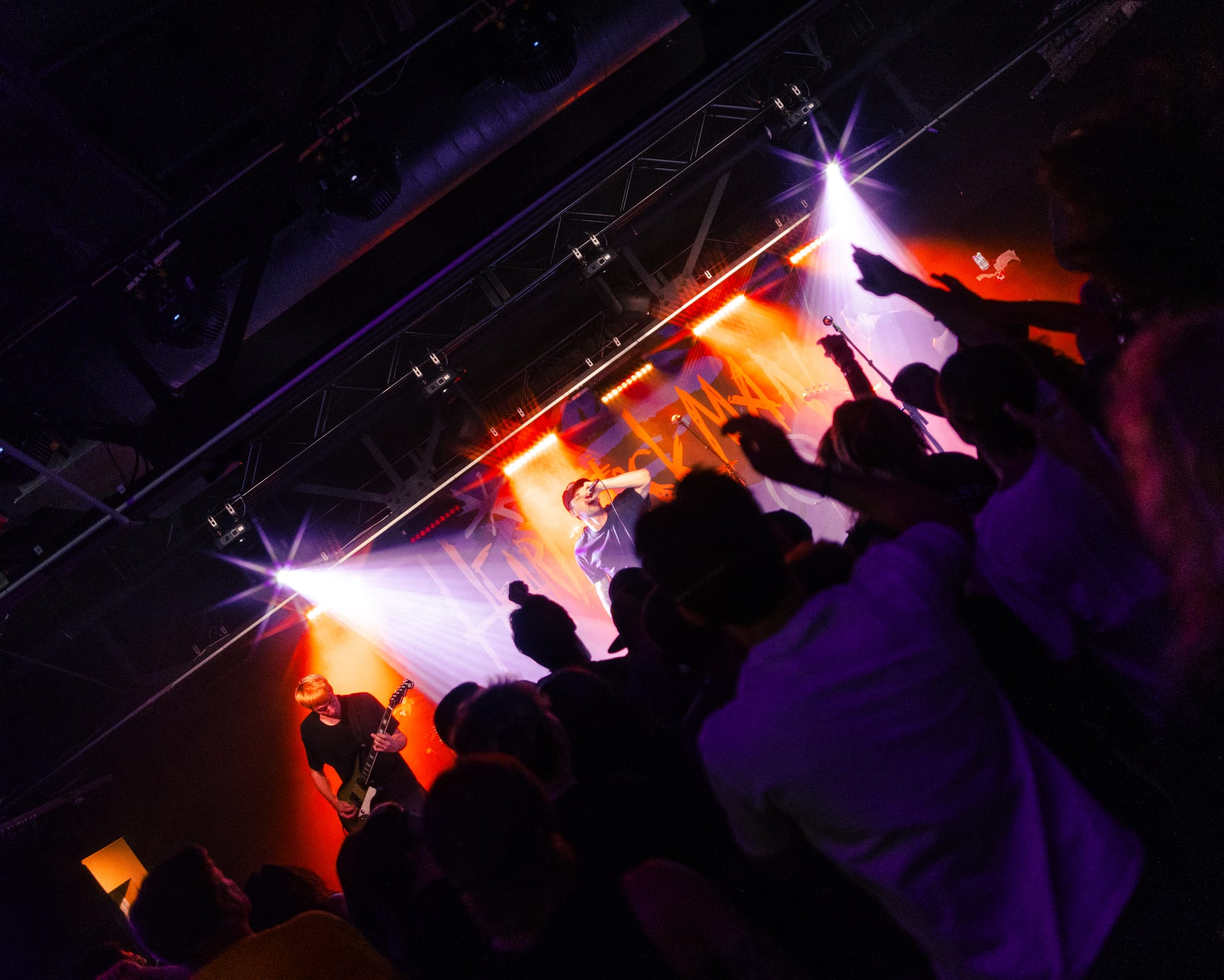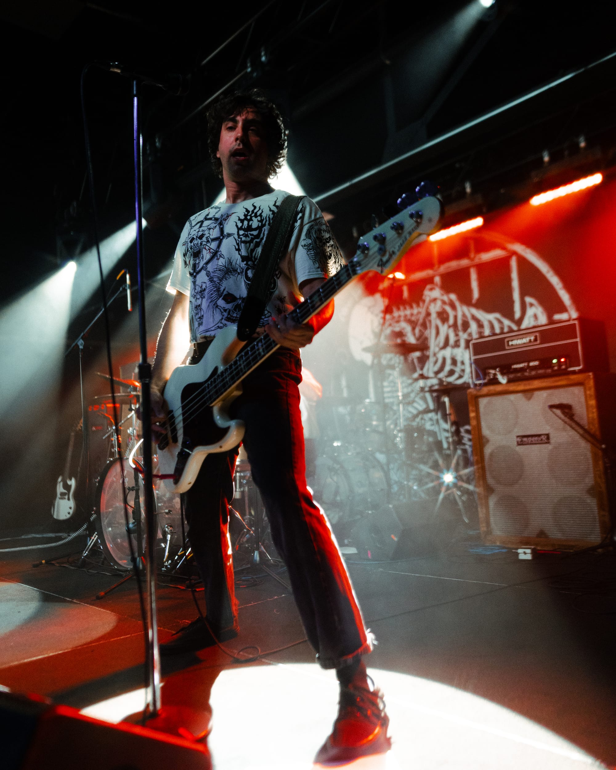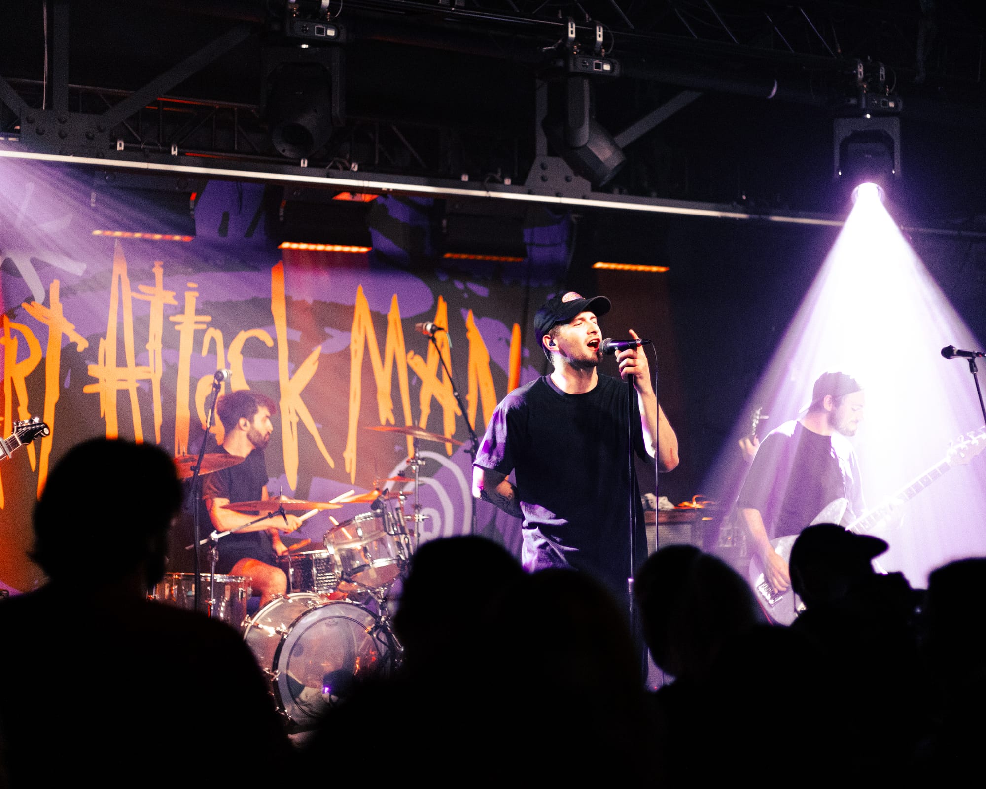 For headliners Heart Attack Man, the sound and lyrics of their new album touch on topics like anti-AI usage in music and battling mental struggles while also having moments that are lighter and more upbeat—classic Heart Attack Man “fun” music. Overall, their new album’s imagery and story come together in their live performance. This holds true in their production as well, as their lighting design is almost strictly purple and orange, just as it is mirrored in their album cover.