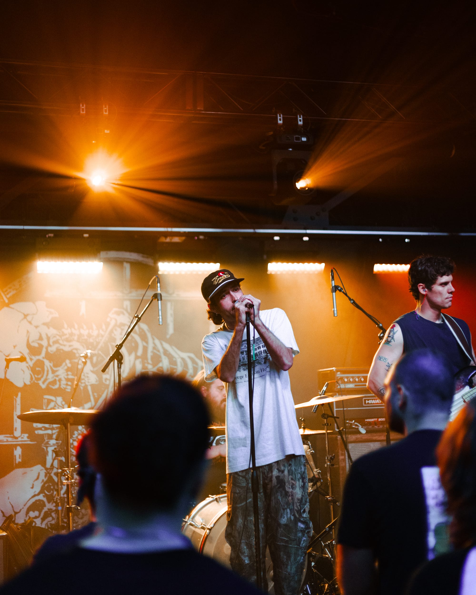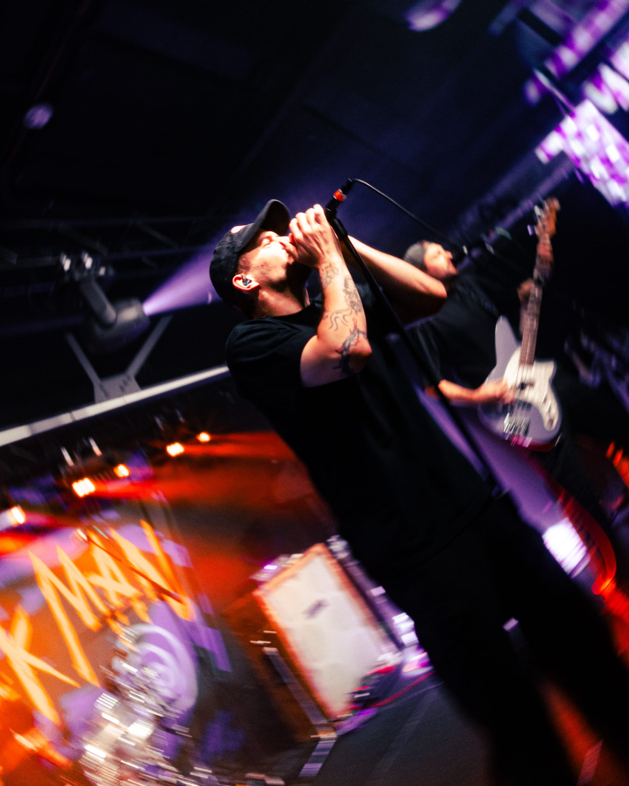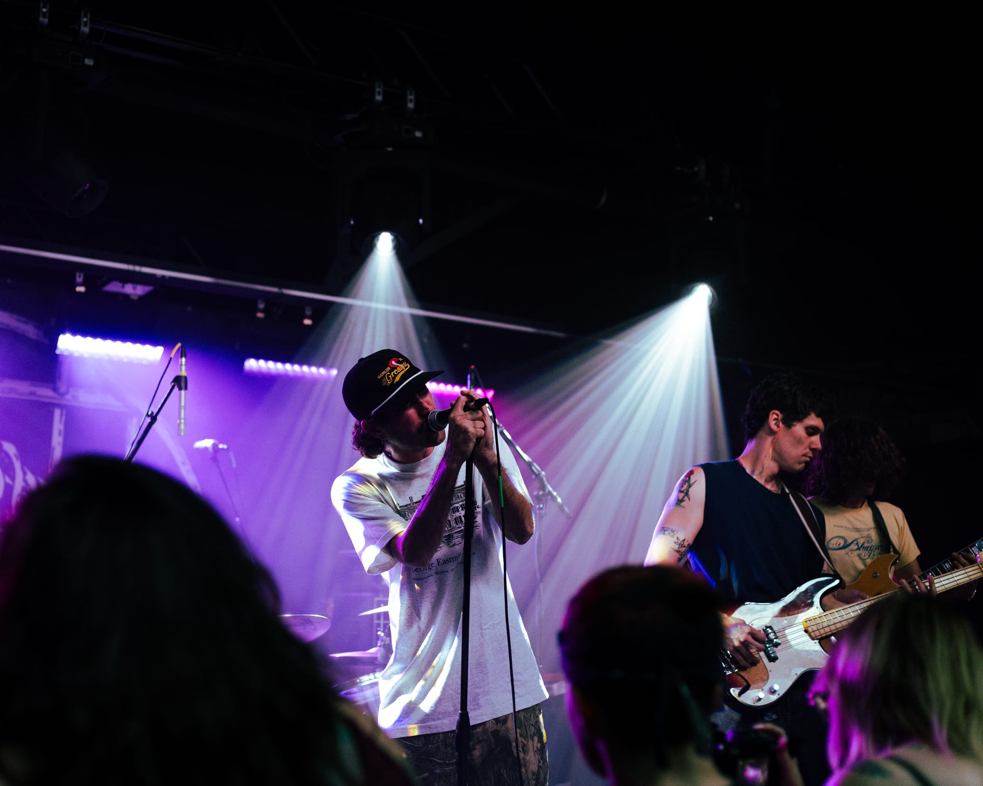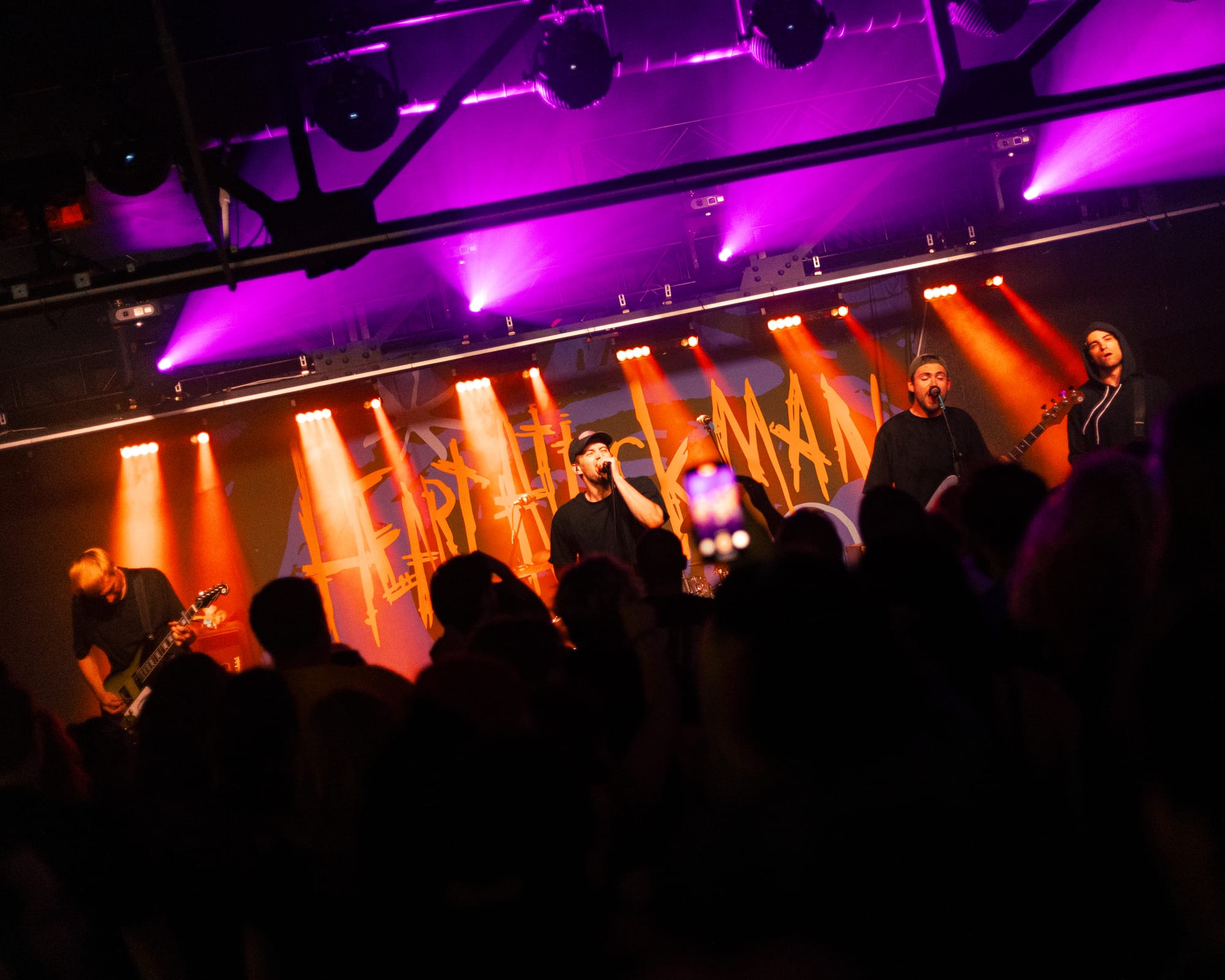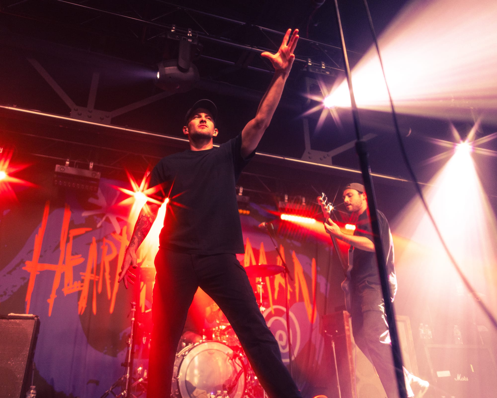 For headliners Heart Attack Man, the sound and lyrics of their new album touch on topics like anti-AI usage in music and battling mental struggles while also having moments that are lighter and more upbeat—classic Heart Attack Man “fun” music. Overall, their new album’s imagery and story come together in their live performance. This holds true in their production as well, as their lighting design is almost strictly purple and orange, just as it is mirrored in their album cover.