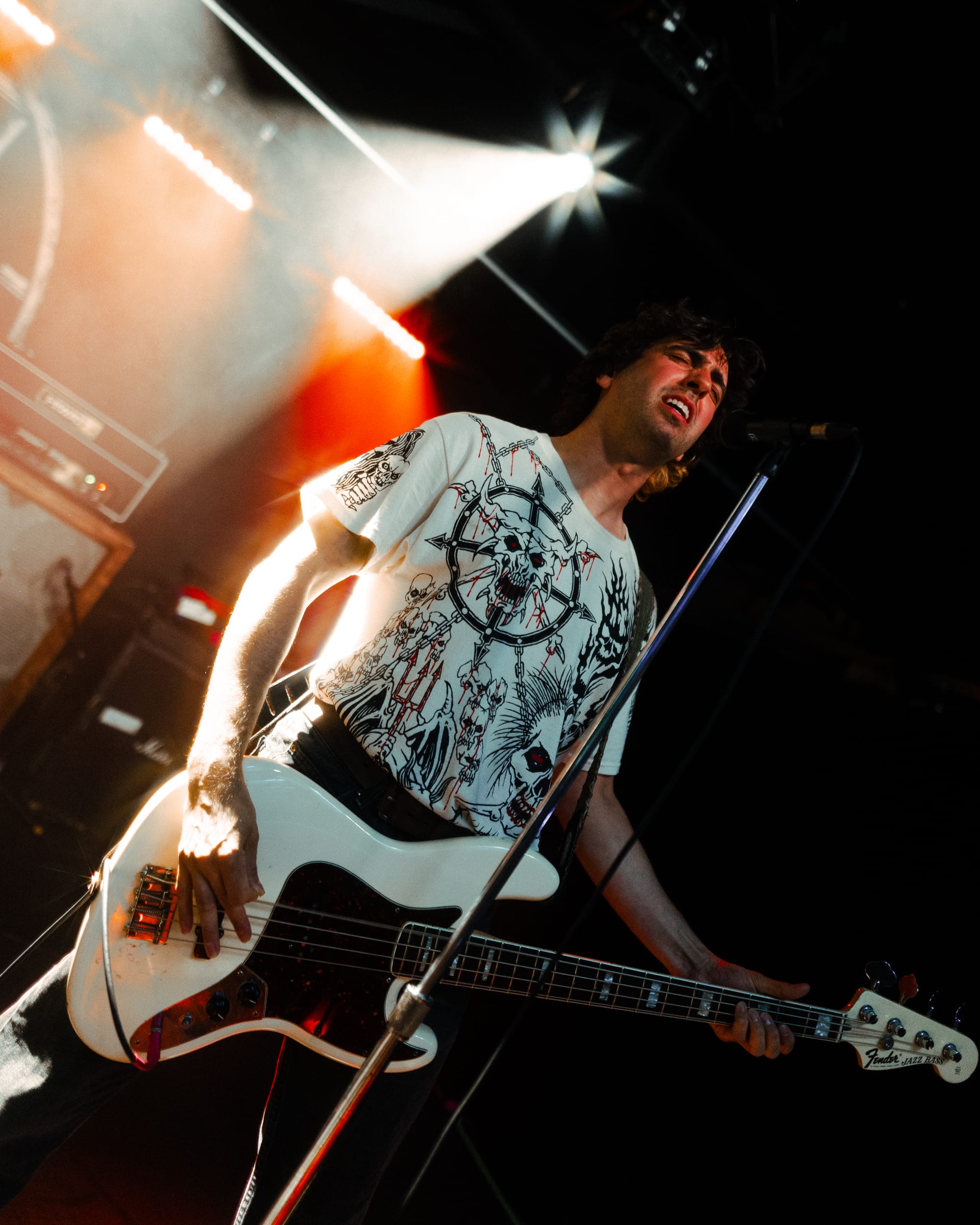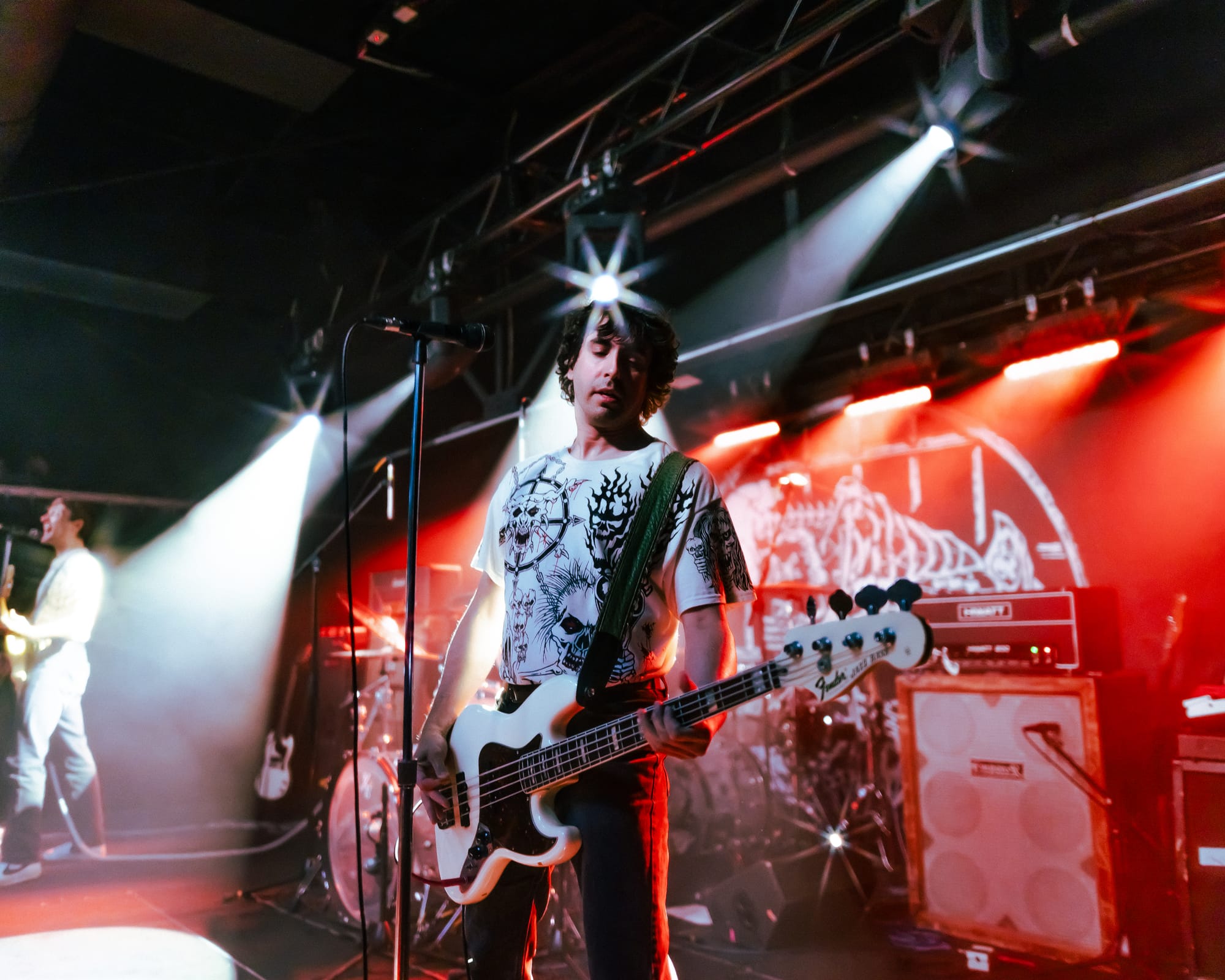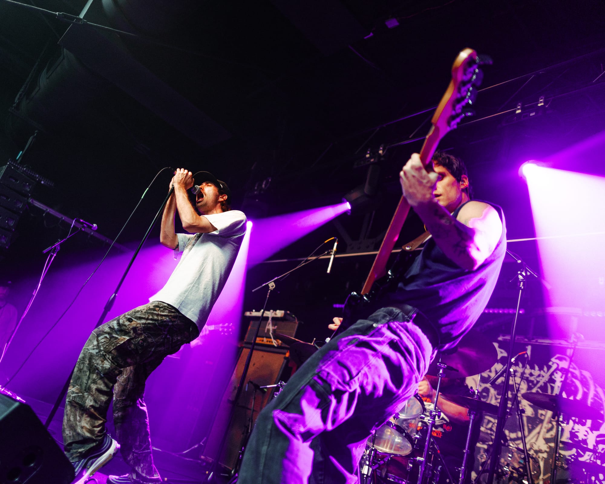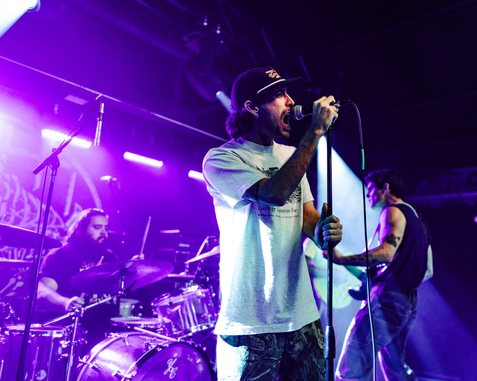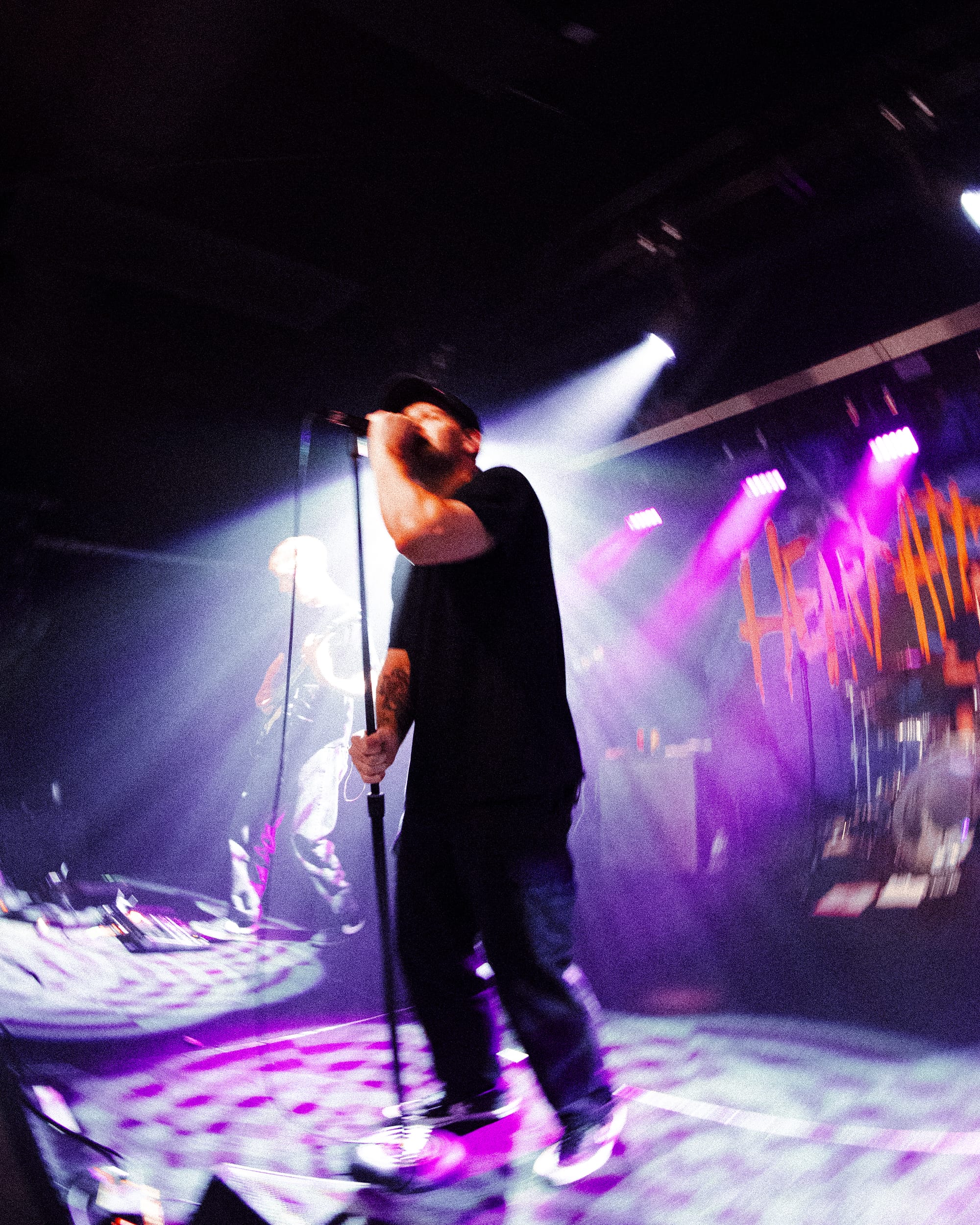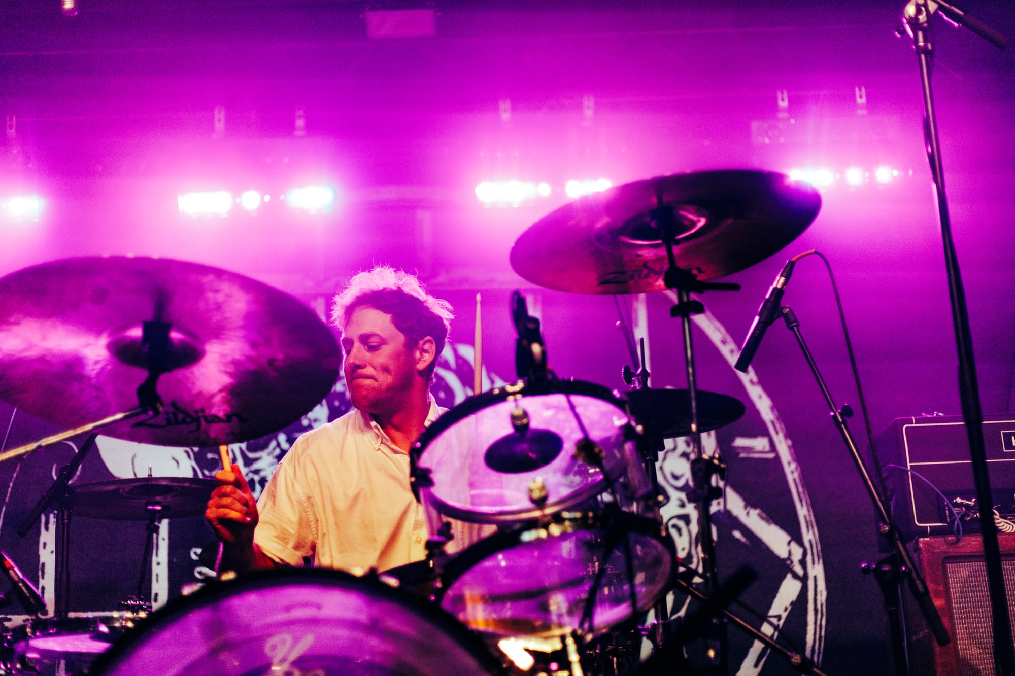 For headliners Heart Attack Man, the sound and lyrics of their new album touch on topics like anti-AI usage in music and battling mental struggles while also having moments that are lighter and more upbeat—classic Heart Attack Man “fun” music. Overall, their new album’s imagery and story come together in their live performance. This holds true in their production as well, as their lighting design is almost strictly purple and orange, just as it is mirrored in their album cover.