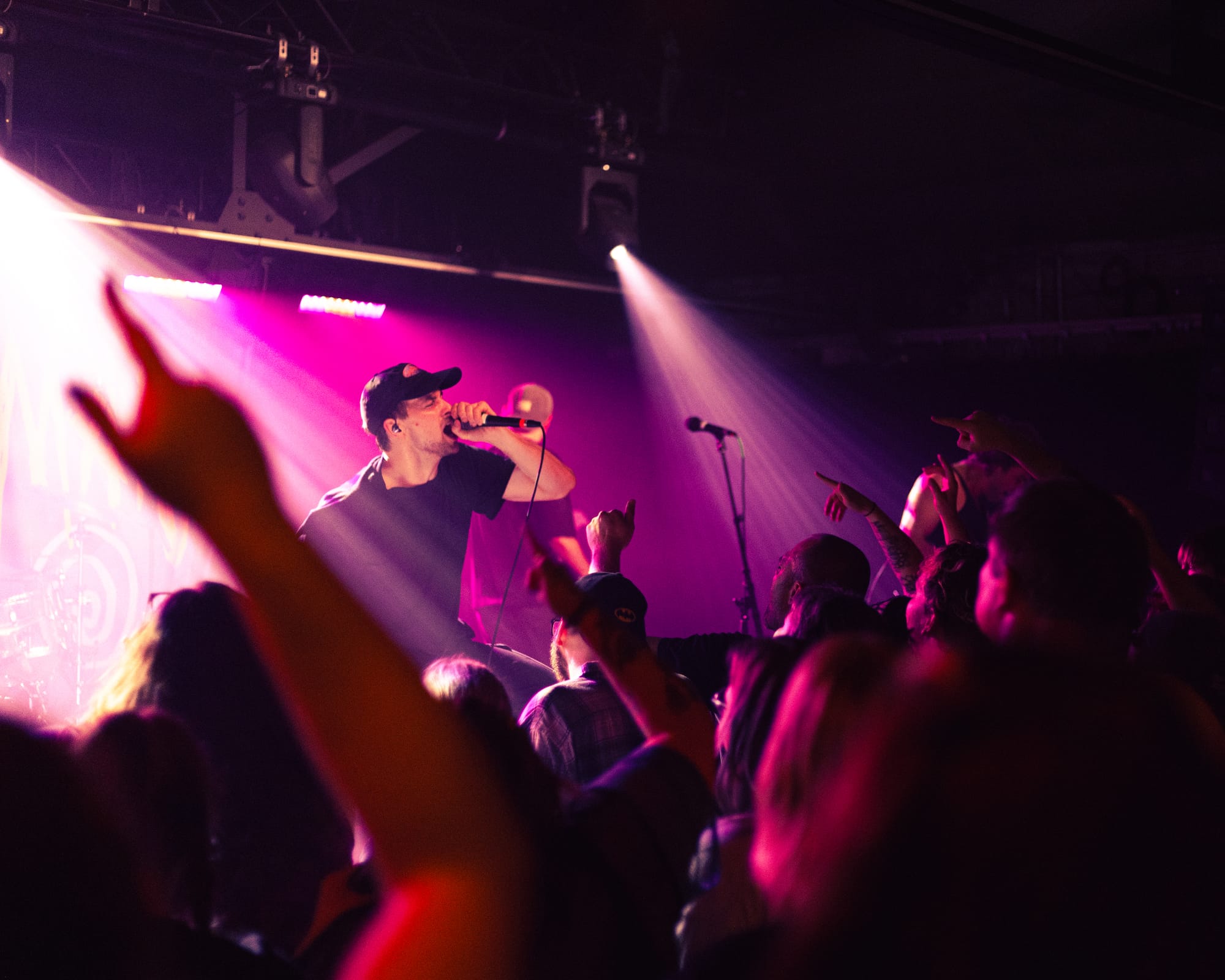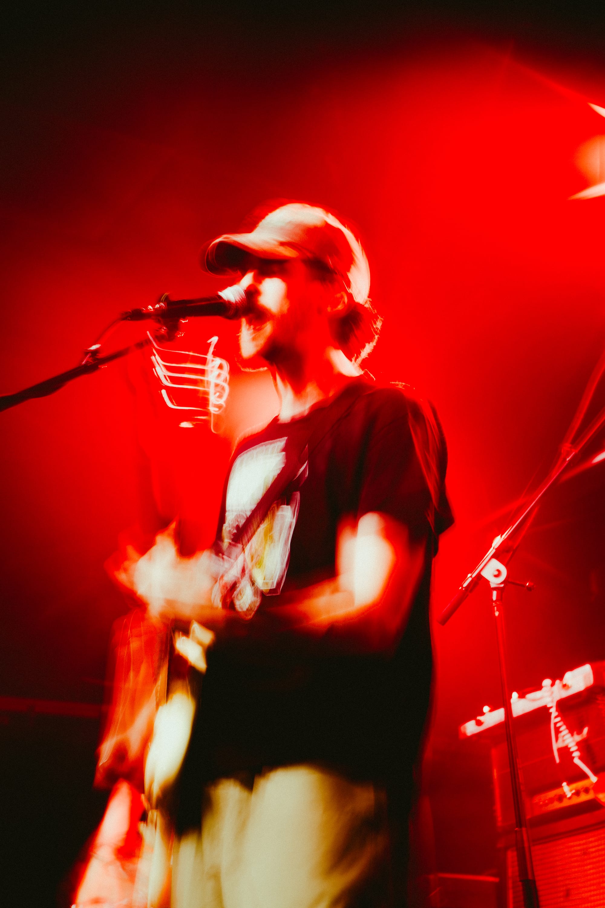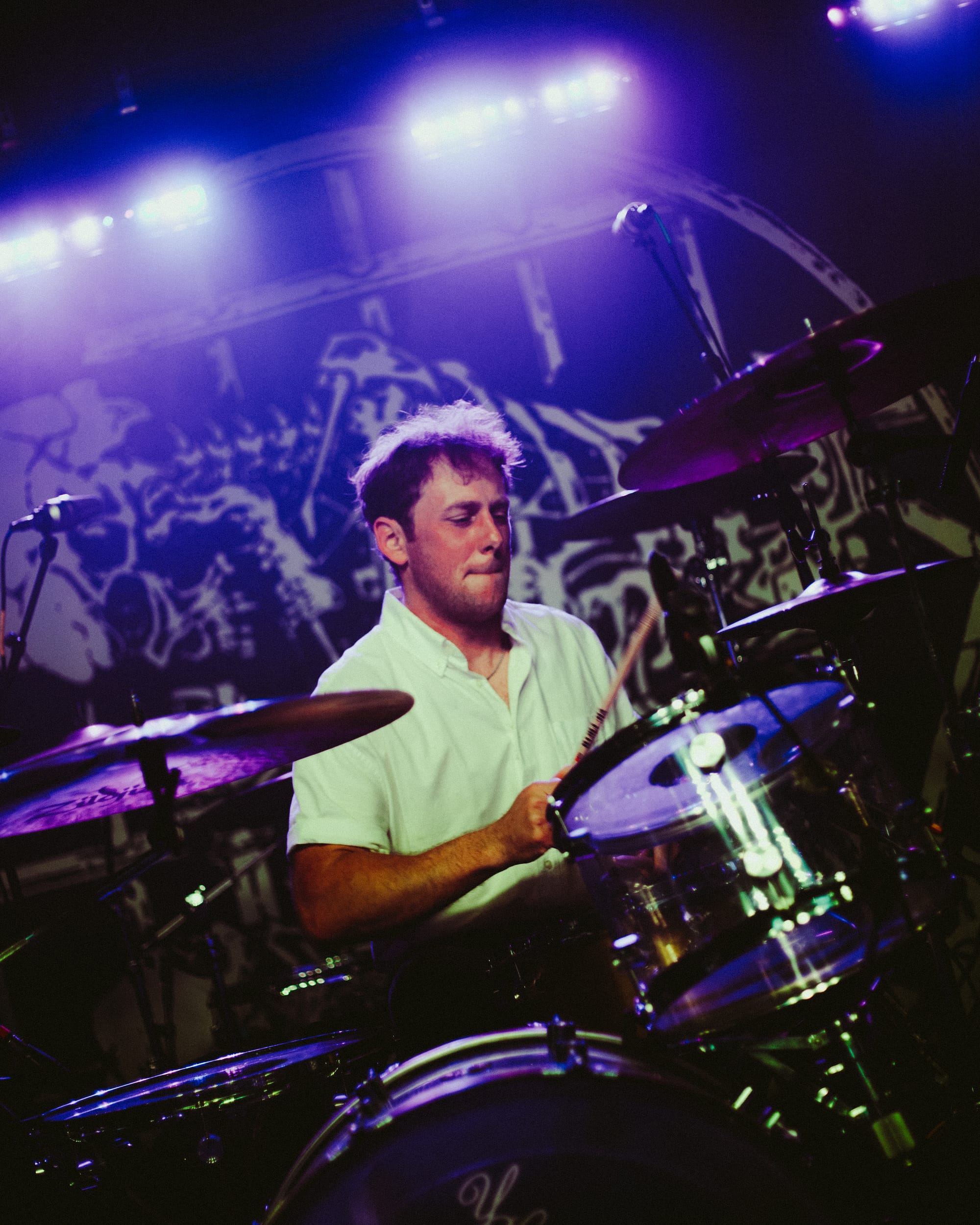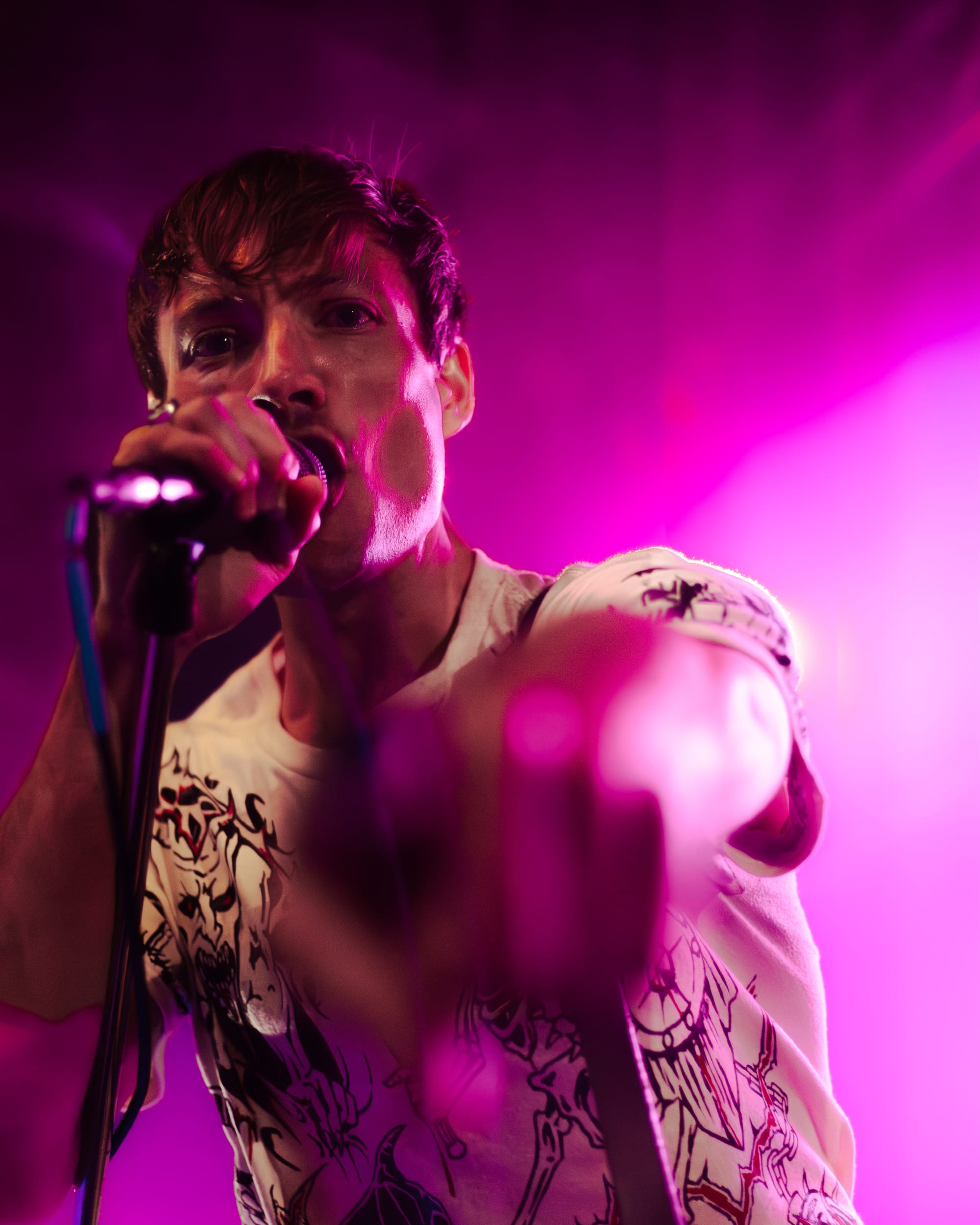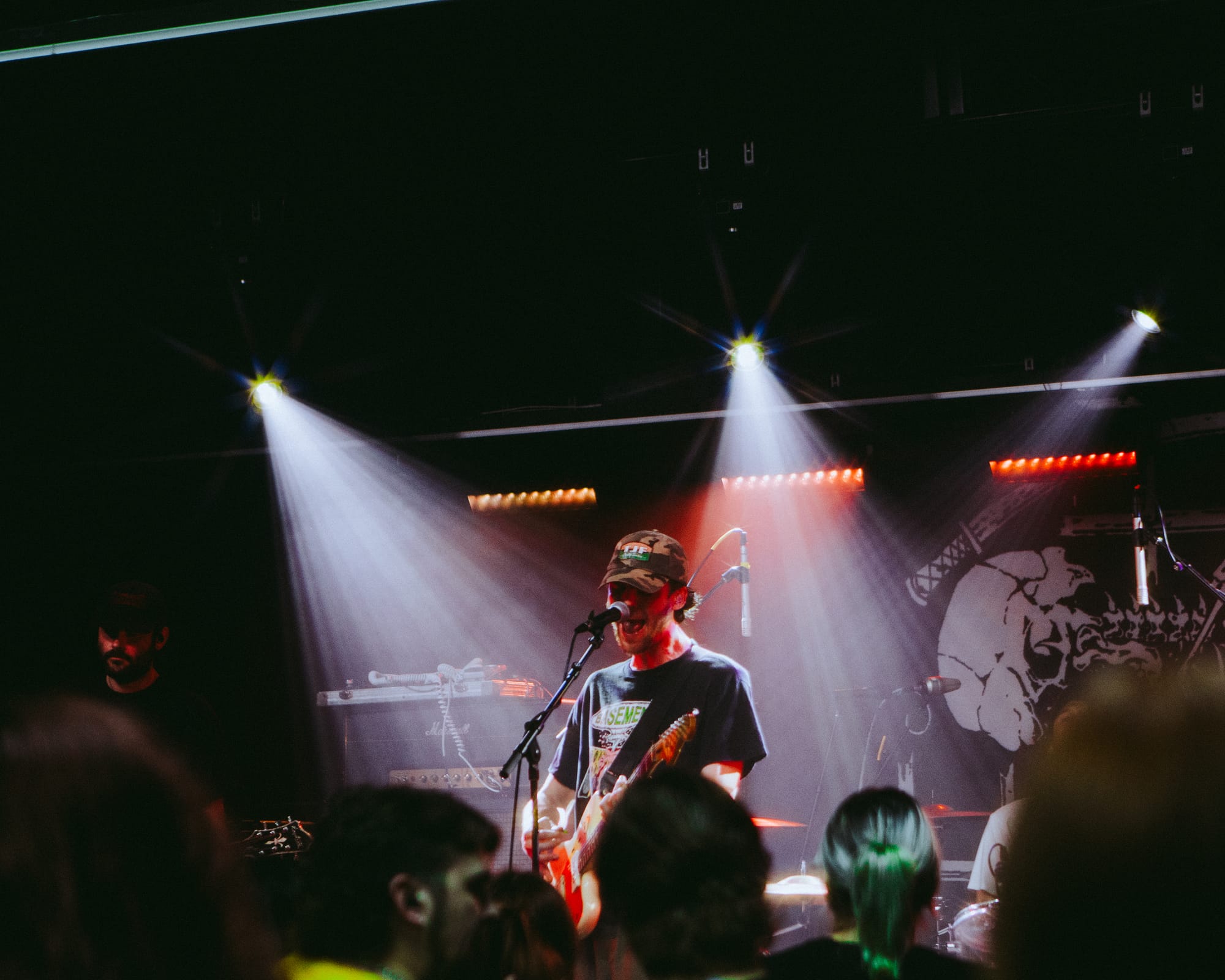 For headliners Heart Attack Man, the sound and lyrics of their new album touch on topics like anti-AI usage in music and battling mental struggles while also having moments that are lighter and more upbeat—classic Heart Attack Man “fun” music. Overall, their new album’s imagery and story come together in their live performance. This holds true in their production as well, as their lighting design is almost strictly purple and orange, just as it is mirrored in their album cover.