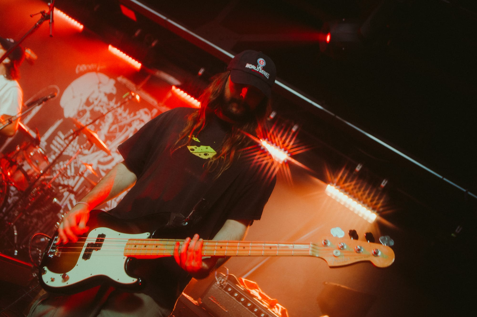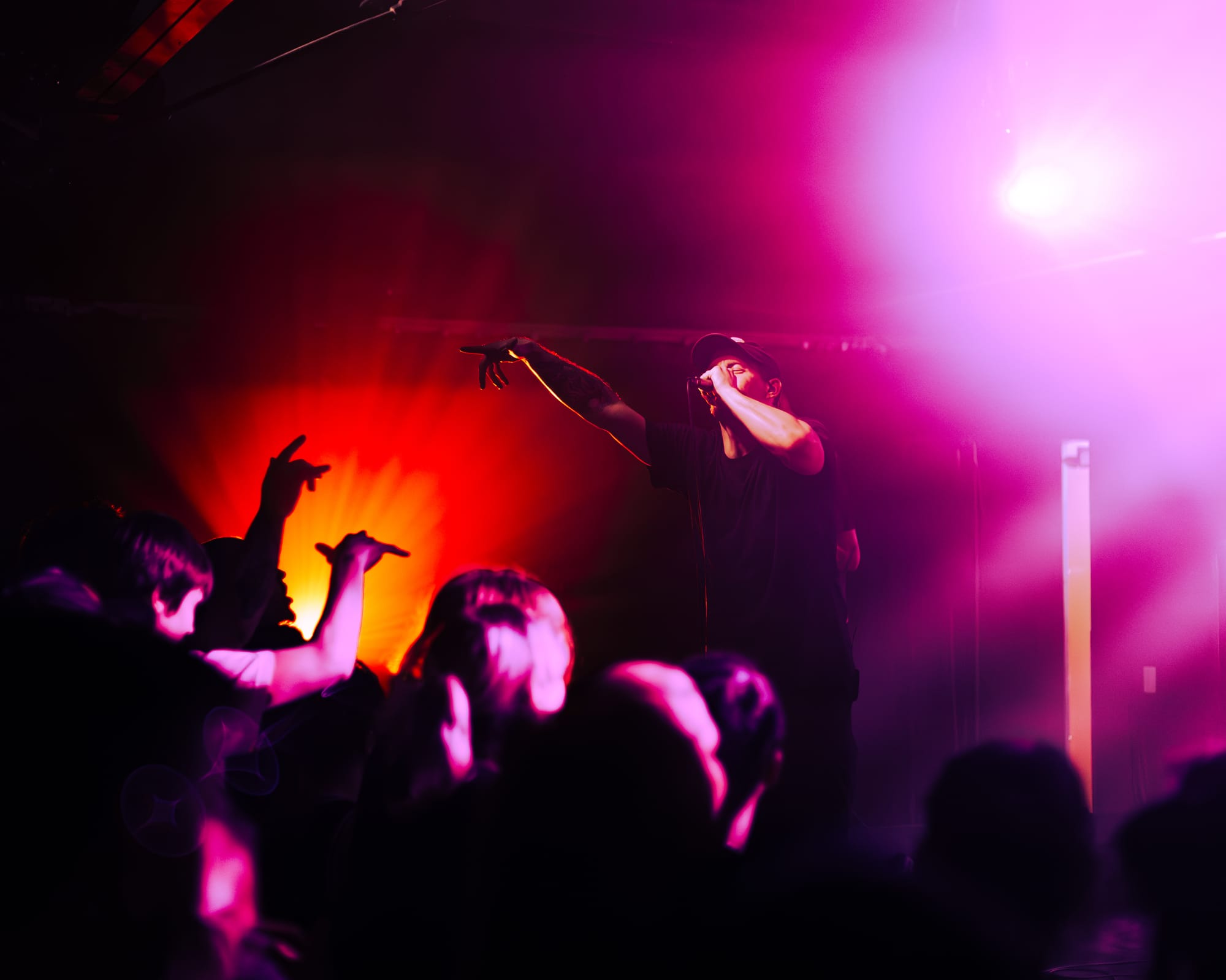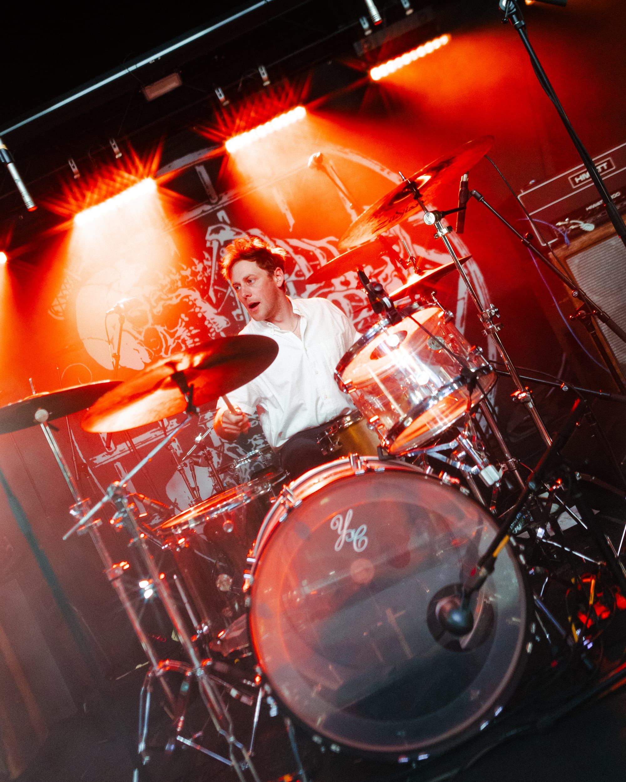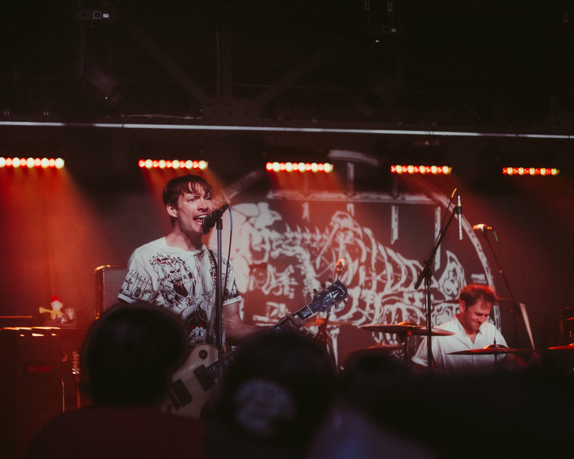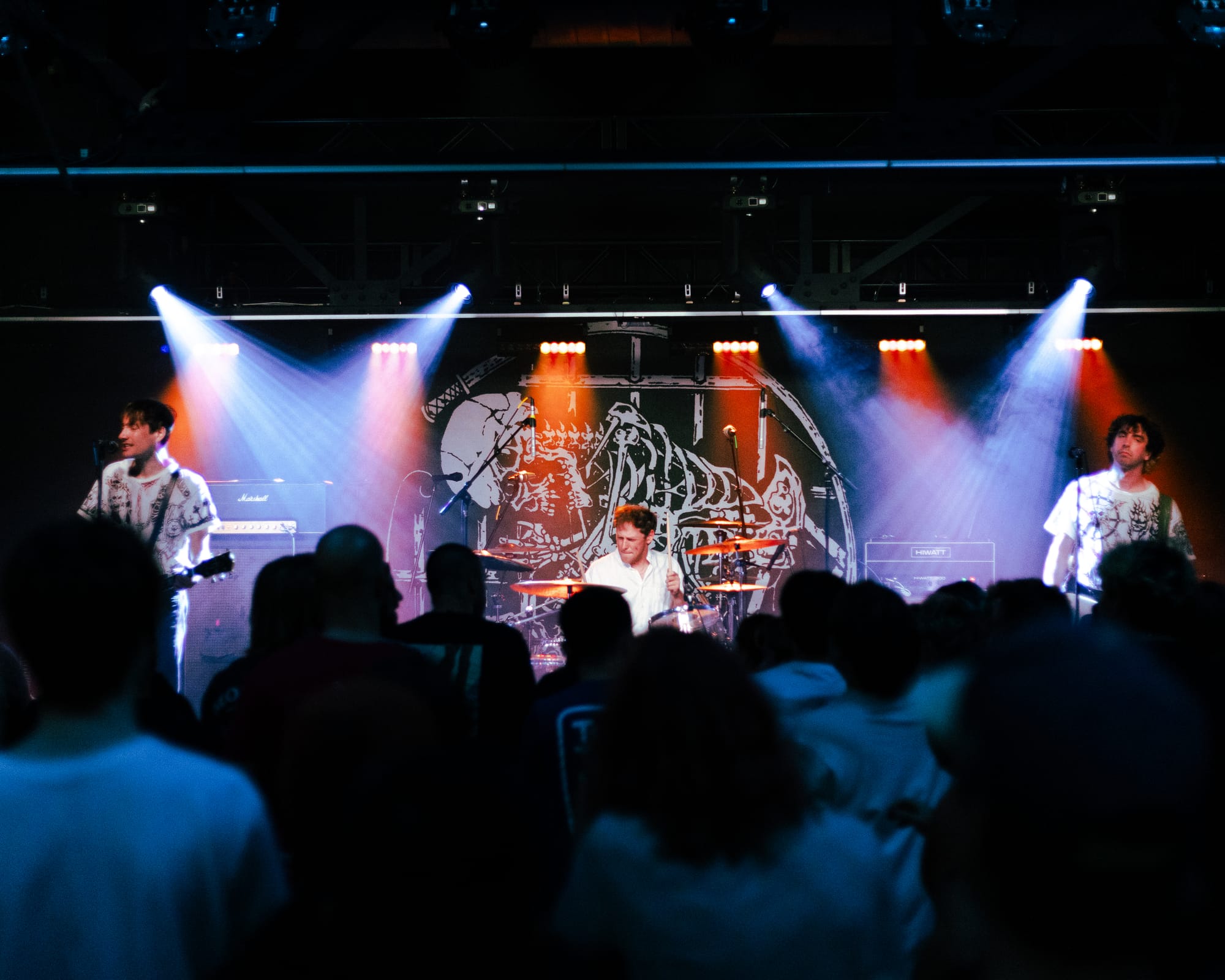 For headliners Heart Attack Man, the sound and lyrics of their new album touch on topics like anti-AI usage in music and battling mental struggles while also having moments that are lighter and more upbeat—classic Heart Attack Man “fun” music. Overall, their new album’s imagery and story come together in their live performance. This holds true in their production as well, as their lighting design is almost strictly purple and orange, just as it is mirrored in their album cover.