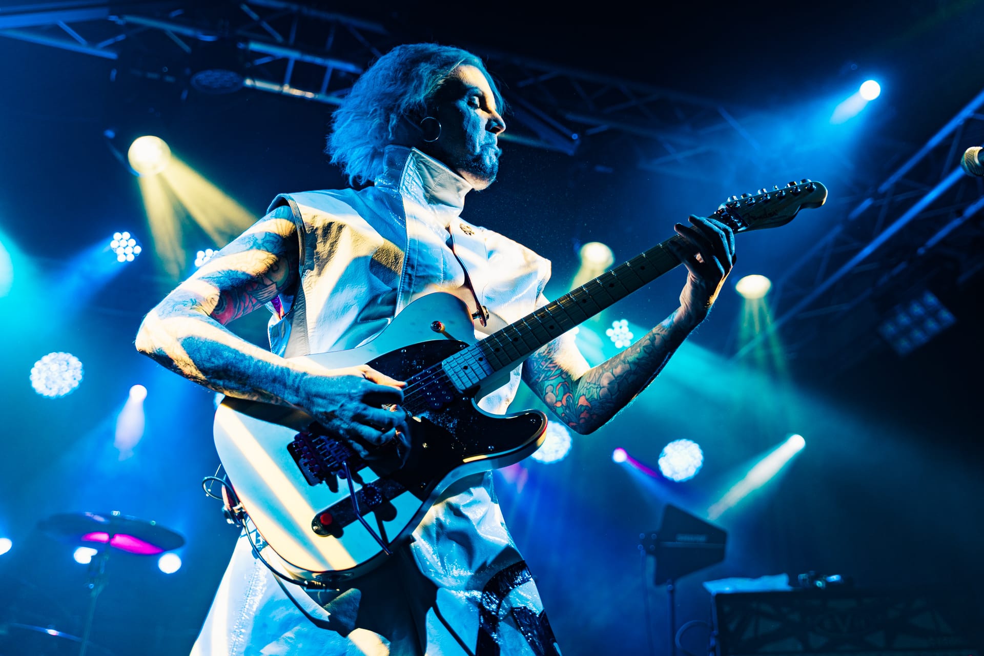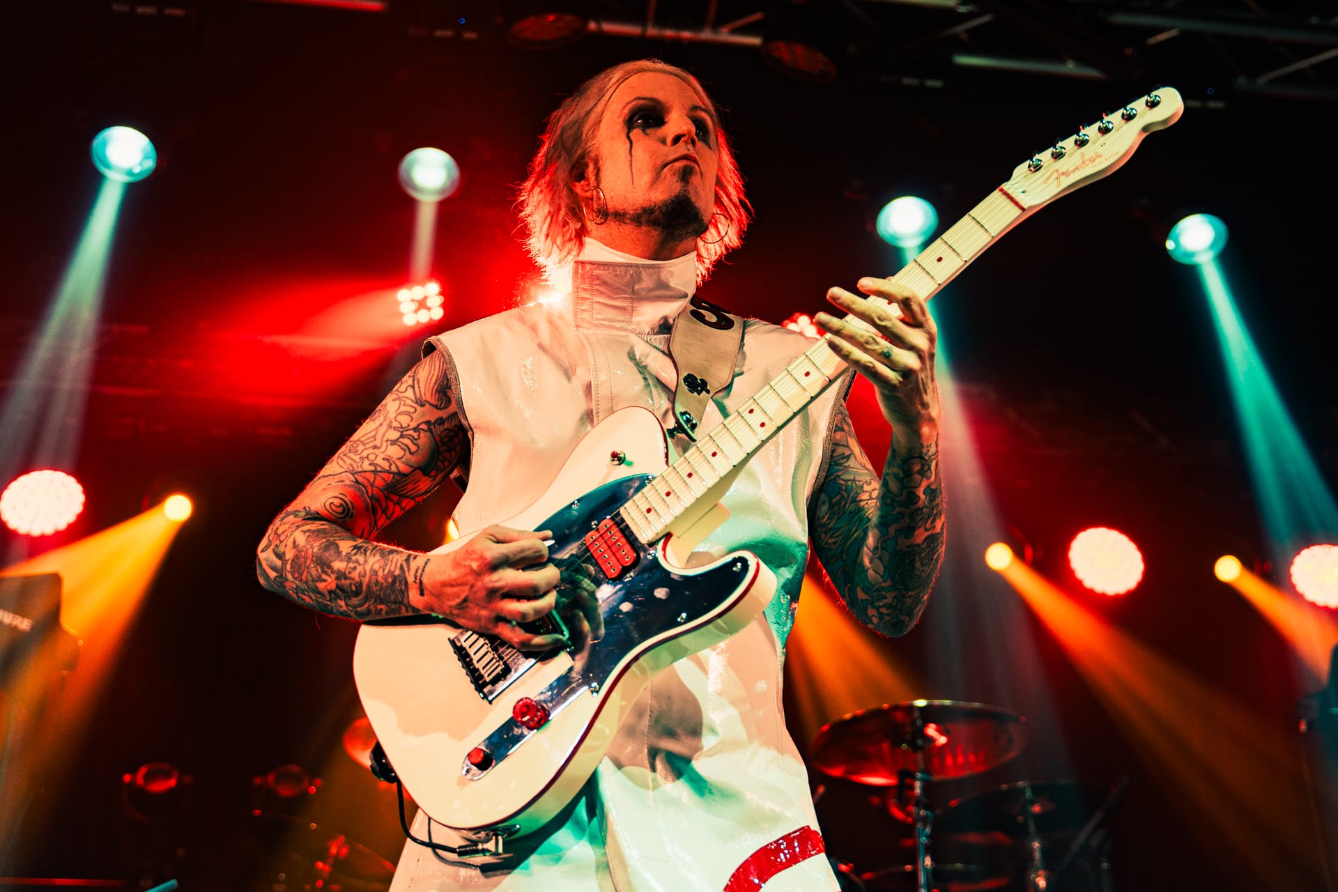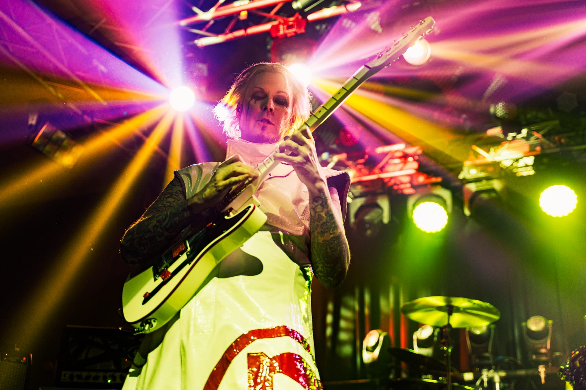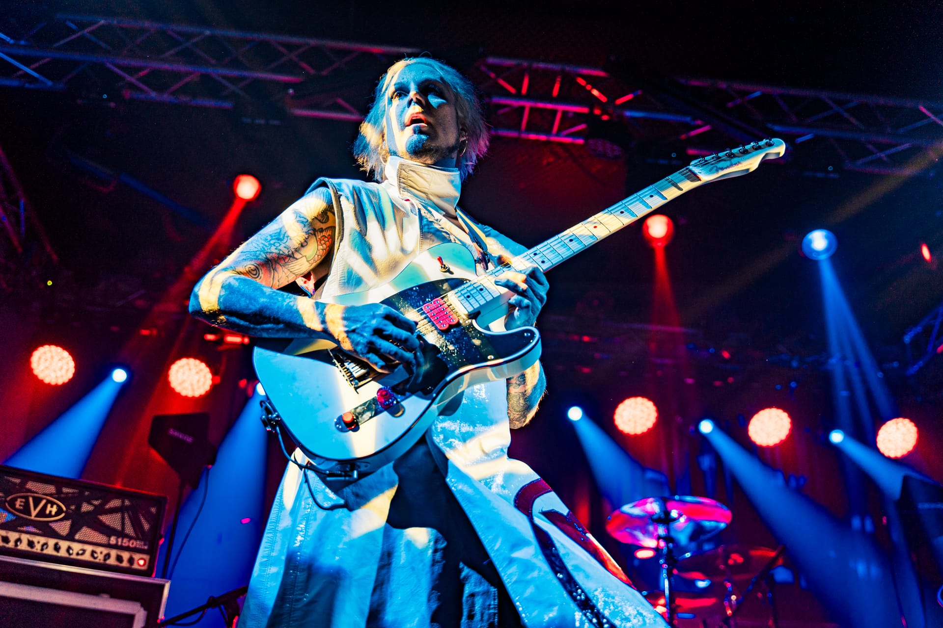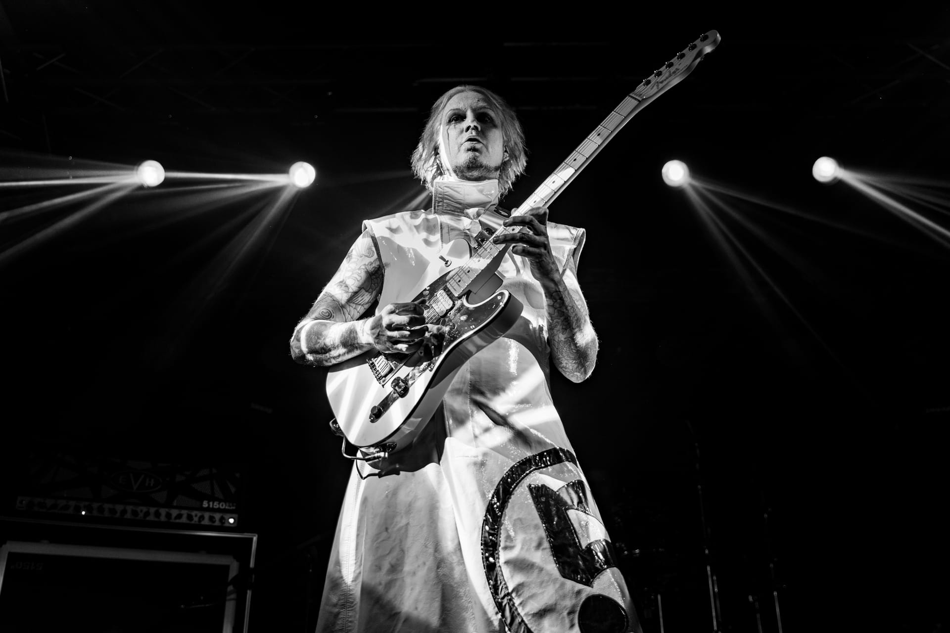 His set opens with the epic “Season of the Witch” and really doesn’t give much breathing room as he quickly switches guitars to move from track to track. The atmospheric “Cactus Flower” is one of the calmer moments in the set, as John 5, with his face draped in black fabric, plays it while serenely backlit. Reminding the audience that he’s joined Motley Crue, to which plenty of cheers are heard, John 5 dons his signature guitar with an emblazoned “CRUE” on the strap and launches into a medley of solos and riffs from their most popular tracks.