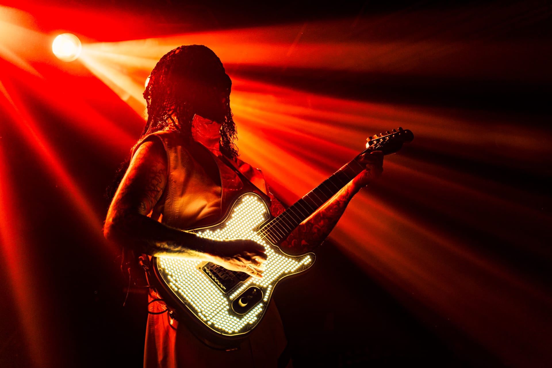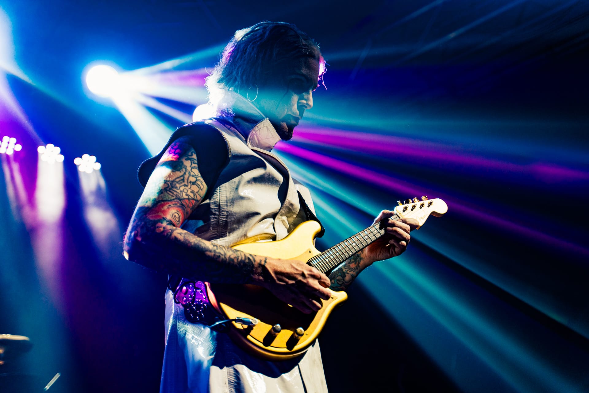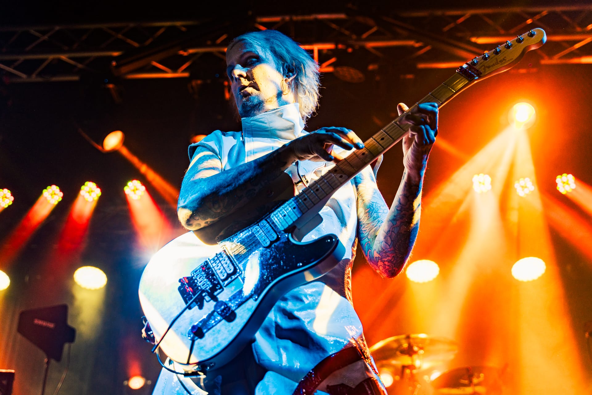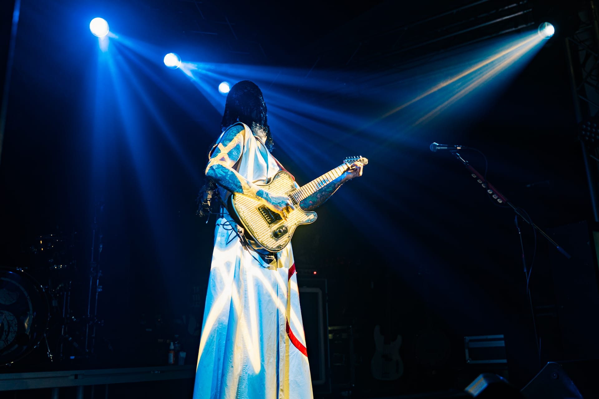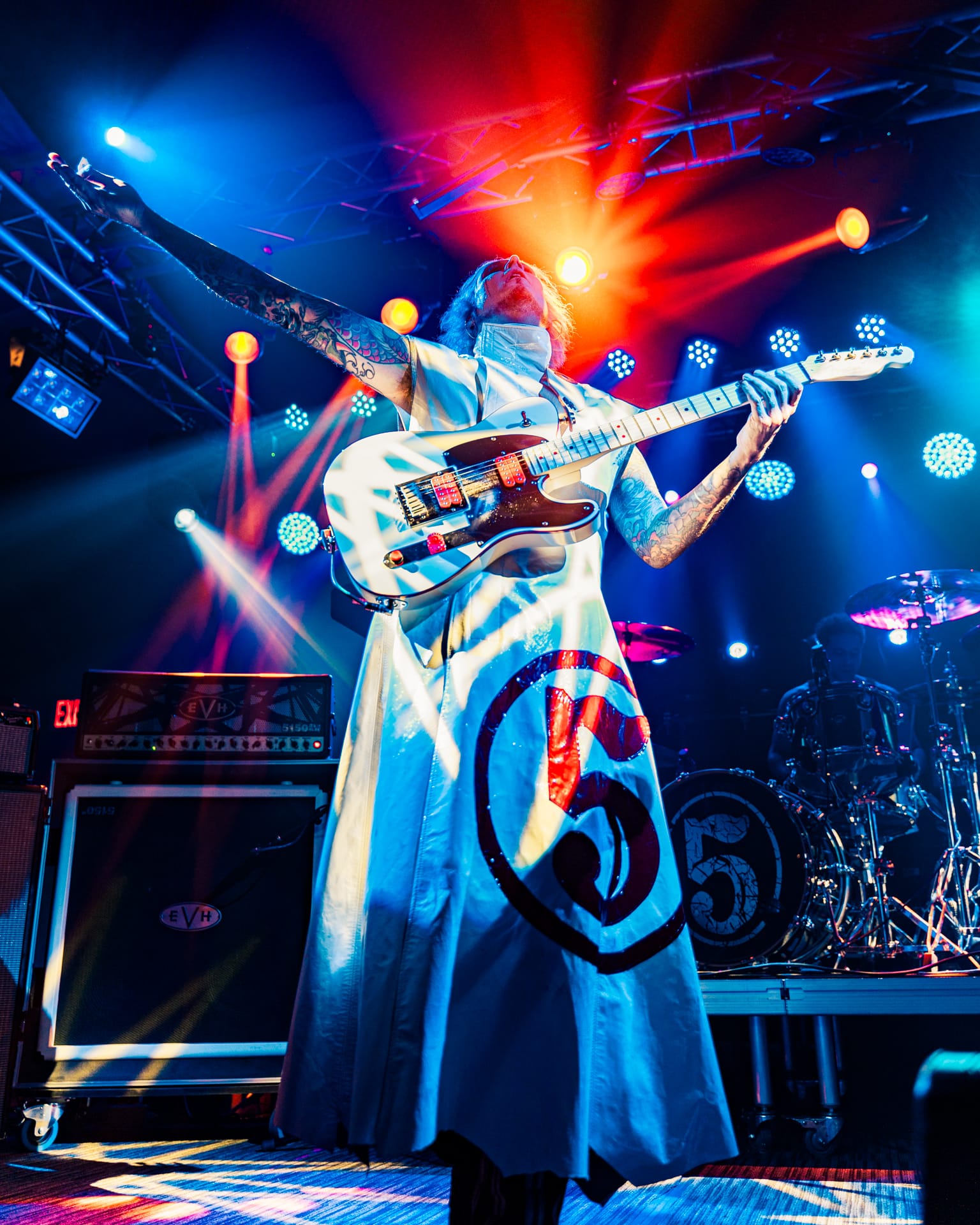 His set opens with the epic “Season of the Witch” and really doesn’t give much breathing room as he quickly switches guitars to move from track to track. The atmospheric “Cactus Flower” is one of the calmer moments in the set, as John 5, with his face draped in black fabric, plays it while serenely backlit. Reminding the audience that he’s joined Motley Crue, to which plenty of cheers are heard, John 5 dons his signature guitar with an emblazoned “CRUE” on the strap and launches into a medley of solos and riffs from their most popular tracks.