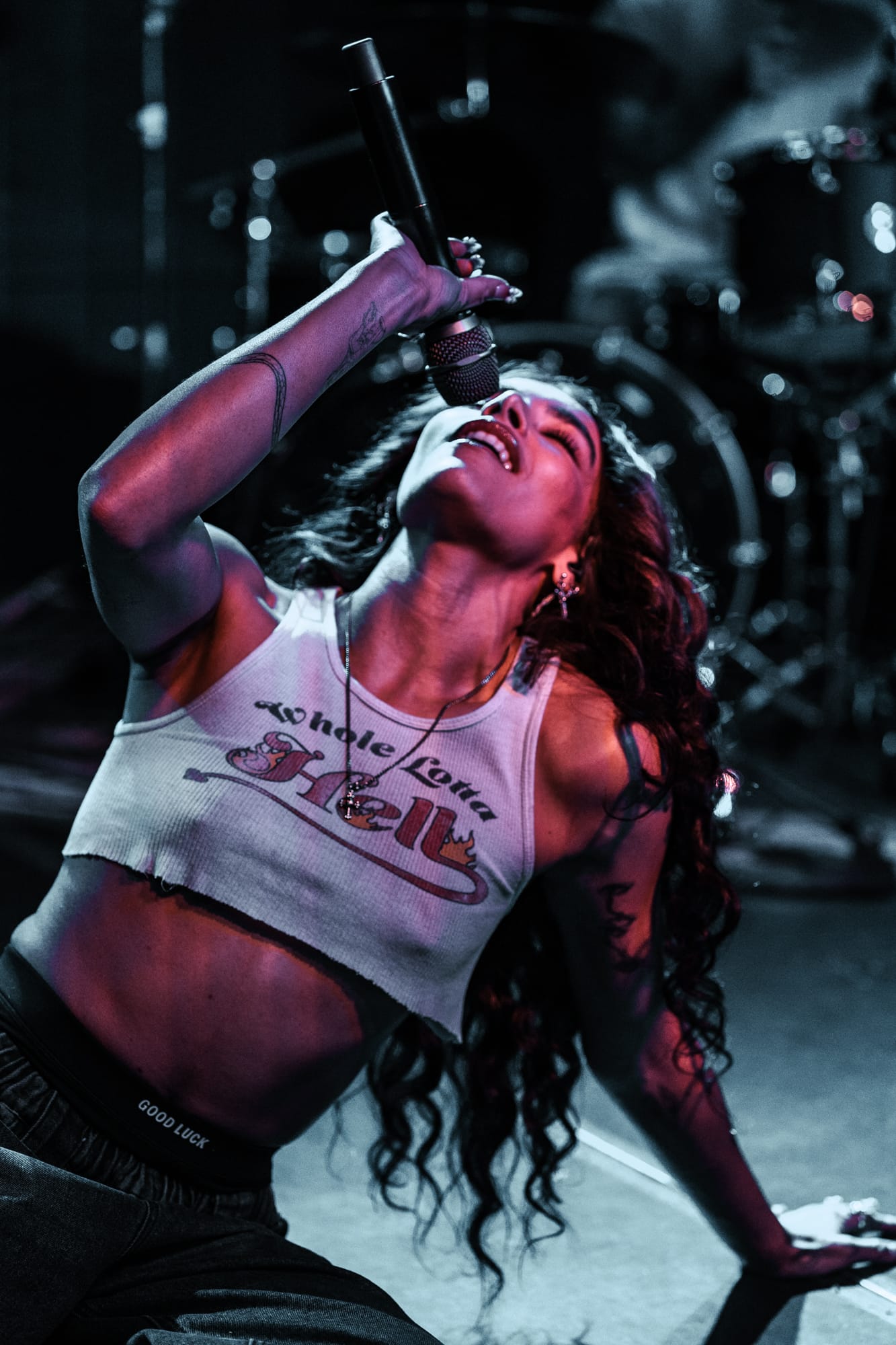 Ari Hicks, who debuted in 2020, is a Toronto native, and was asked by Kenya Grace to open both her 6pm and 9pm shows at The Drake. Taking the stage shortly after doors open, her and her two band members accompanying her for the evening wasted no time getting into their musical zone and straight into their set. Opening her performance with her song “Sucker”, the drums were pounding, the guitar were ripping, and Ari was serving vocals. I personally hadn’t heard of Ari Hicks’ music before the show, but after watching her make her way around the stage, I definitely wanted to dive deeper into her catalogue. With fun upbeat tunes, performing other songs of hers like “Romeo Dies”, and “Criminal”, she kept the crowd entertained, and moving, warming them up for Kenya’s main set.