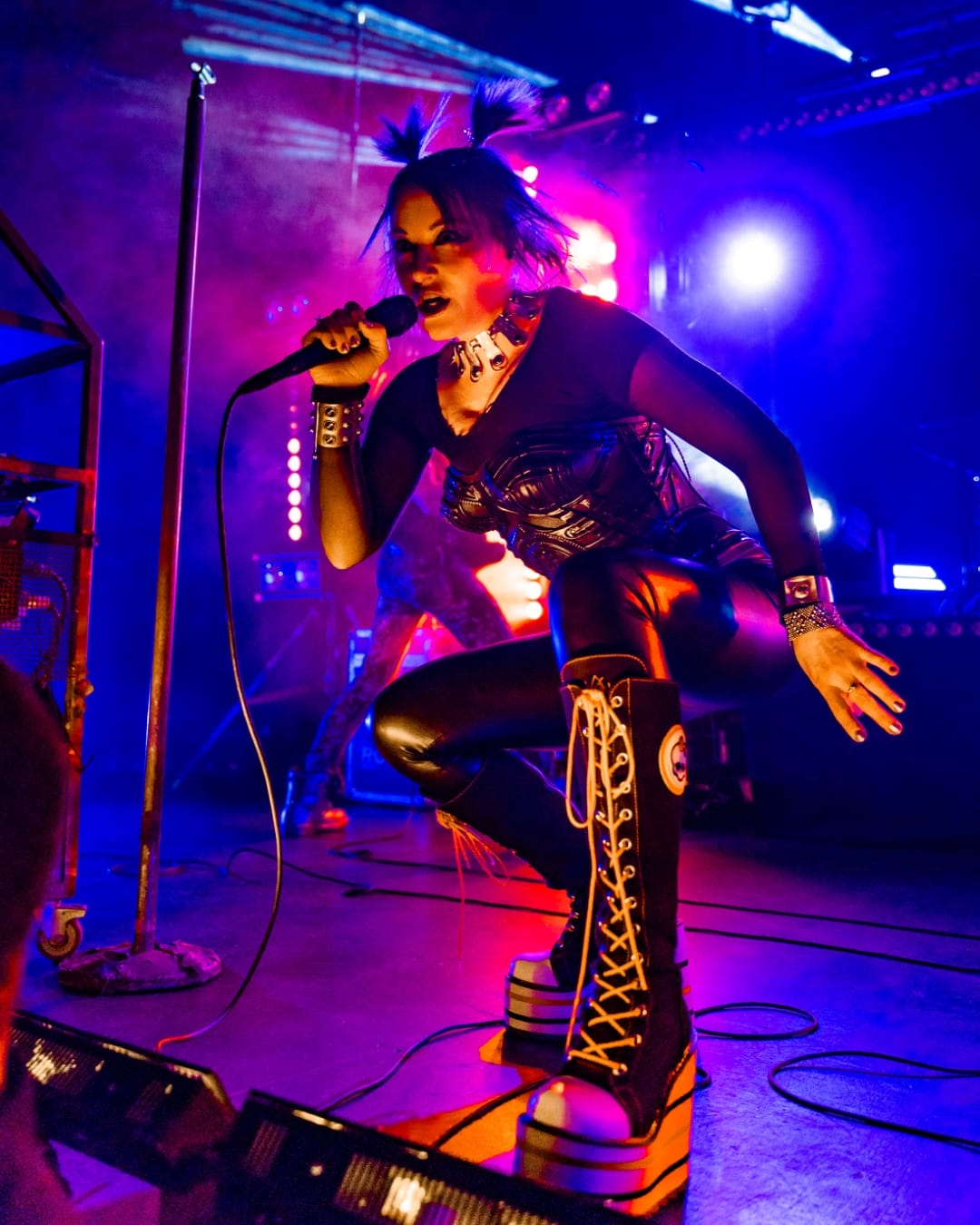 With a KMFDM live show, you go into it knowing already what you’re going to get. Kapt'n K has his classic Taxi Driver getup, never removing those aviator sunglasses. Lucia Cifarelli has her leather catsuit and platform boots, going between her harsh vocals and soft melodic sound. Andy Selway keeps the ultra heavy beat moving from behind his drum kit, and Andee Blacksugar rips through the solos.
