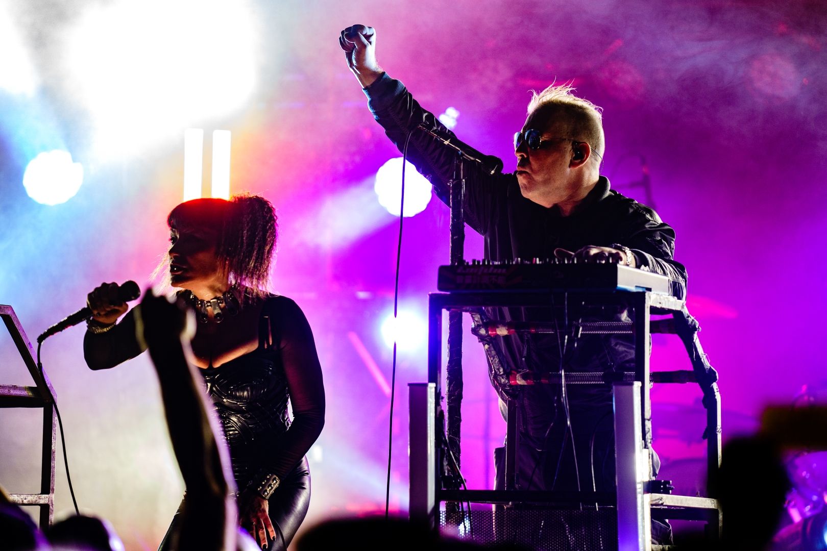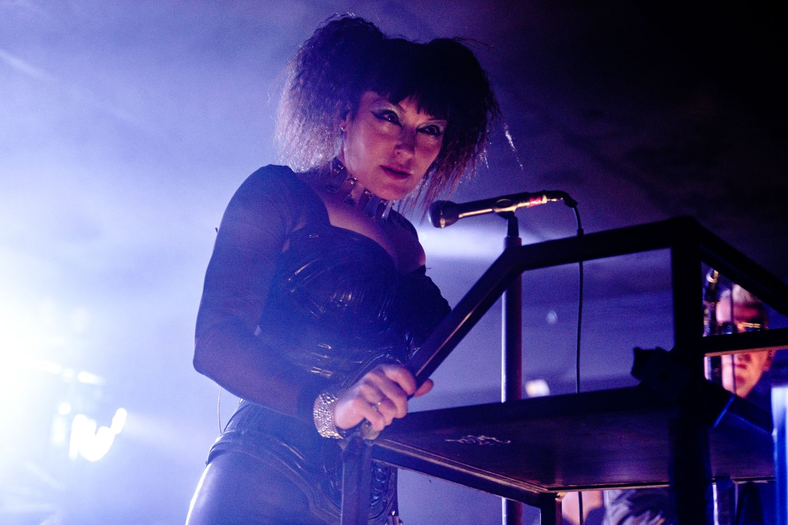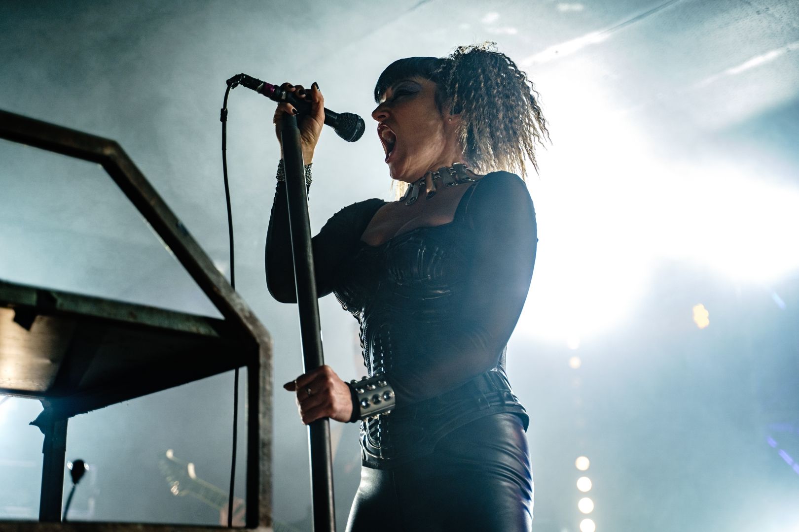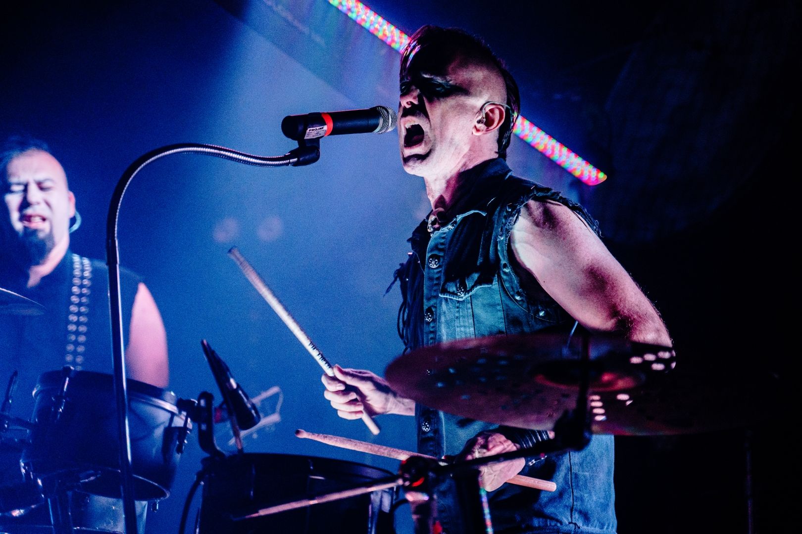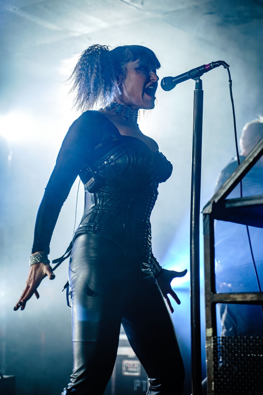 KMFDM frontman and composer Sascha Konietzko leads the charge at his welded iron podium, in his classic Taxi Driver look of aviator shades and bomber jacket. To his right, his partner, Lucia Cifarelli, handling vocal duties for KMFDM since 2003, stalks the stage like a predator on a hunt, unleashing her harsh vocals that are even more impactful live than studio releases.