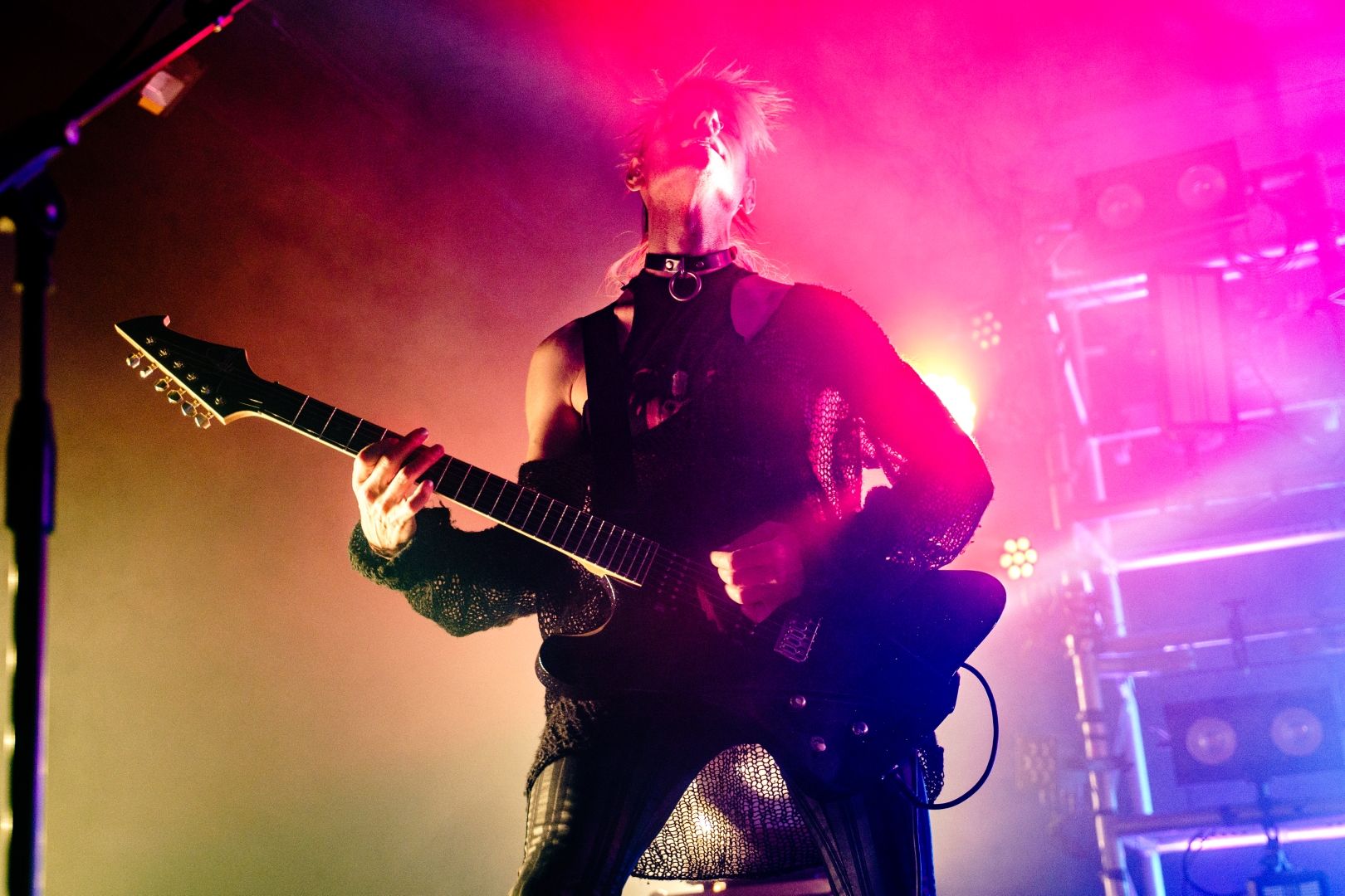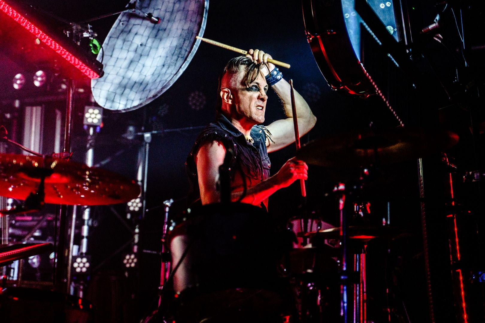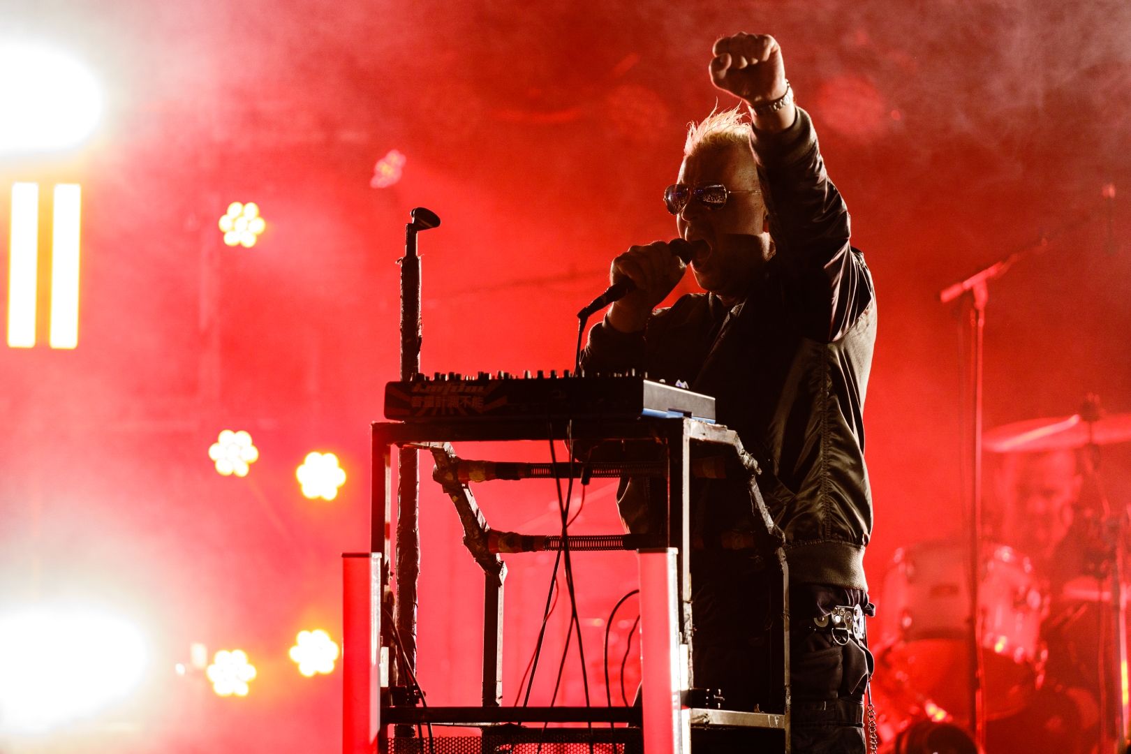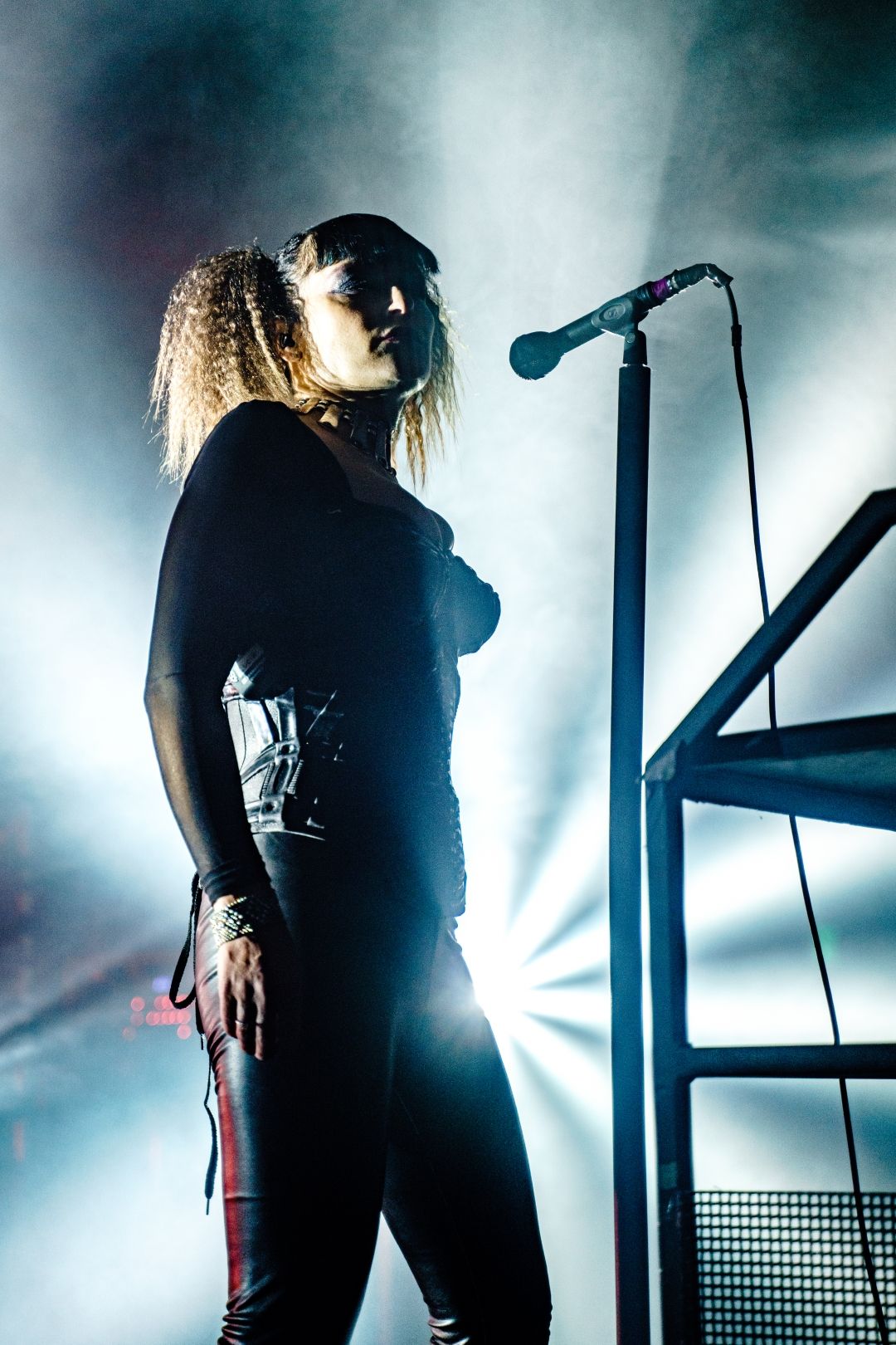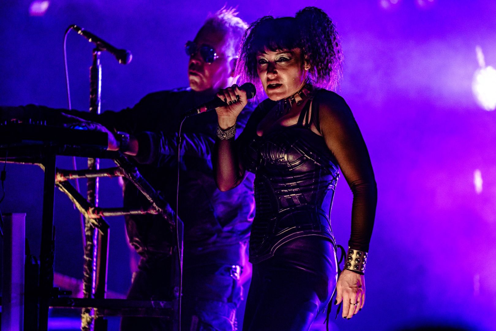 KMFDM frontman and composer Sascha Konietzko leads the charge at his welded iron podium, in his classic Taxi Driver look of aviator shades and bomber jacket. To his right, his partner, Lucia Cifarelli, handling vocal duties for KMFDM since 2003, stalks the stage like a predator on a hunt, unleashing her harsh vocals that are even more impactful live than studio releases.