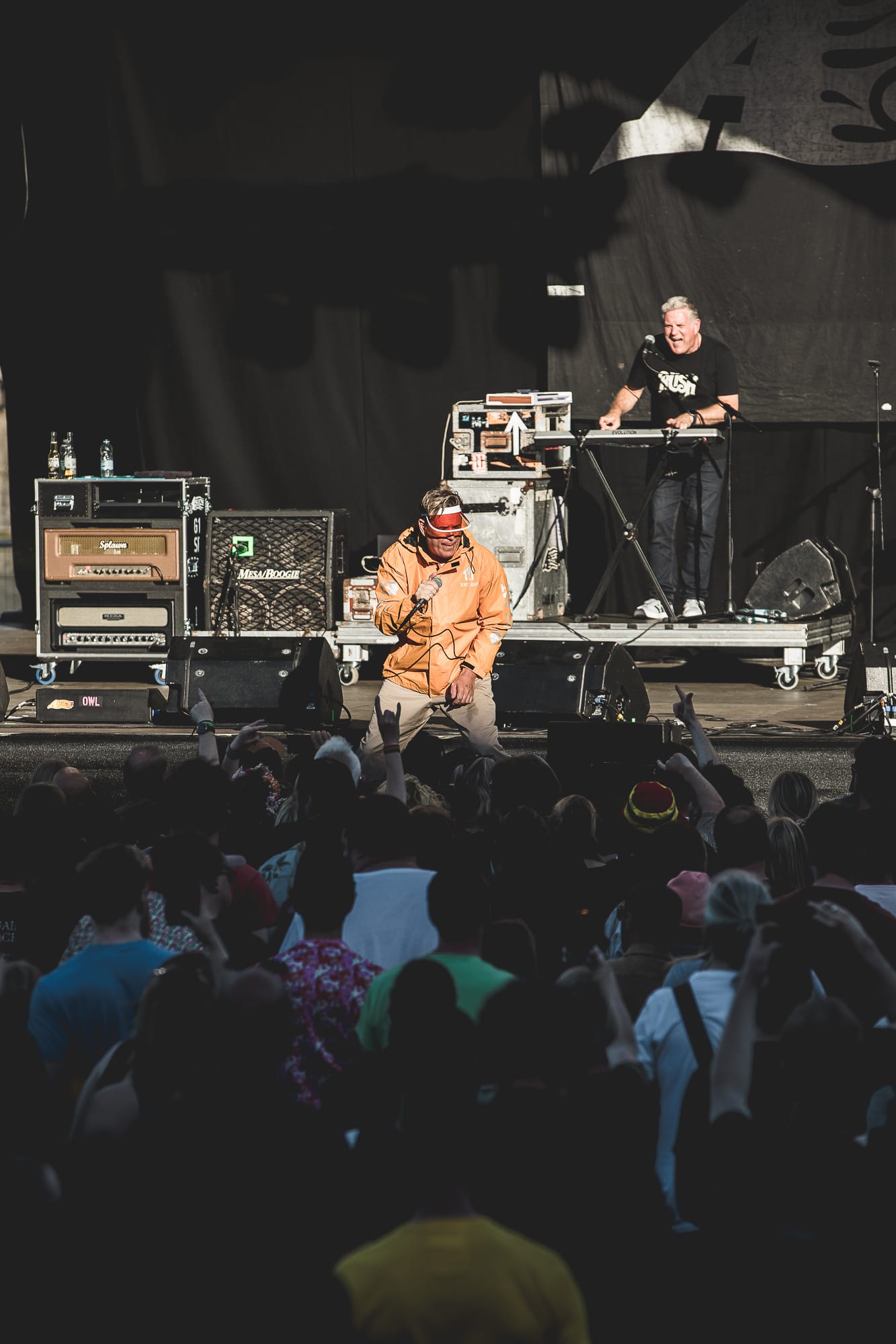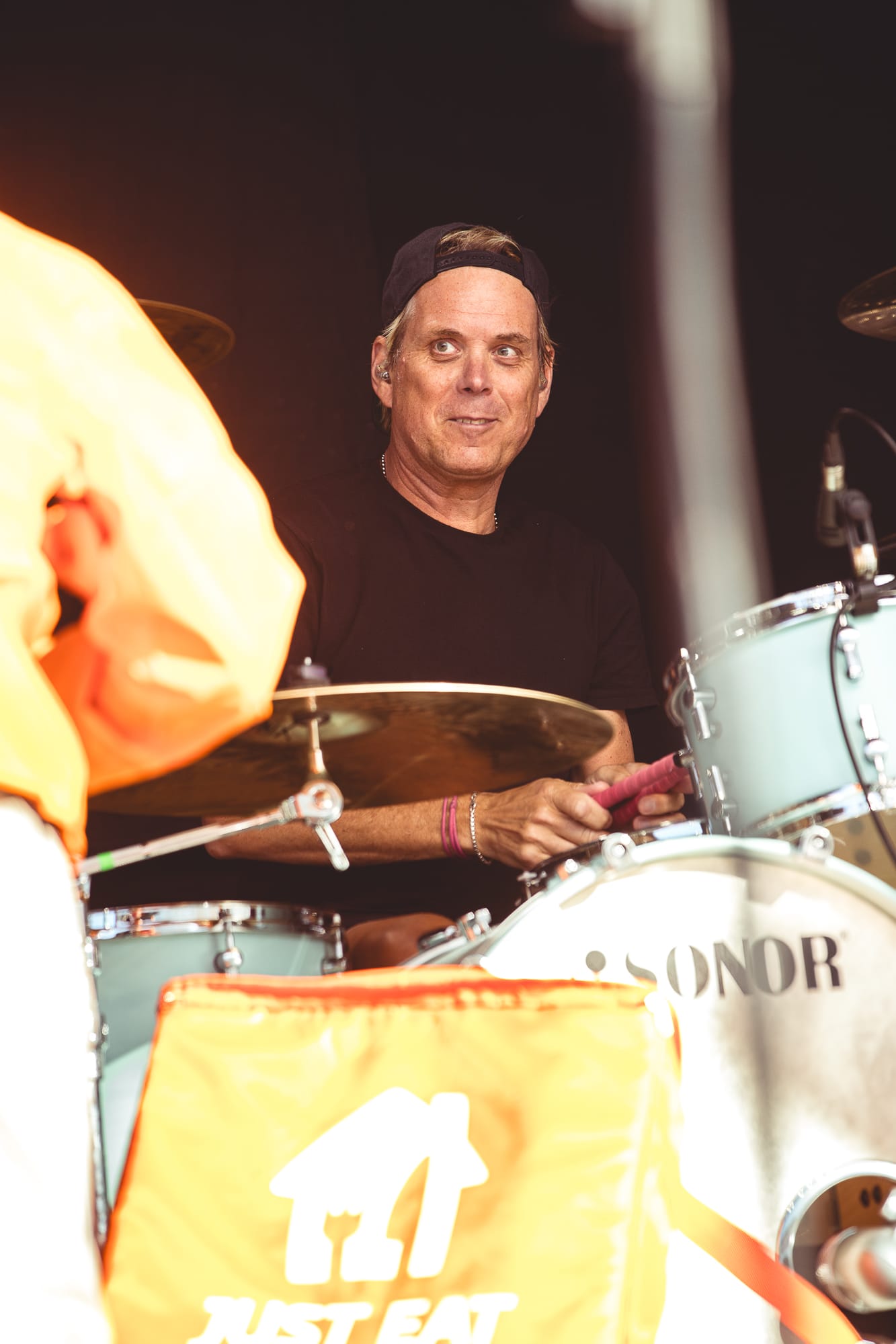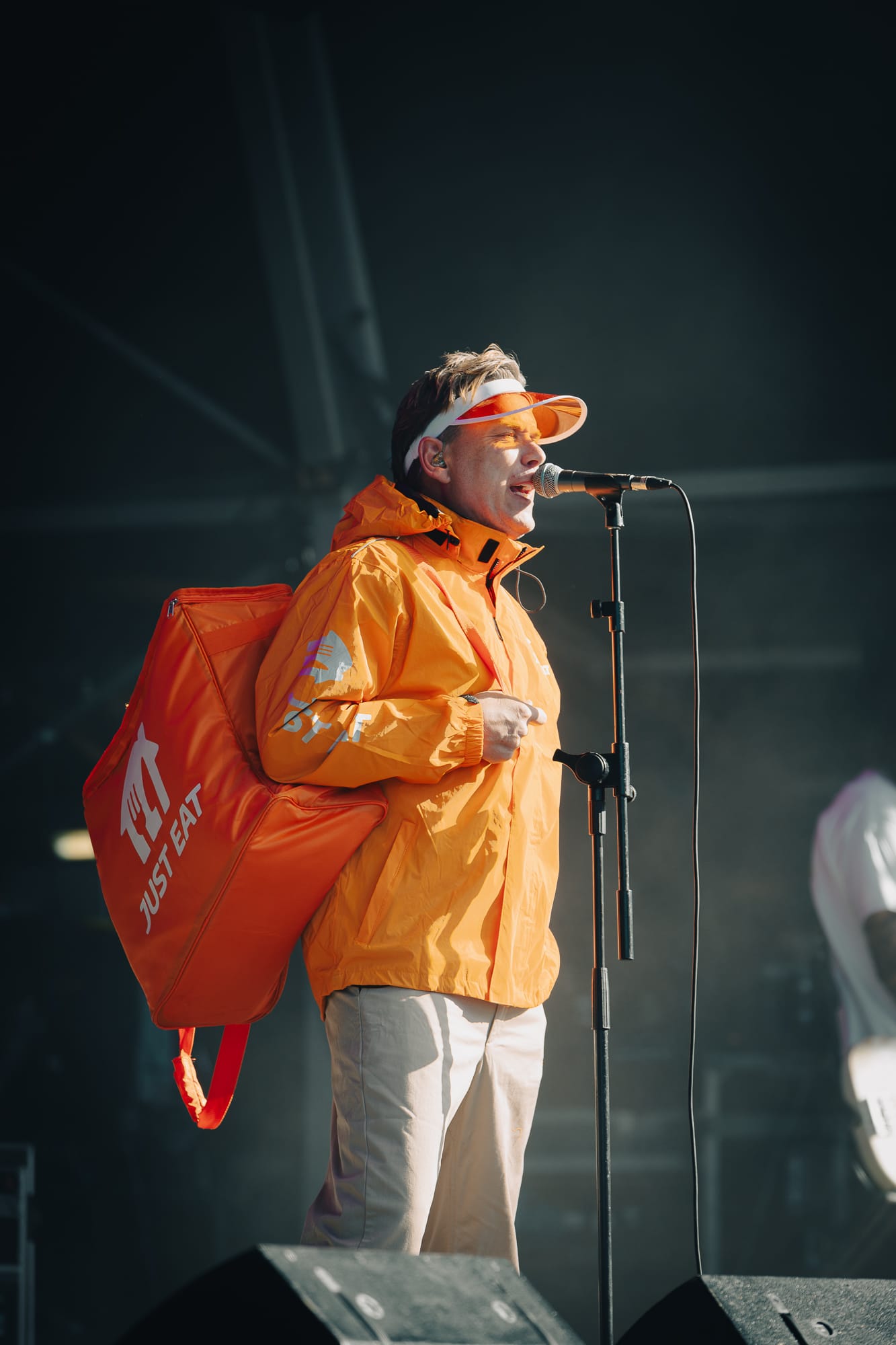 Into the early evening now and the sun is harsh and beaming down directly onto the Main Stage. A appears, with front man Jason Perry, sporting a full ‘Just Eat’ delivery driver uniform, insulated bag and everything.