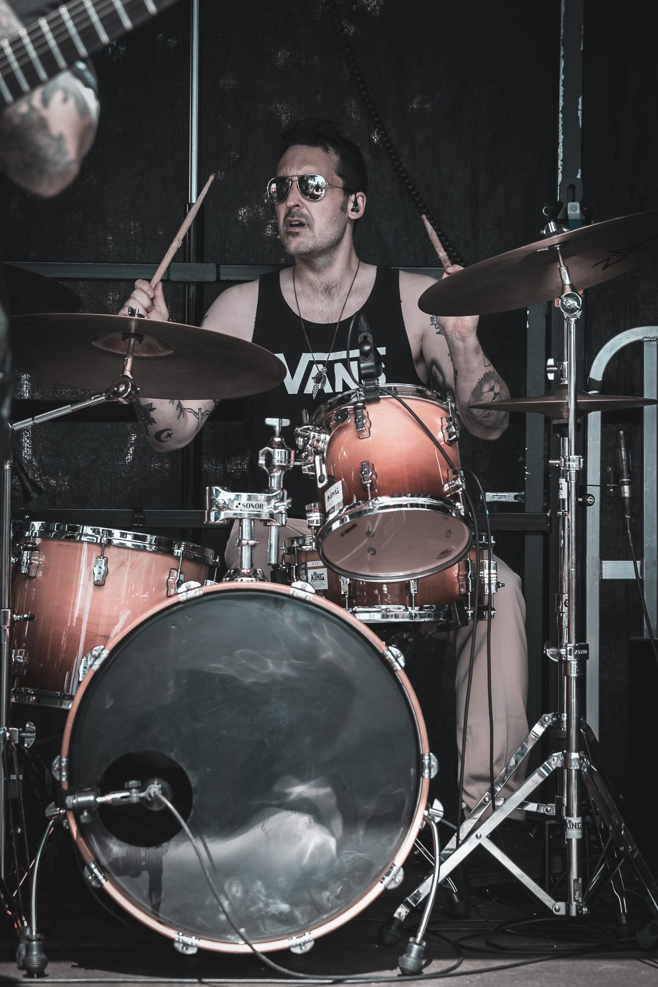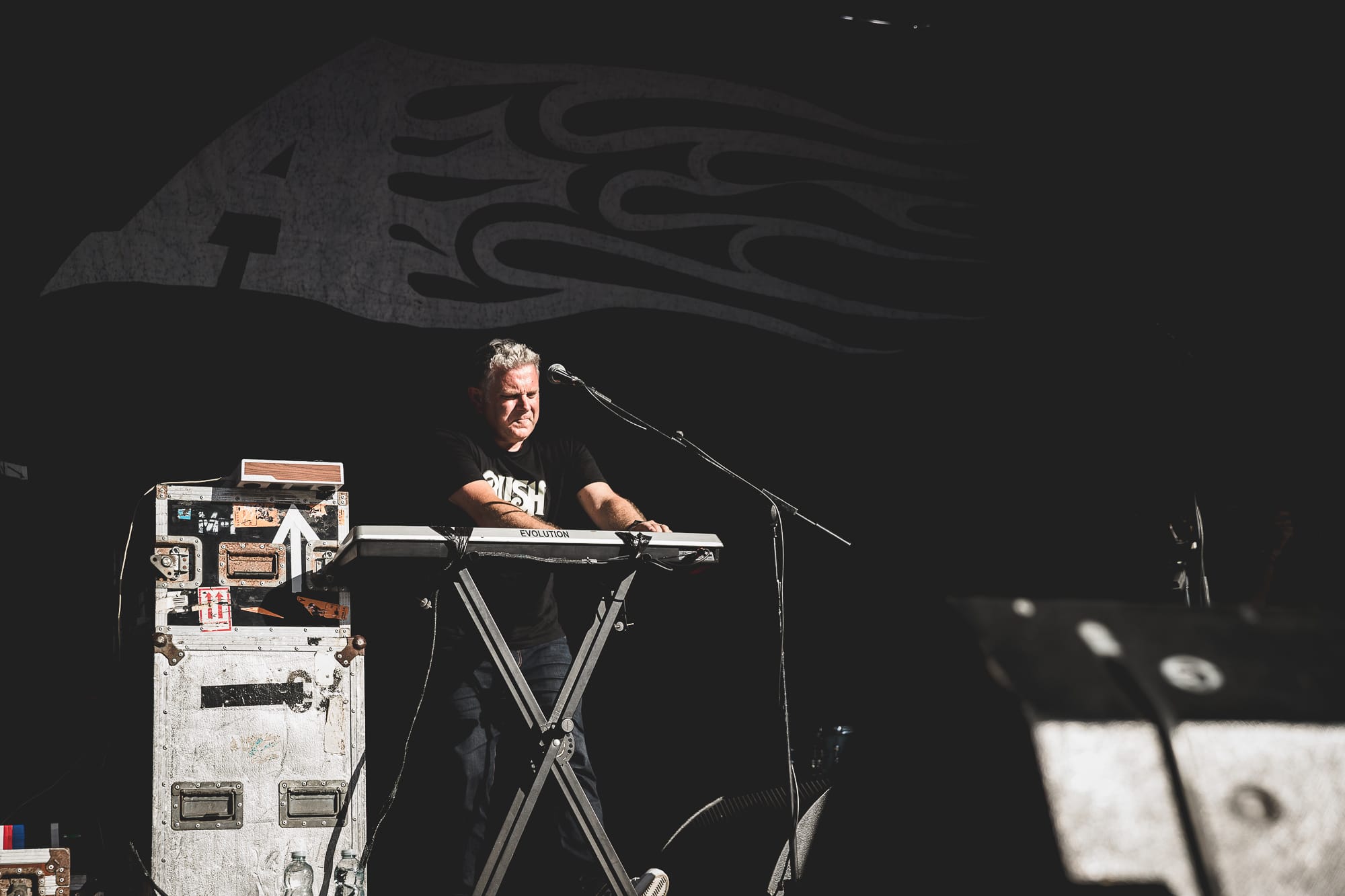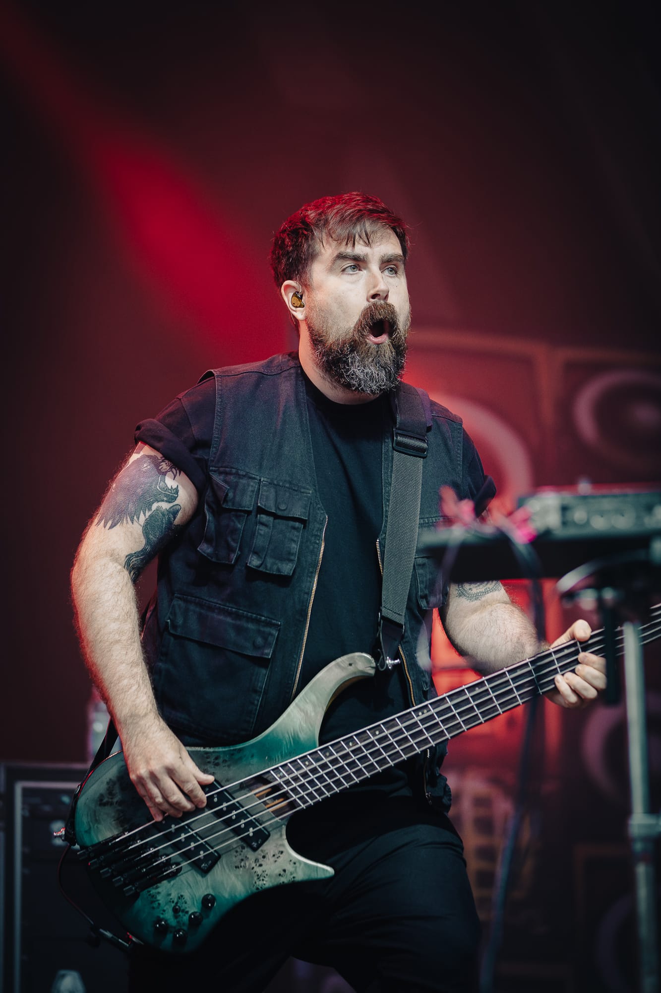 The banterous back and forth continued as he slipped into full Corey Taylor mode, shouting for all of us 'maggots' to get down on the floor, before on the count of 3 …….just staying there and relaxing for a little while. There was also a brief interlude of football chat to fill some time, questioning Gareth Southgate's selection choices and the England team's overall performance at the current UEFA European football tournament, all whilst the audio techs frantically tried to fix an issue with Giles Perry’s keyboard/sampler set up.