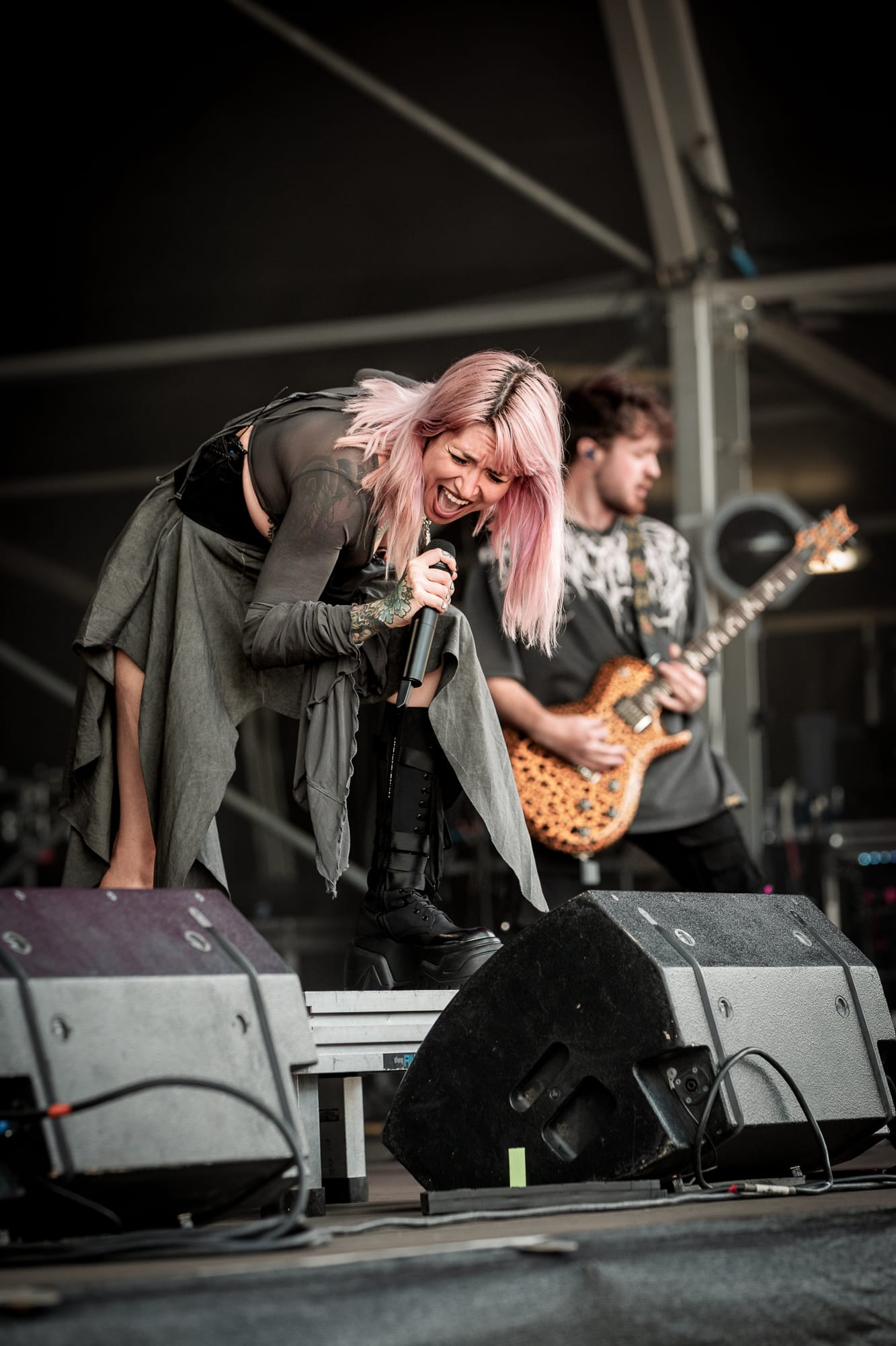 Brighton-based anime-influenced Alt-Metal band Lake Malice then took to the Main Stage. The energy on display from guitarist Blake Cornwall, who was a whirlwind of jumps and spin kicks all over the stage, showed that he could not be contained by the confines of the stage alone, as he vaulted the barrier and made his way into the centre of the circle pitting crowd. Although Blake’s skill with six strings is in no doubt, it is Alice Guala’s vocal performance that is truly outstanding. Her transition between clean vocals into some truly face-melting harsh vocals had the crowd completely captivated. The way in which all of this amalgamates with the electronic elements of their soundscape and some unbelievably fierce drums, on this occasion provided by Emily Ainger, Lake Malice were definitely one of my highlights of the day and absolutely worth your time for a cheeky little listen.