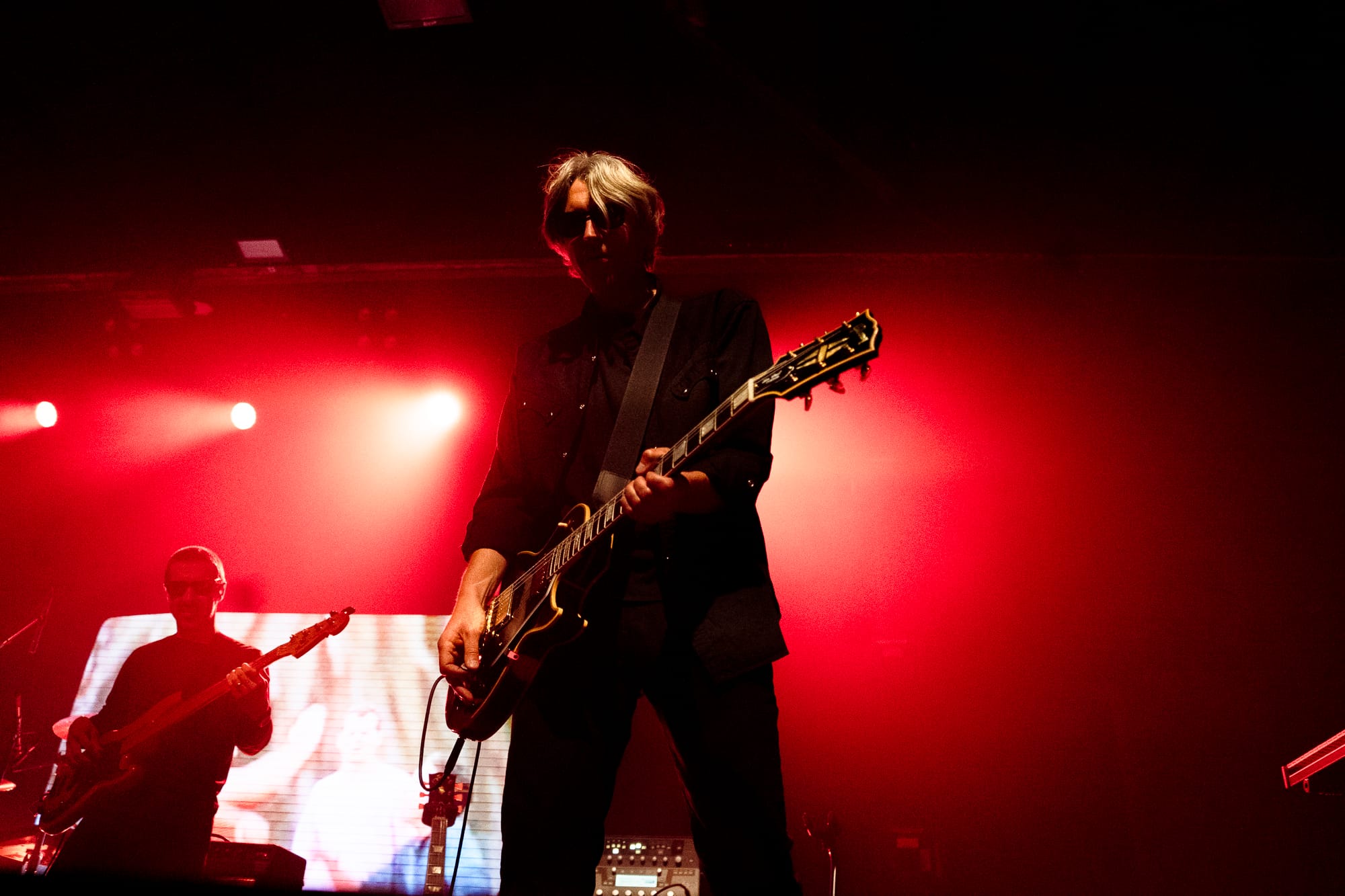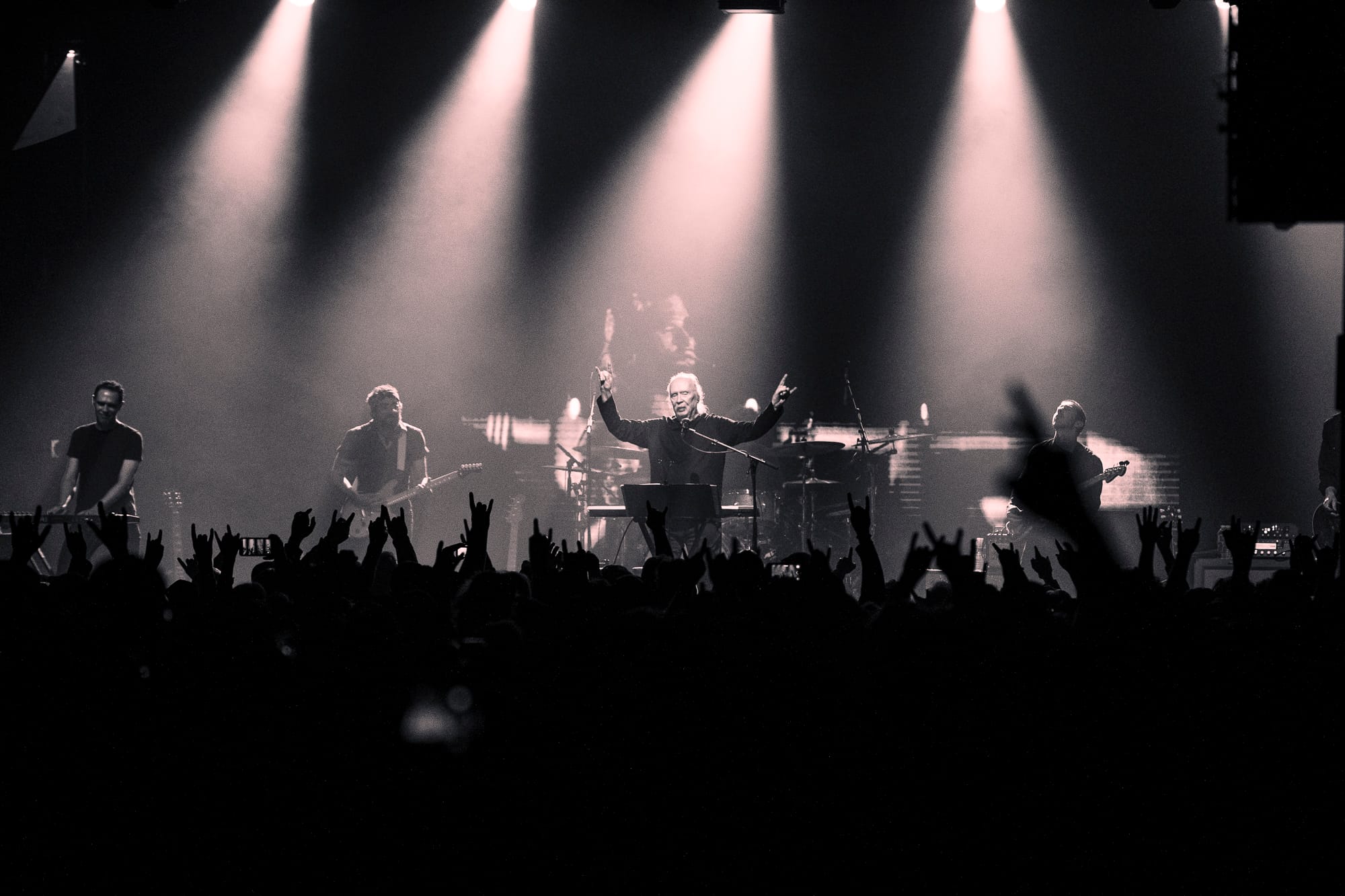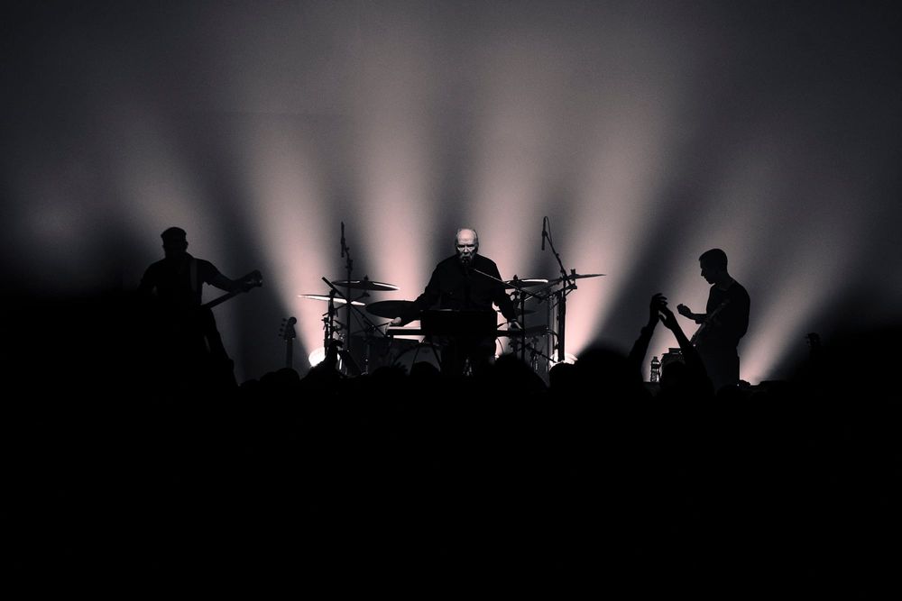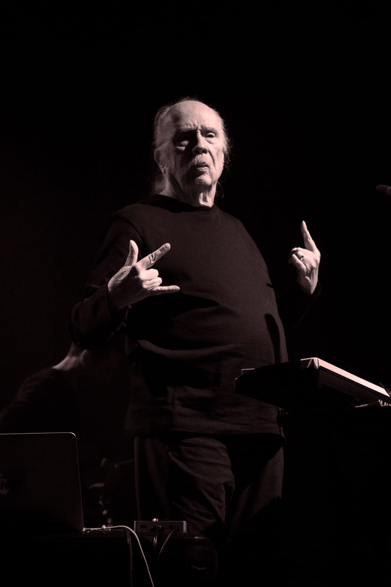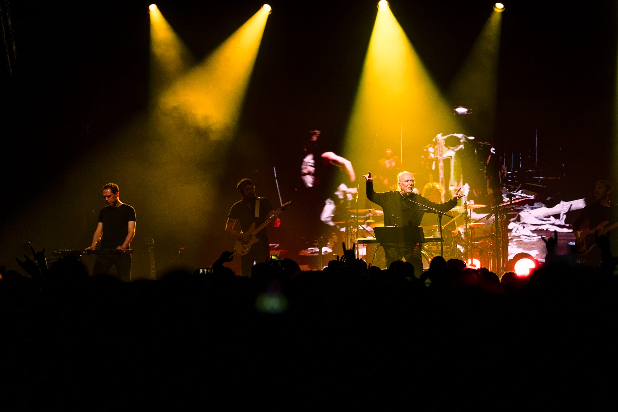 Looking over the crowd, I’m not sure there was anyone in attendance more excited to be there than Carpenter, who had whipped out a dark pair of sunglasses to shield his eyes and throw daggers at the crowd while routinely finding his hands in classic devil horns thrown above the crowd with a sea of similar hand gestures waving back. Behind the men stood large visuals of the film scenes from which he pulled his music. Horrid creatures, disfigured bodies, violent battles, and dimly lit roads played over the glaring synths and impressive guitar solos. All of the music wrapped in a comfortable feeling of nostalgia for films that carry more memories than minutes. All the charm of his films is alive on stage through the talented musicians who earnestly understood the composer's vision. Carpenter would frequently point to his fellow musicians, casting sound from their instruments that he had destined to be played from them decades before. Davies on guitar routinely shone through a shower of spotlight with technical solos and long drawls emanating from the guitar that hung low at his arm's length.
