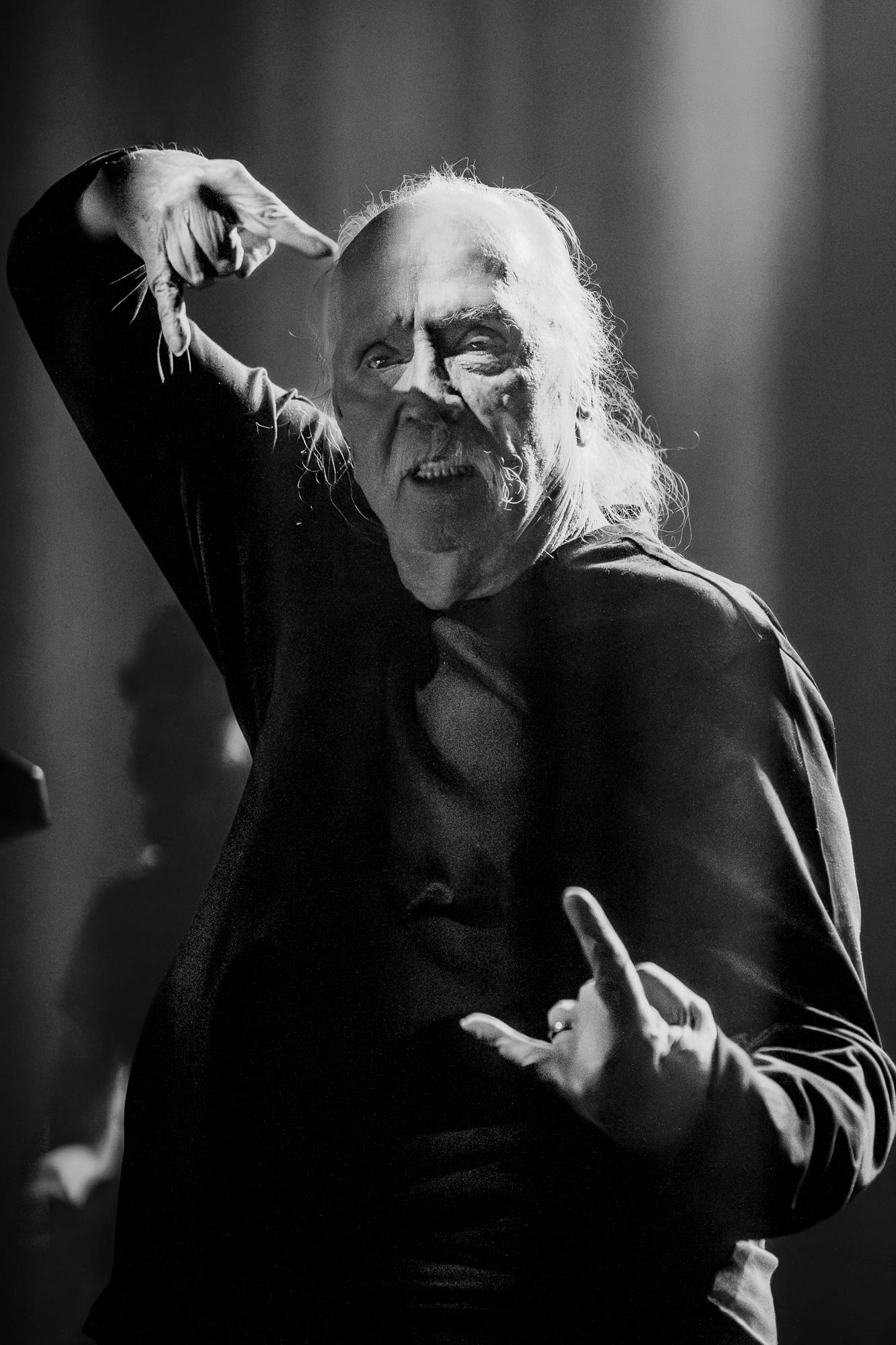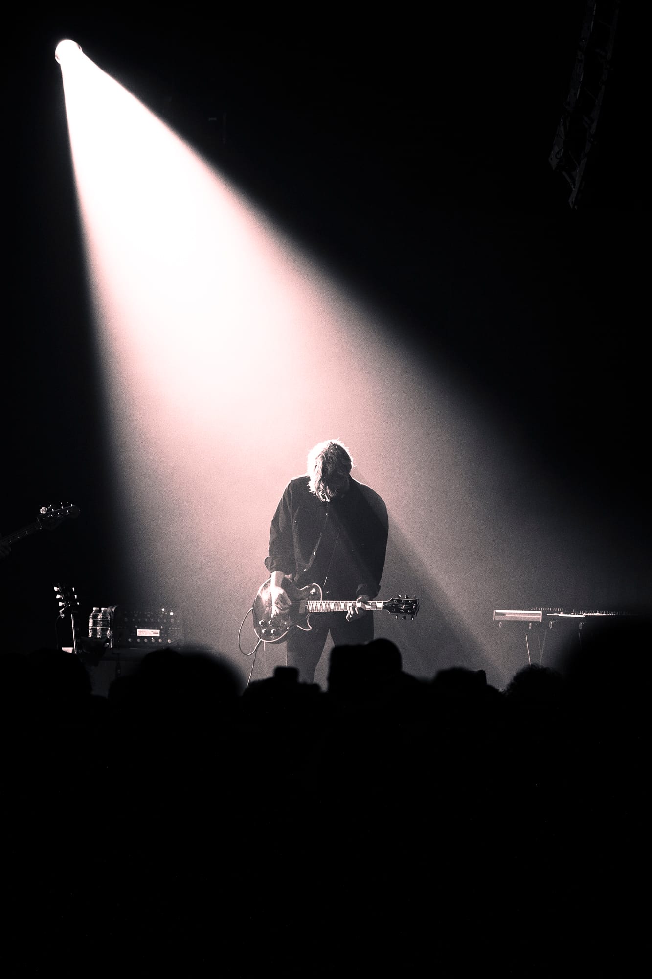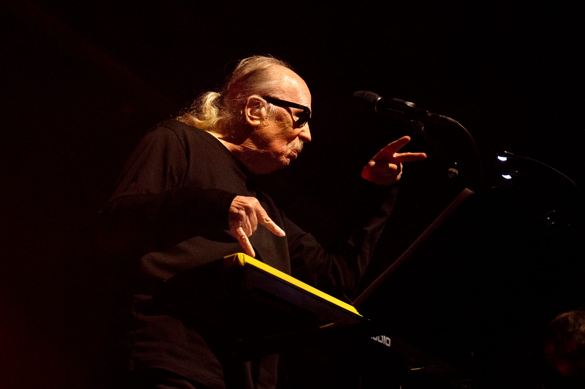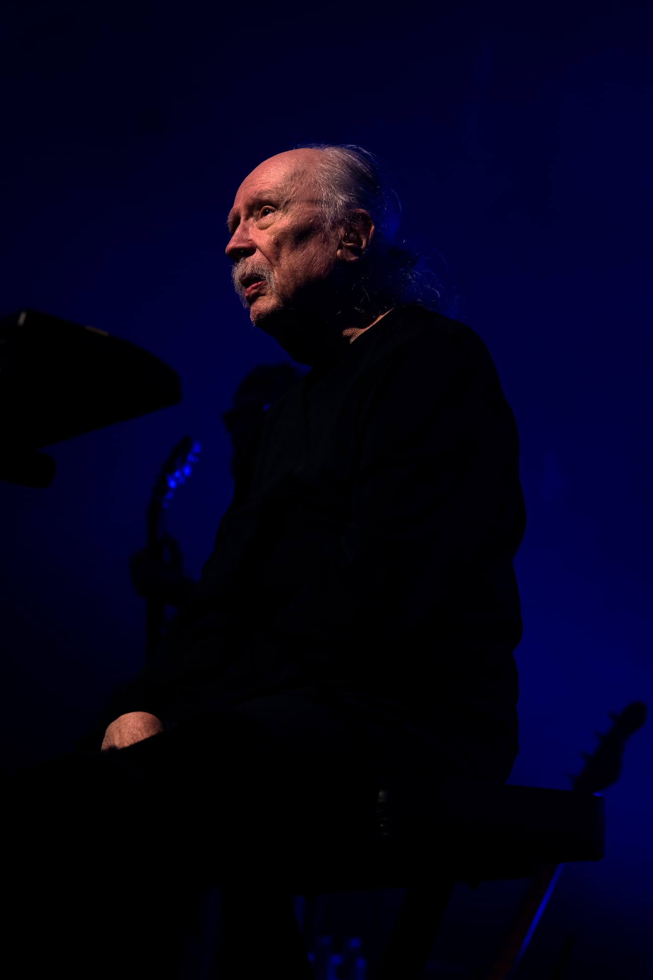 Looking over the crowd, I’m not sure there was anyone in attendance more excited to be there than Carpenter, who had whipped out a dark pair of sunglasses to shield his eyes and throw daggers at the crowd while routinely finding his hands in classic devil horns thrown above the crowd with a sea of similar hand gestures waving back. Behind the men stood large visuals of the film scenes from which he pulled his music. Horrid creatures, disfigured bodies, violent battles, and dimly lit roads played over the glaring synths and impressive guitar solos. All of the music wrapped in a comfortable feeling of nostalgia for films that carry more memories than minutes. All the charm of his films is alive on stage through the talented musicians who earnestly understood the composer's vision. Carpenter would frequently point to his fellow musicians, casting sound from their instruments that he had destined to be played from them decades before. Davies on guitar routinely shone through a shower of spotlight with technical solos and long drawls emanating from the guitar that hung low at his arm's length.