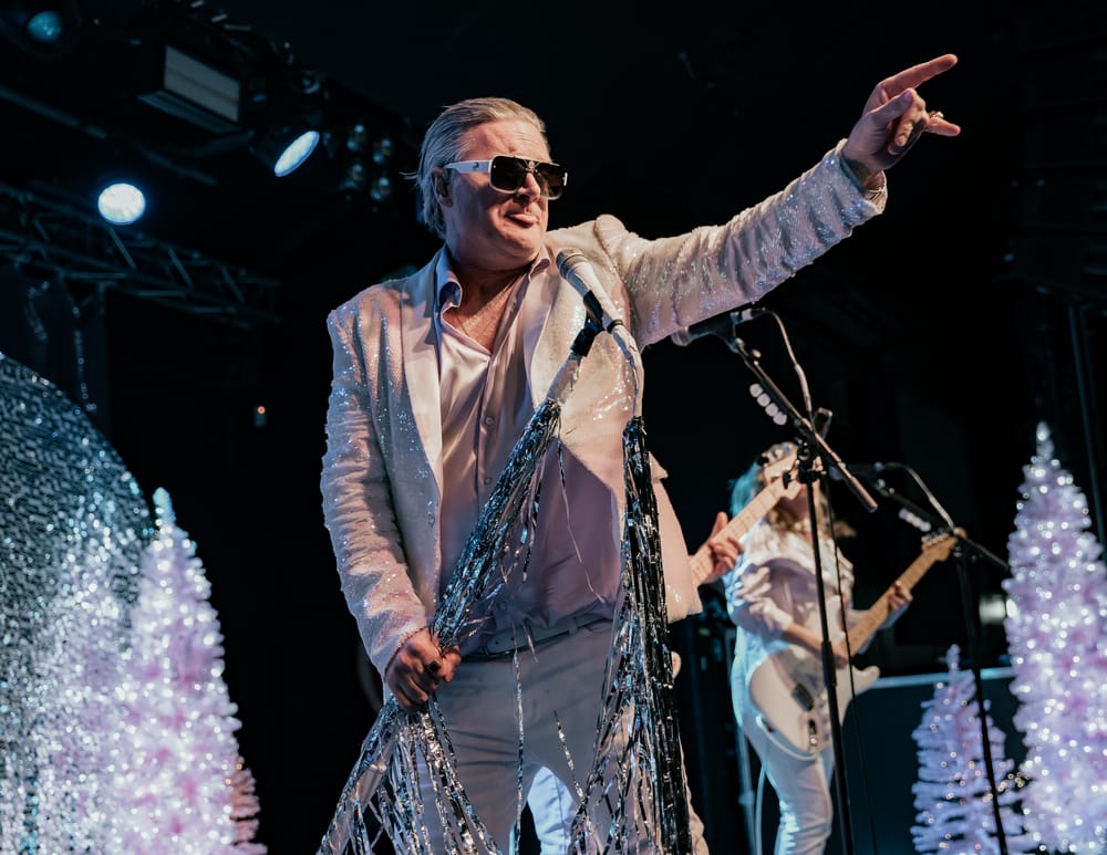 This evening, the band casually entered the stage, and, as the Latin-tinged party intro music faded, it was pierced with a short blast of guitar feedback, and they were off! Straight into "Feliz Navidad," a popular modern-day Latin pop Christmas standard, just to remind the crowd—‘tis the season! Lead singer Sean "Spike" Slawson strolled over to his tinseled mic stand, just in time to deliver the vocals. The whole band looked resplendent in their white glittery attire, smart and besuited and, complementing the magnificent stage set, decked in Christmas regalia with pink Christmas trees, a large nutcracker soldier, and a glittery backdrop curtain.