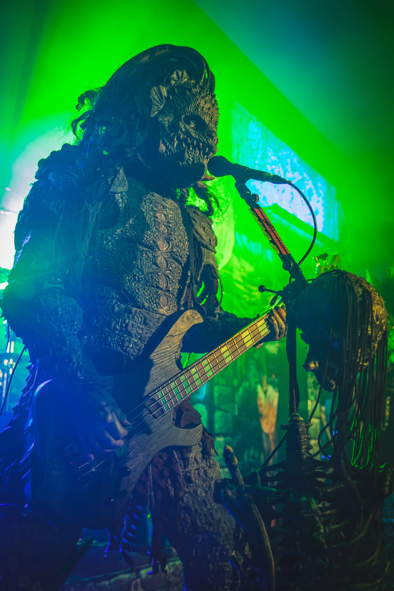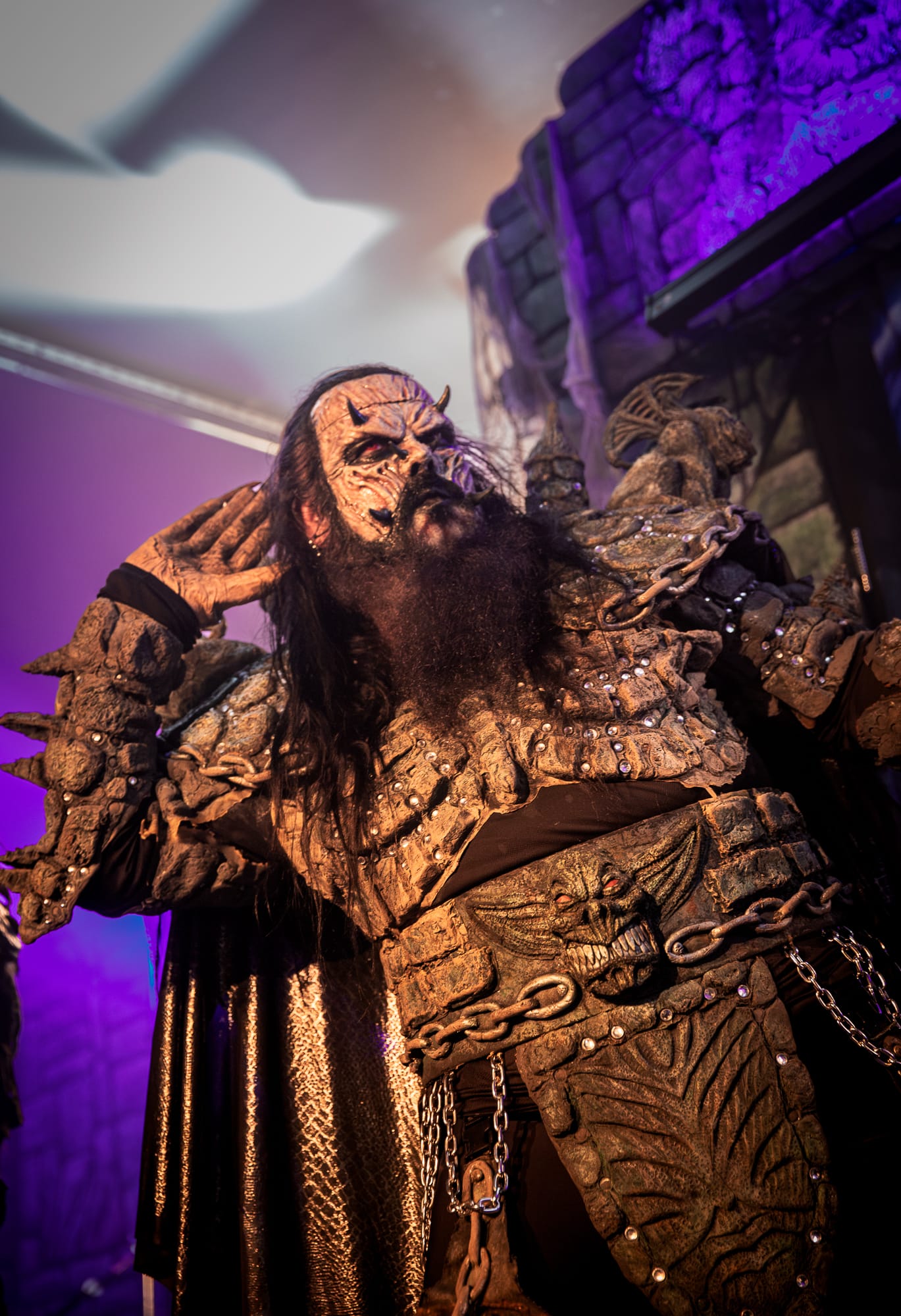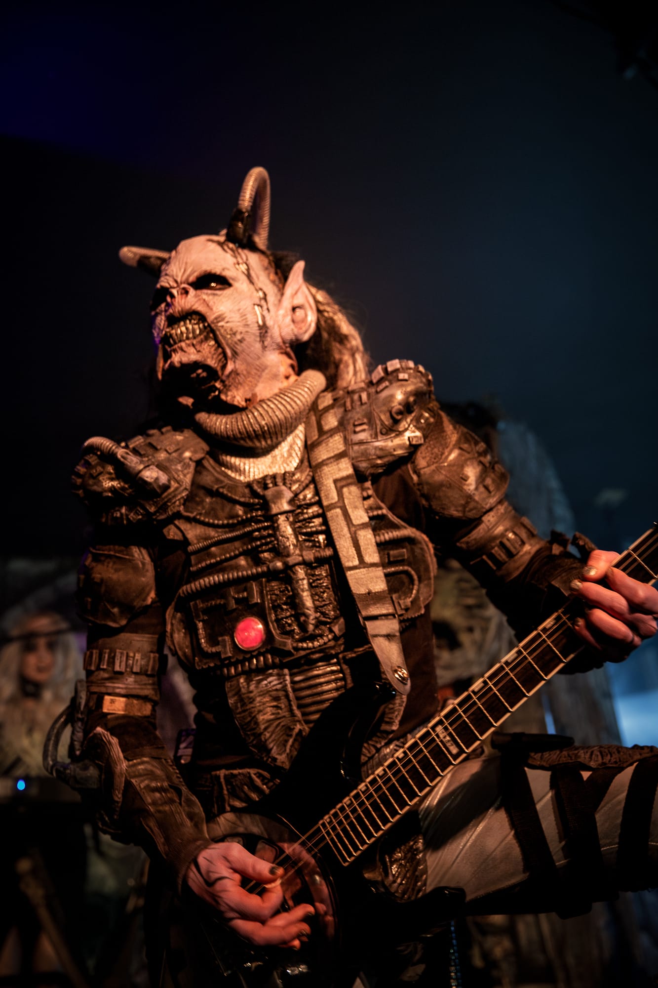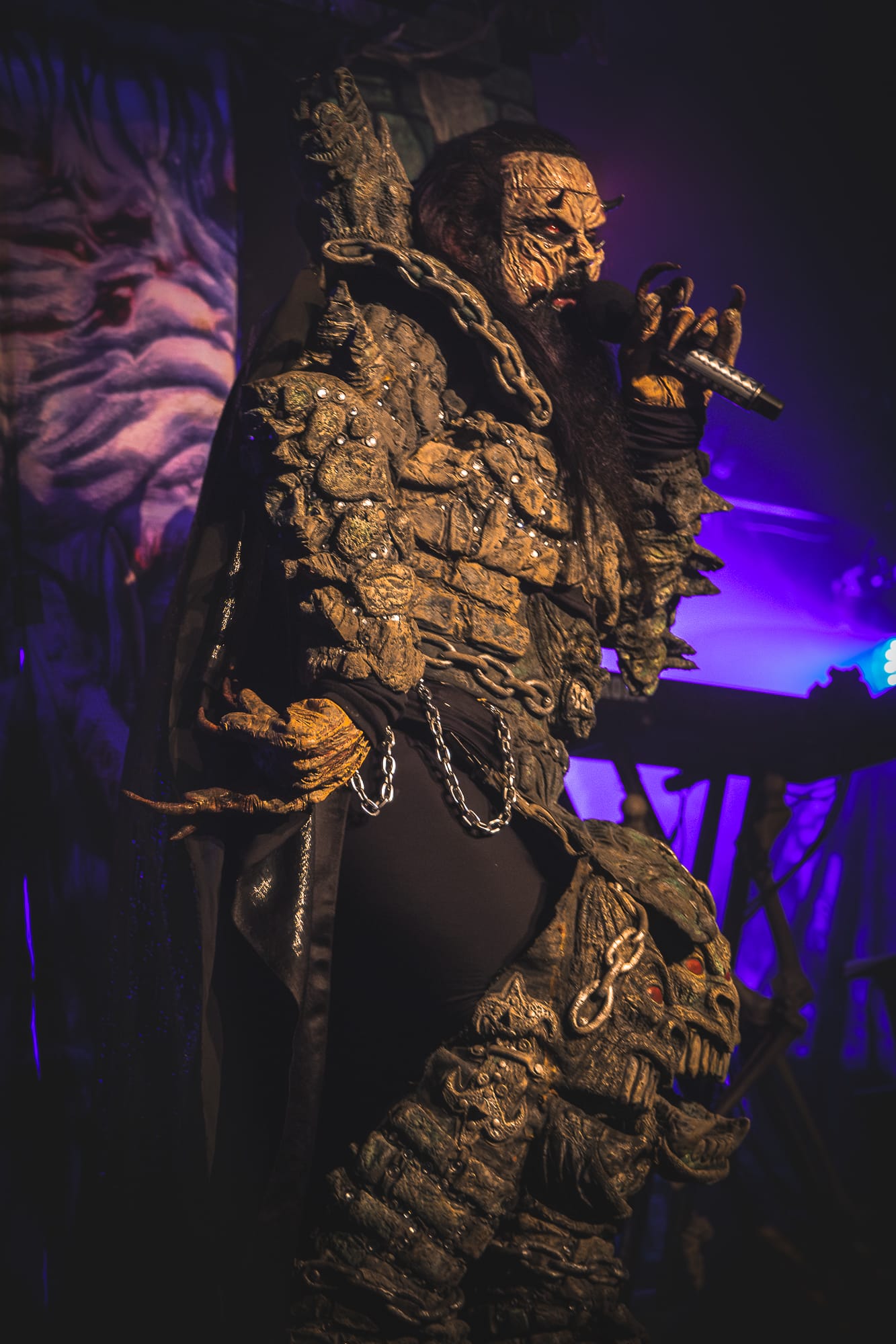 The lights dimmed as "God of Thunder" by KISS began to play, as on stepped Ralph Ruiz (theatrical actor and long time Lordi collaborator) cloaked and hooded as the monk/druid Nosferuiz. Initially singing along to the glam rock legends he slowly made his sinister way to centre stage before breaking into the opening monologue from the 2023 album Screem Writers Guild to introduce the band.