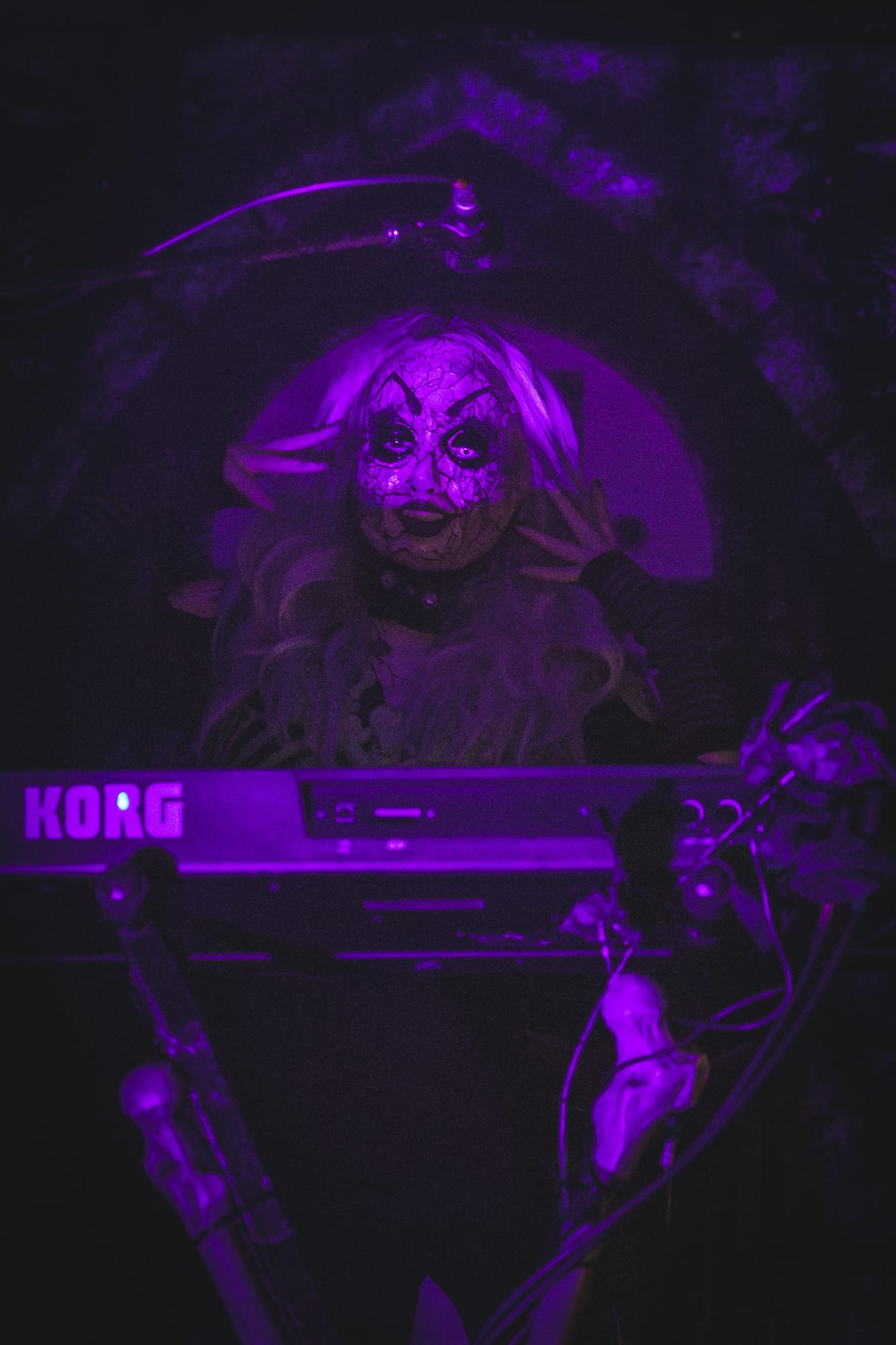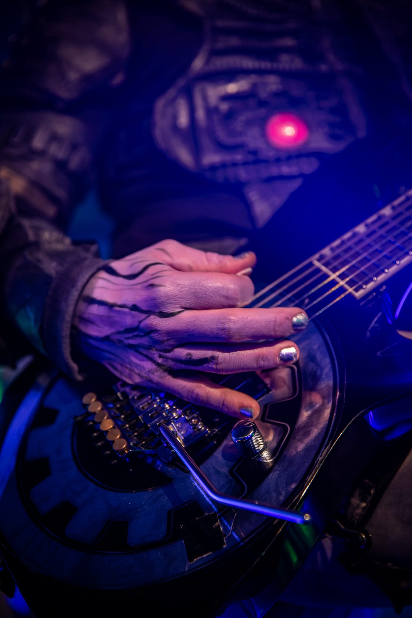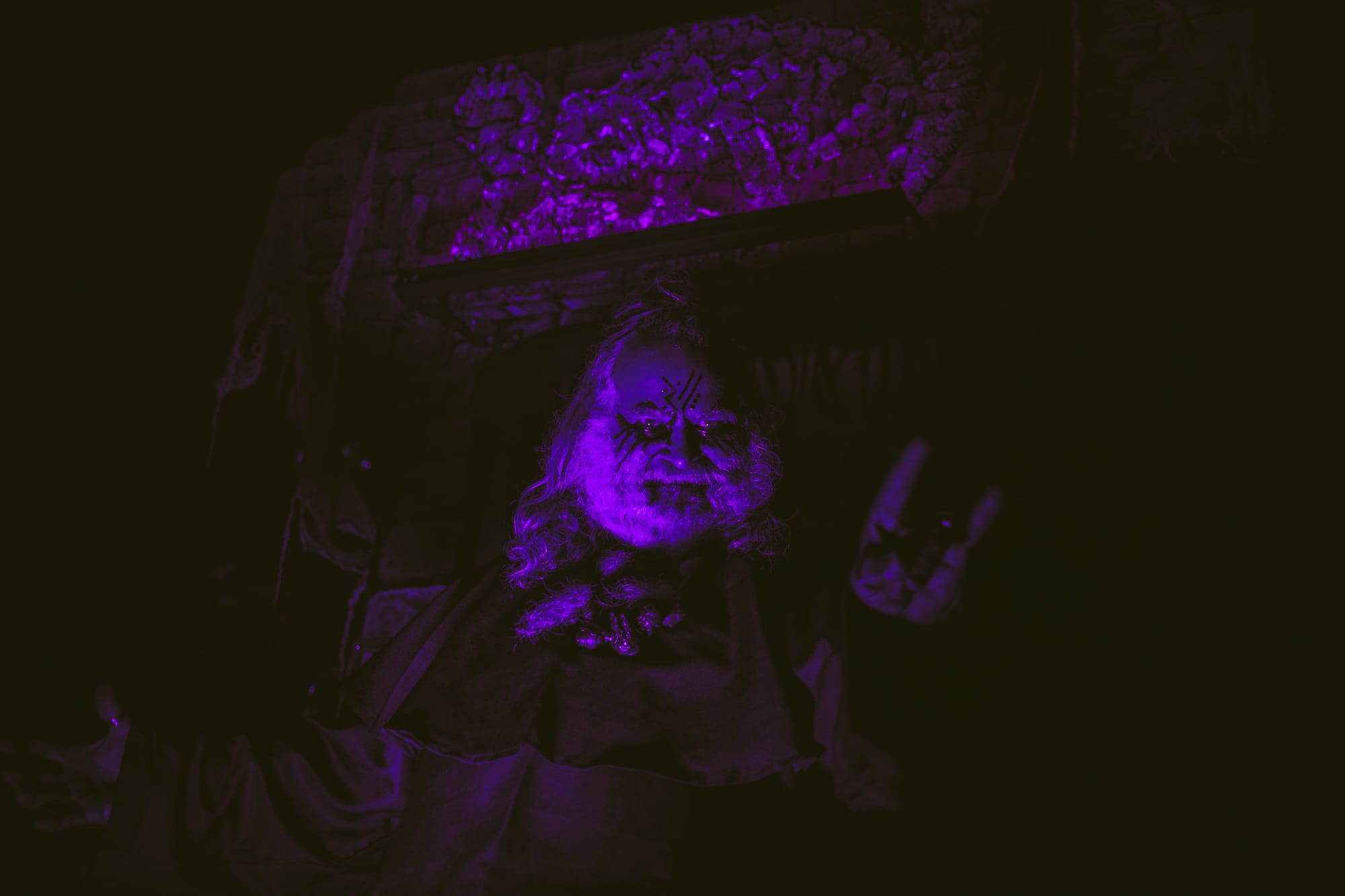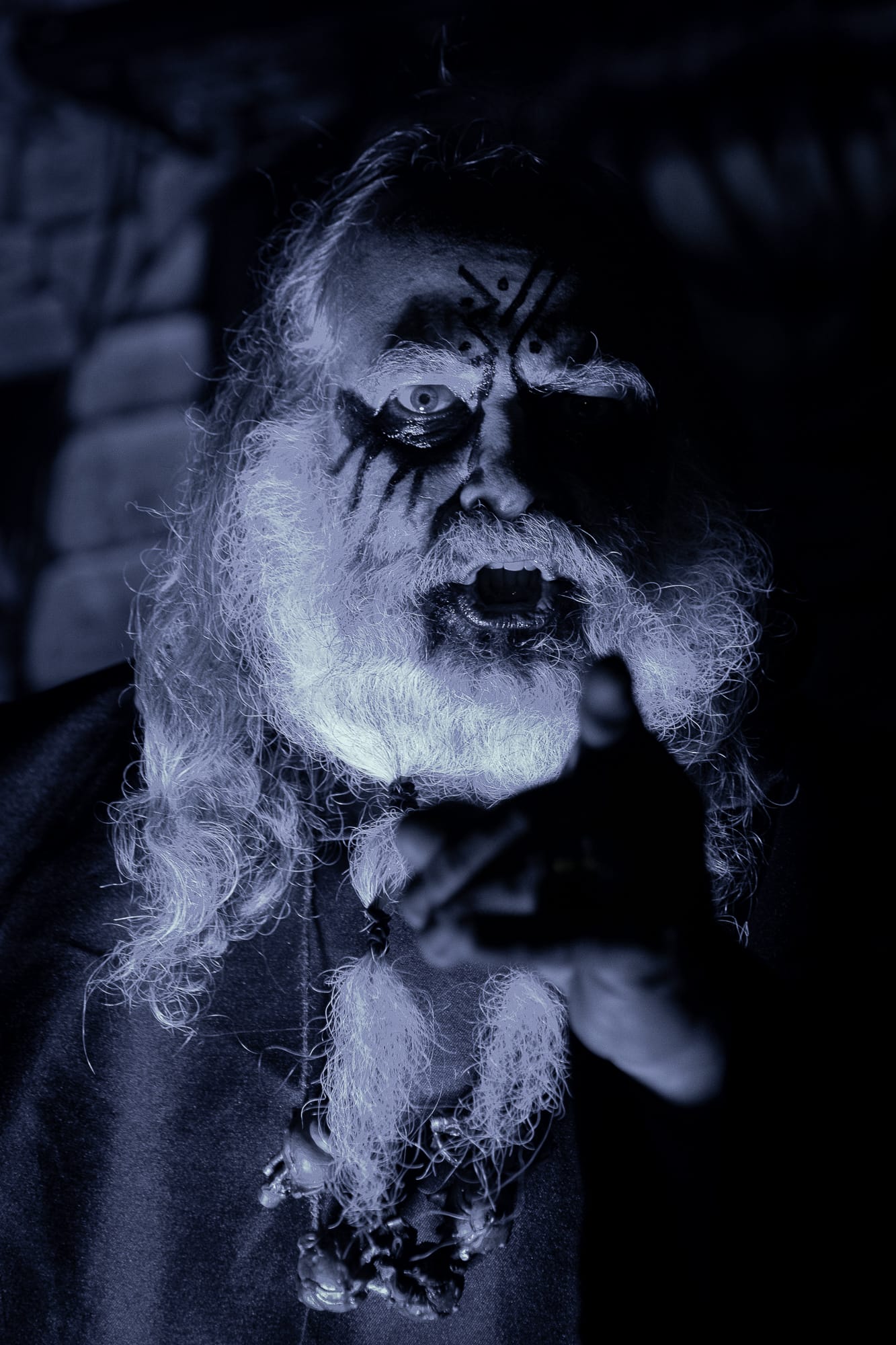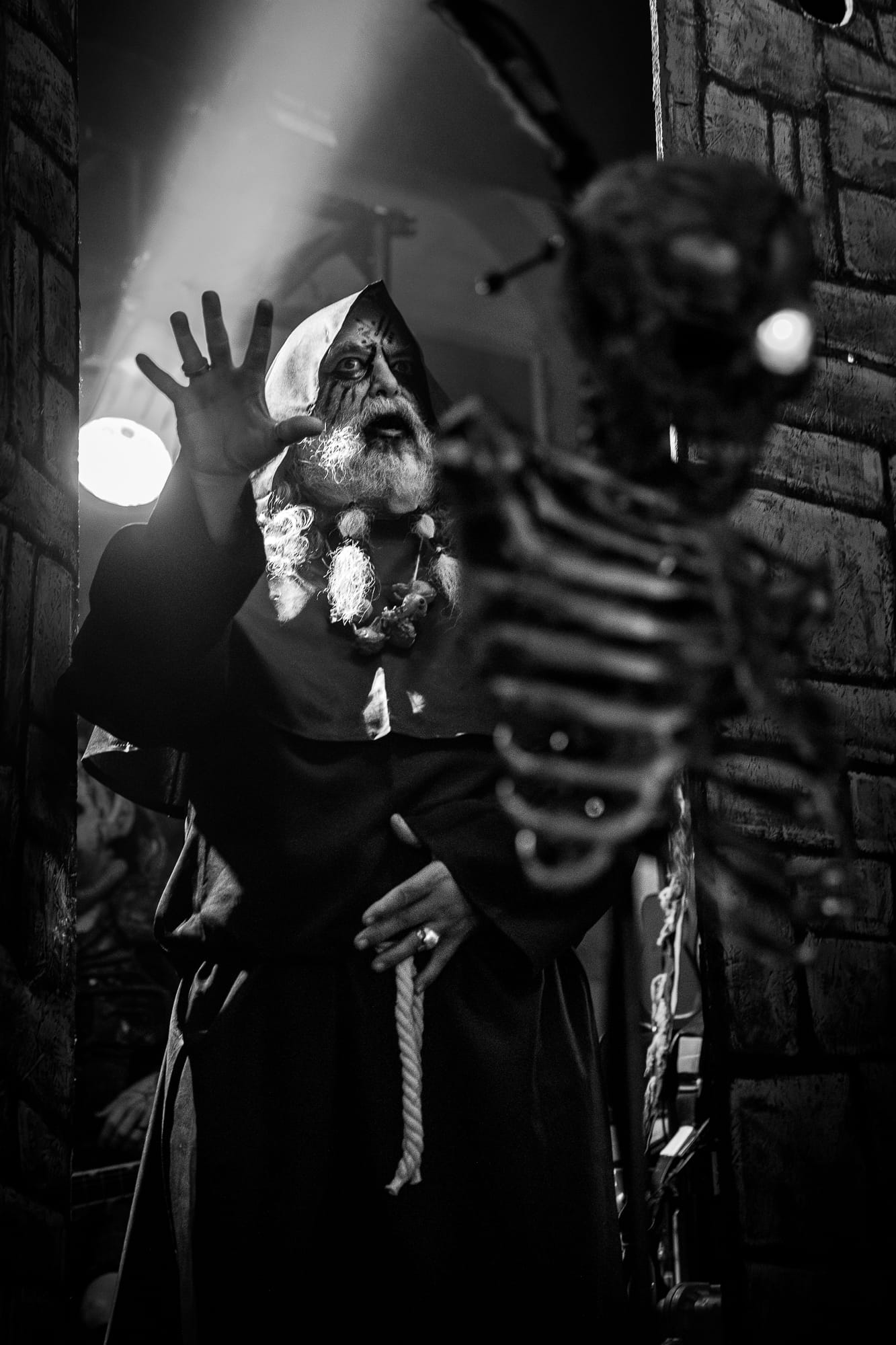The lights dimmed as "God of Thunder" by KISS began to play, as on stepped Ralph Ruiz (theatrical actor and long time Lordi collaborator) cloaked and hooded as the monk/druid Nosferuiz. Initially singing along to the glam rock legends he slowly made his sinister way to centre stage before breaking into the opening monologue from the 2023 album Screem Writers Guild to introduce the band.