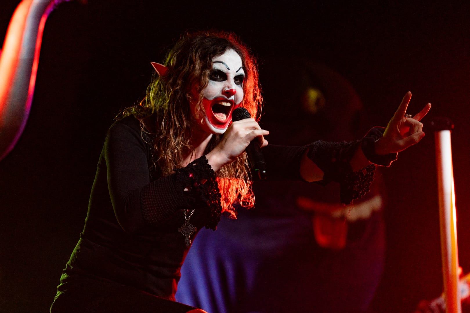 The group didn’t slow their intensity for the entire set, other than an instrumental interlude during the track “Black Philip,” another film homage, this time referencing The Witch. Vocalist Alyson Blake Dellinger came to the stage wearing a goat mask, similar to the Black Philip character, and ripped apart a baby doll, showering the cheering audience with the pieces.