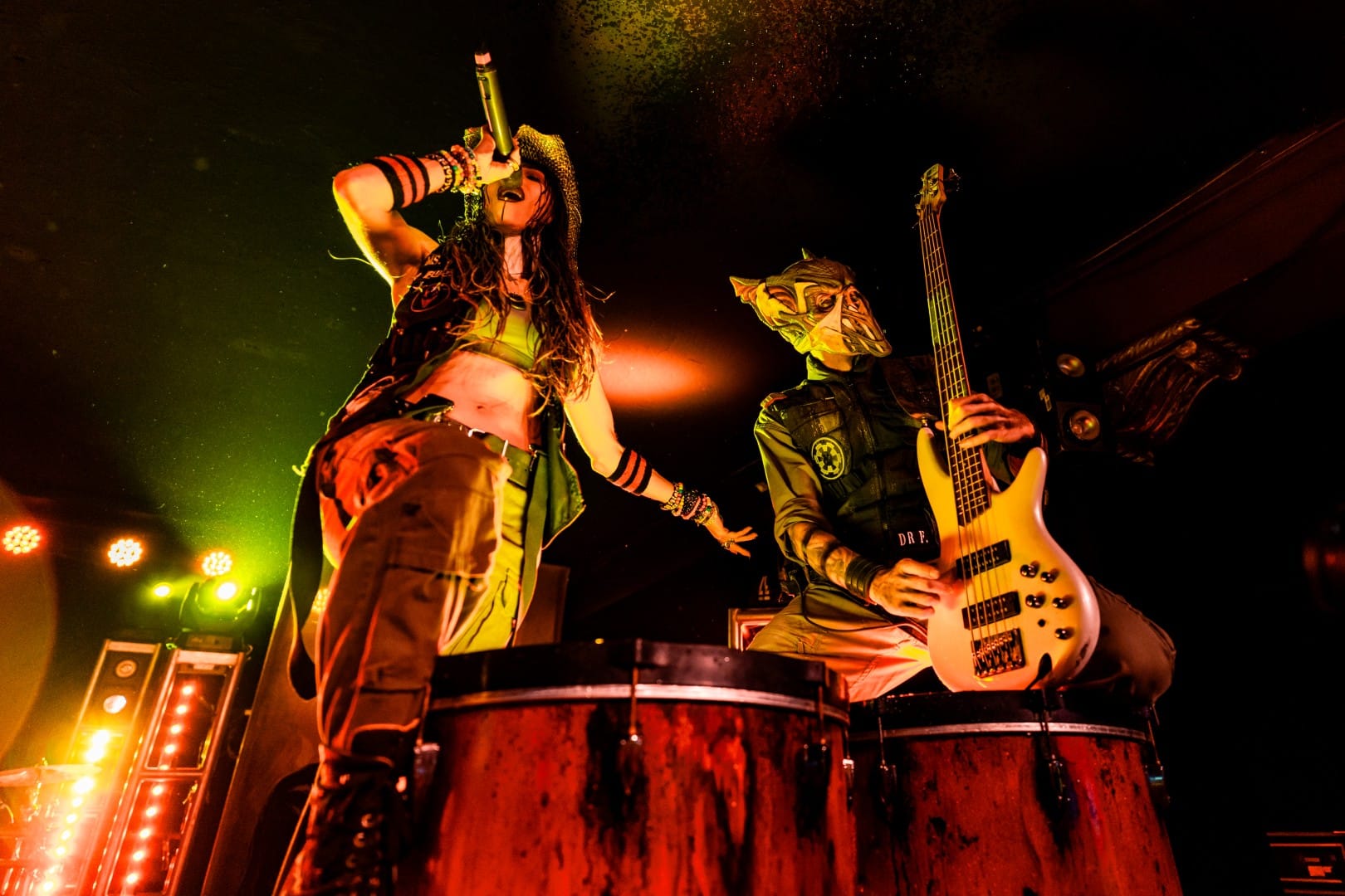 The third, and final, vocalist Jackie LaPonza joined the group for “Fall in Line,” also following suit and jumping the barricade to walk on top of the crowd while still performing. This type of close interaction has become a staple of Mushroomhead performances, and the crowd is always ready to carry someone to and from the stage.