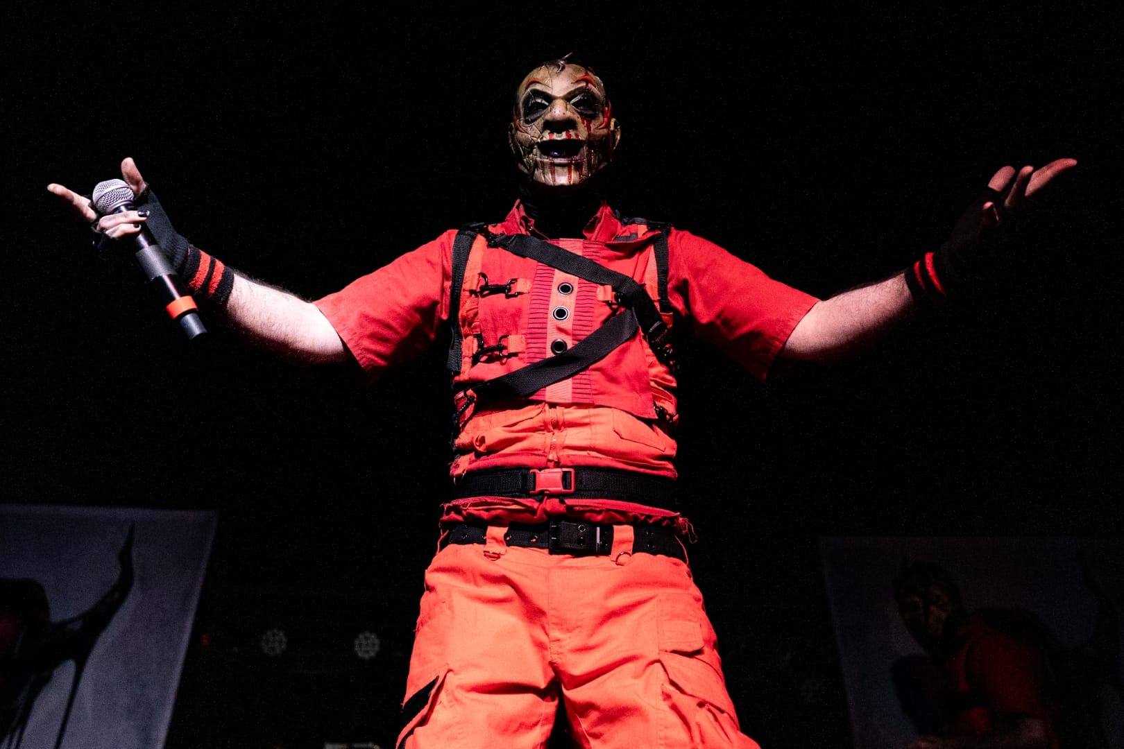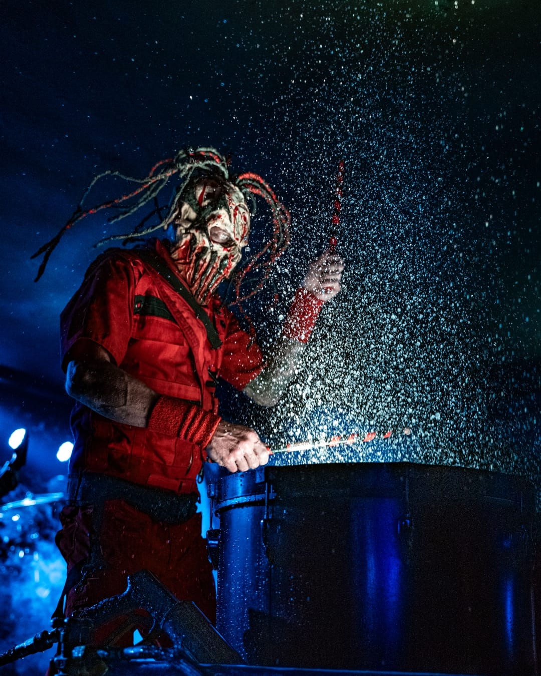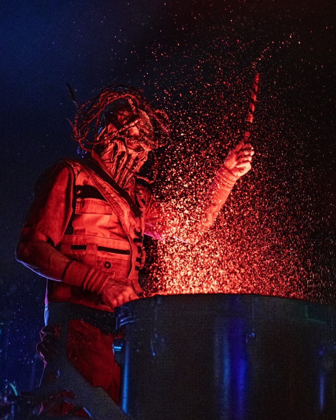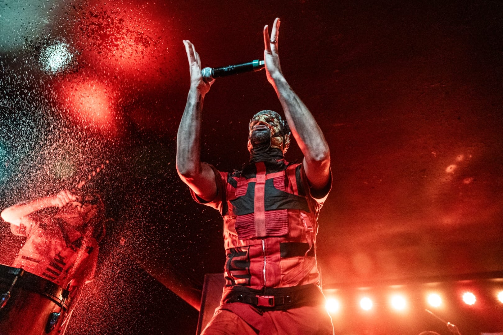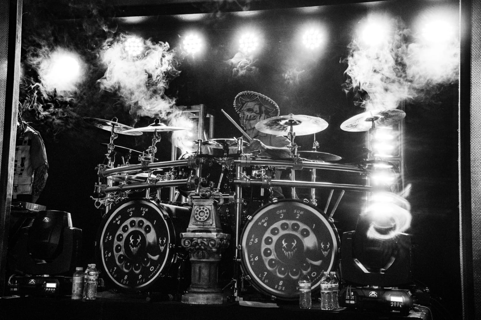 The time of the night hits for the long-awaiting drums on stage to be uncovered, revealing the Mushroomhead graphics, featuring art from their latest album, Call the Devil. The water drummers took their places, as the multiple members filled the stage, with vocalists Steve Rauckhorst and Scott Beck jumping to the front as the group immediately, kicking things off with “12 Hundred.”