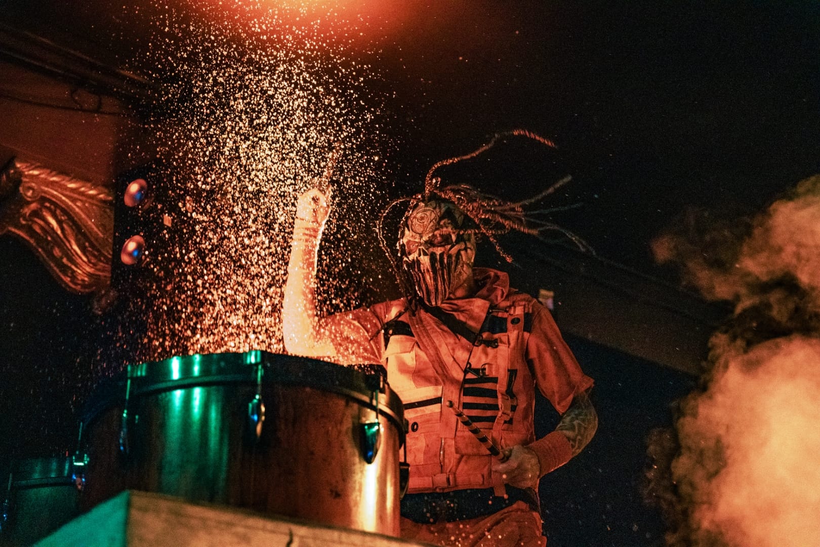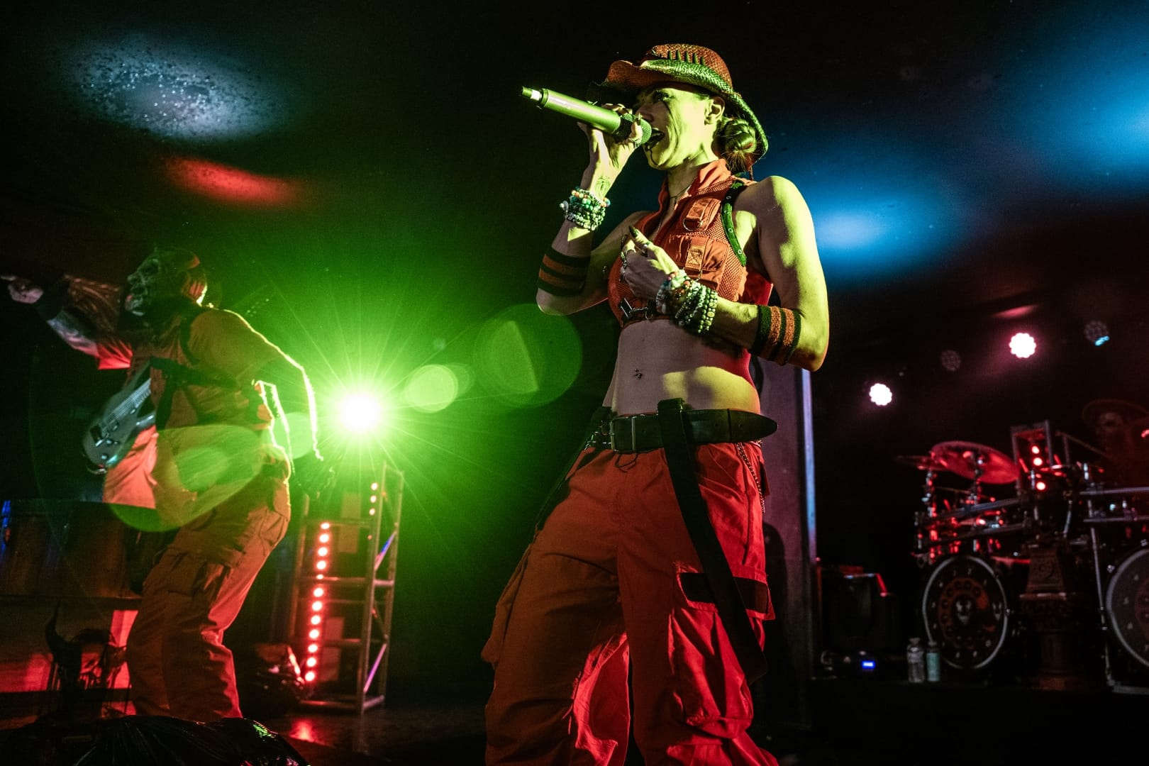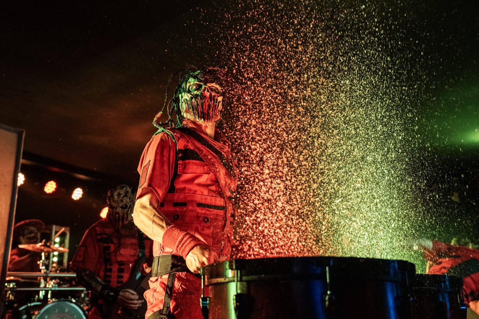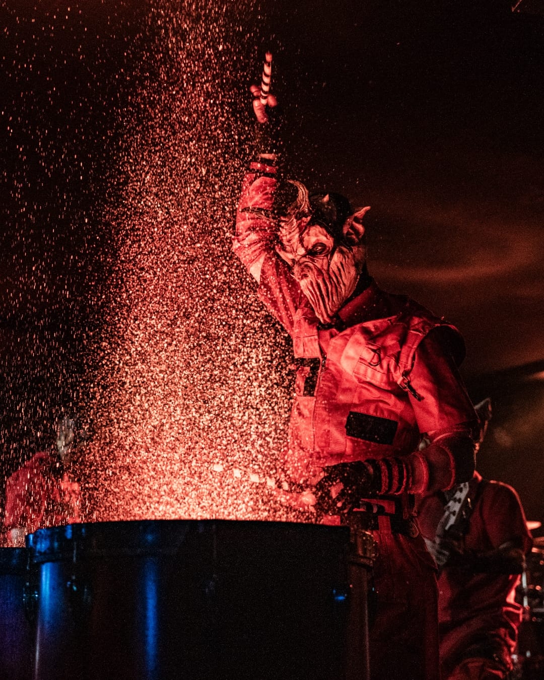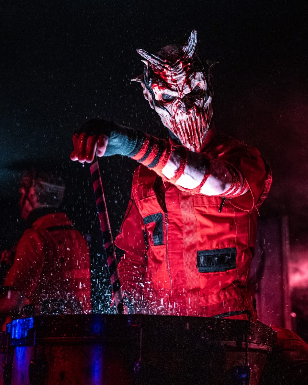 The time of the night hits for the long-awaiting drums on stage to be uncovered, revealing the Mushroomhead graphics, featuring art from their latest album, Call the Devil. The water drummers took their places, as the multiple members filled the stage, with vocalists Steve Rauckhorst and Scott Beck jumping to the front as the group immediately, kicking things off with “12 Hundred.”