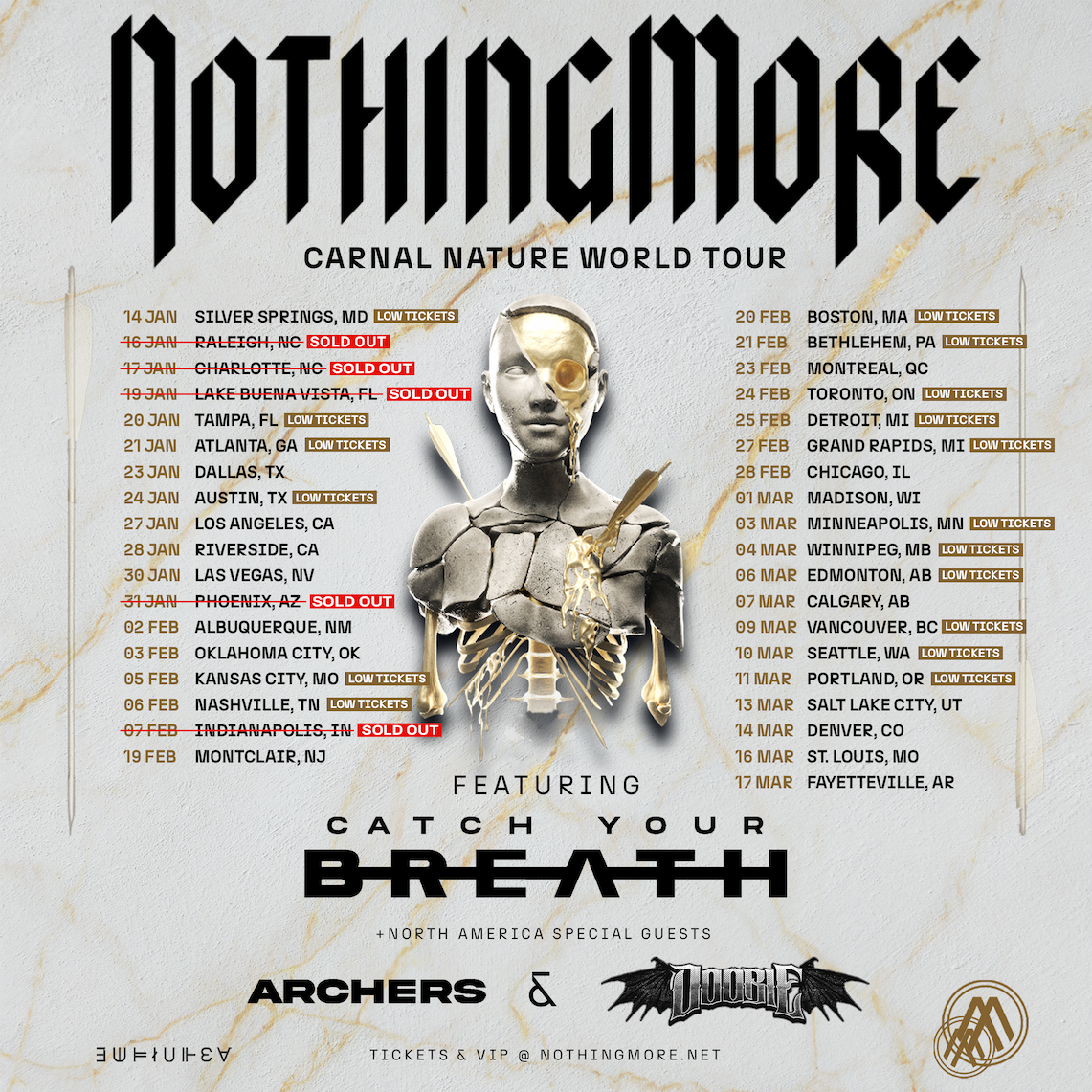 Frontman Jonny Hawkins engaged the crowd with explosive energy, leaning over the stage and moving with clear intention throughout the set. Hawkins fully immersed himself in the performance, and the energy on the stage was unmatched! Through their connection with the crowd, Nothing More made the large venue feel surprisingly intimate. The night opened up with sets from Doobie, followed by Archers and Catch Your Breath, and the venue continued to fill up as the night went on, despite the winter chill outside. It was a night to remember for sure!
