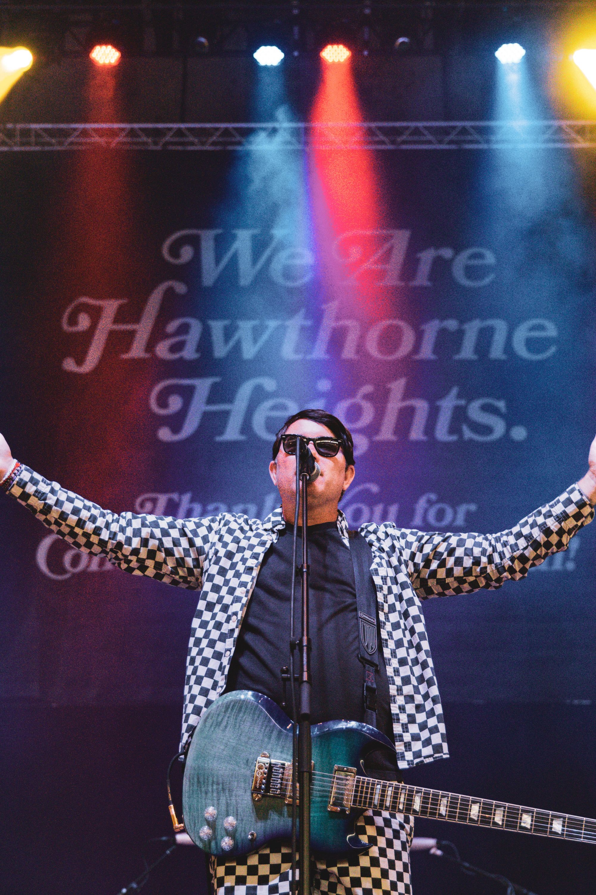 Hawthorne Heights took the stage, thanking every single member of the crowd for attending their festival. The American rock band was formed in 2001, and are native to Dayton, Ohio. The pit was full of elder emos feeling nostalgic with their friends, bearing t-shirts that said “I’ve listened to Hawthorne Heights since high school”.