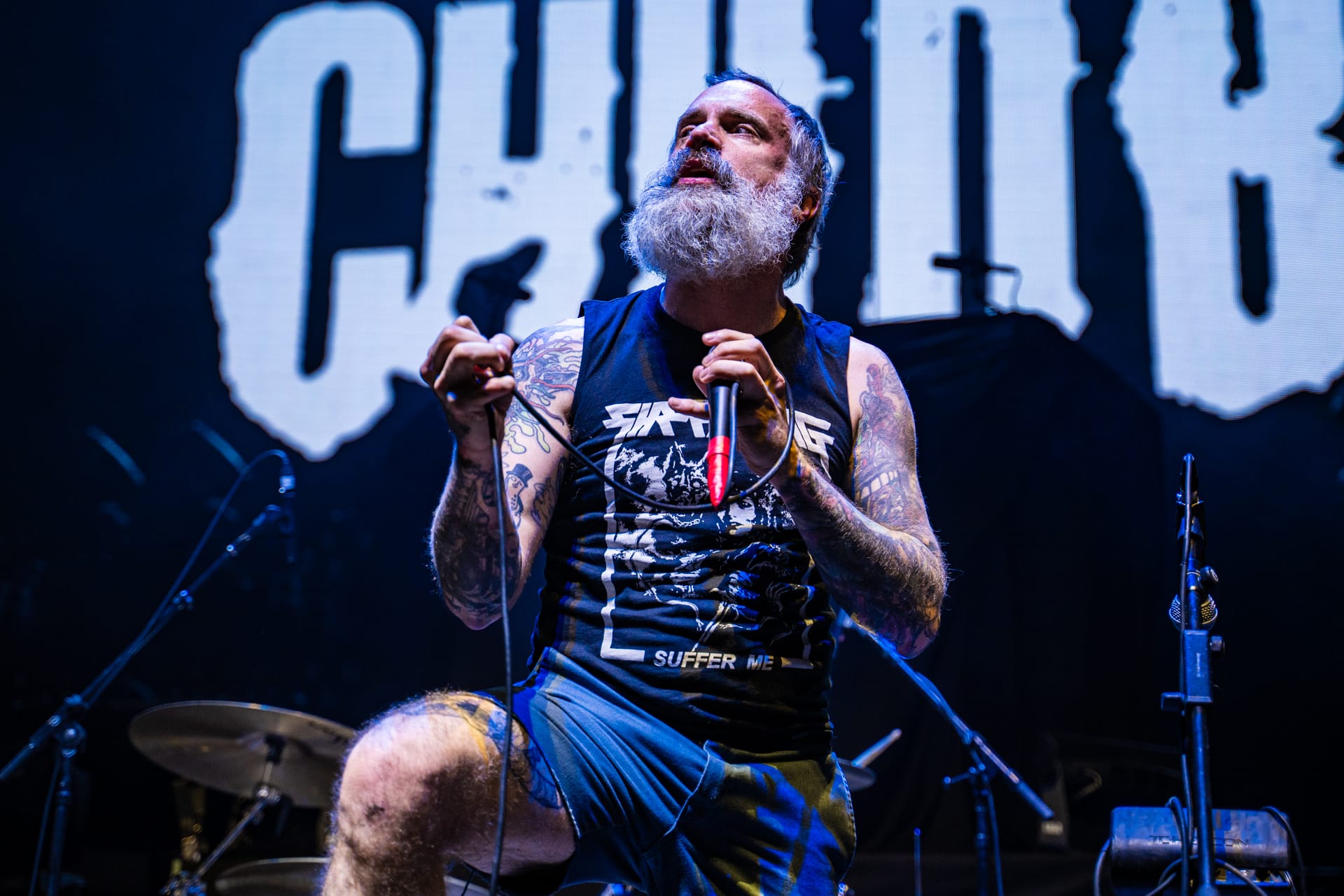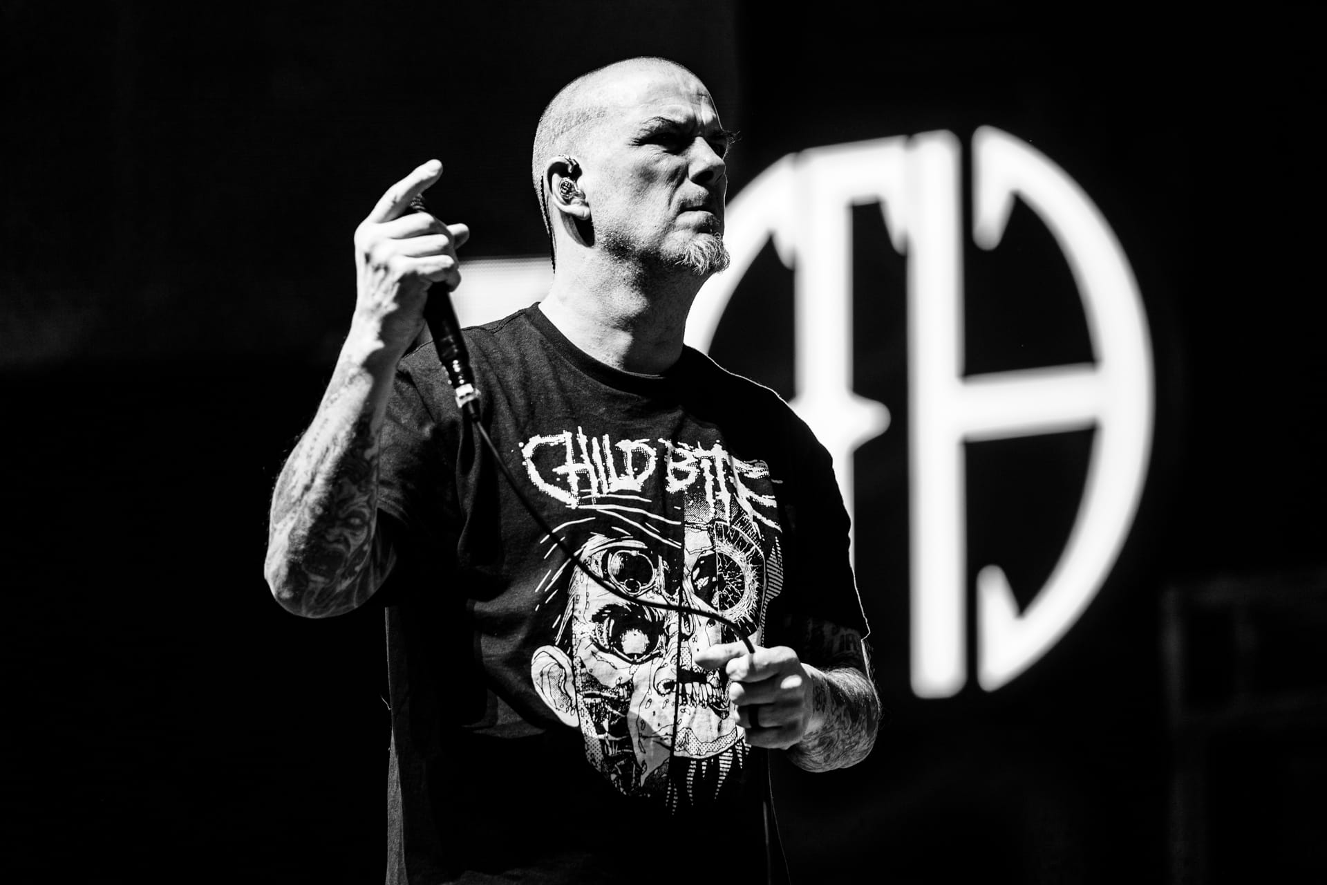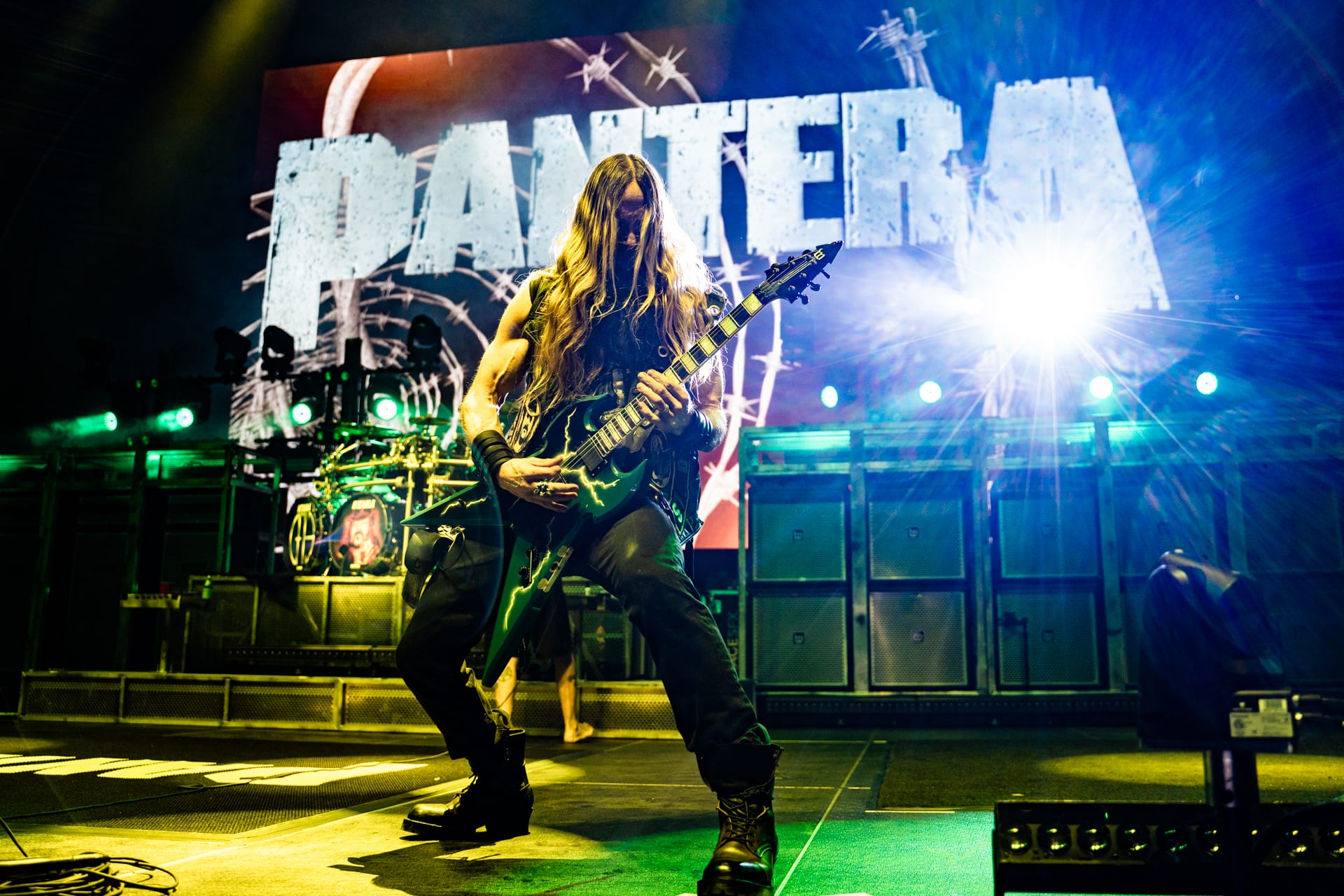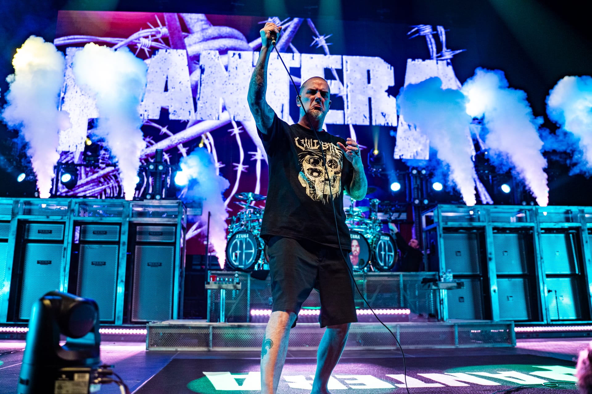 As a massive curtain with the Pantera logo emblazoned upon it was raised to cover the stage, the anticipation grew once again. Guitarist Zakk Wylde ran out into the pit and took videos of the arena as the barricade fans realized just who it was; it took the crowd a moment, as it was one of very few times that his face wasn't completely obscured by his long hair. Singer Phil Anselmo took to the stage, barefooted, dressed in a Child Bite shirt and black gym shorts. After testing the microphones, he moved to the sides of the curtain, waving and saying “thank you” to fans along the sides of the arena.