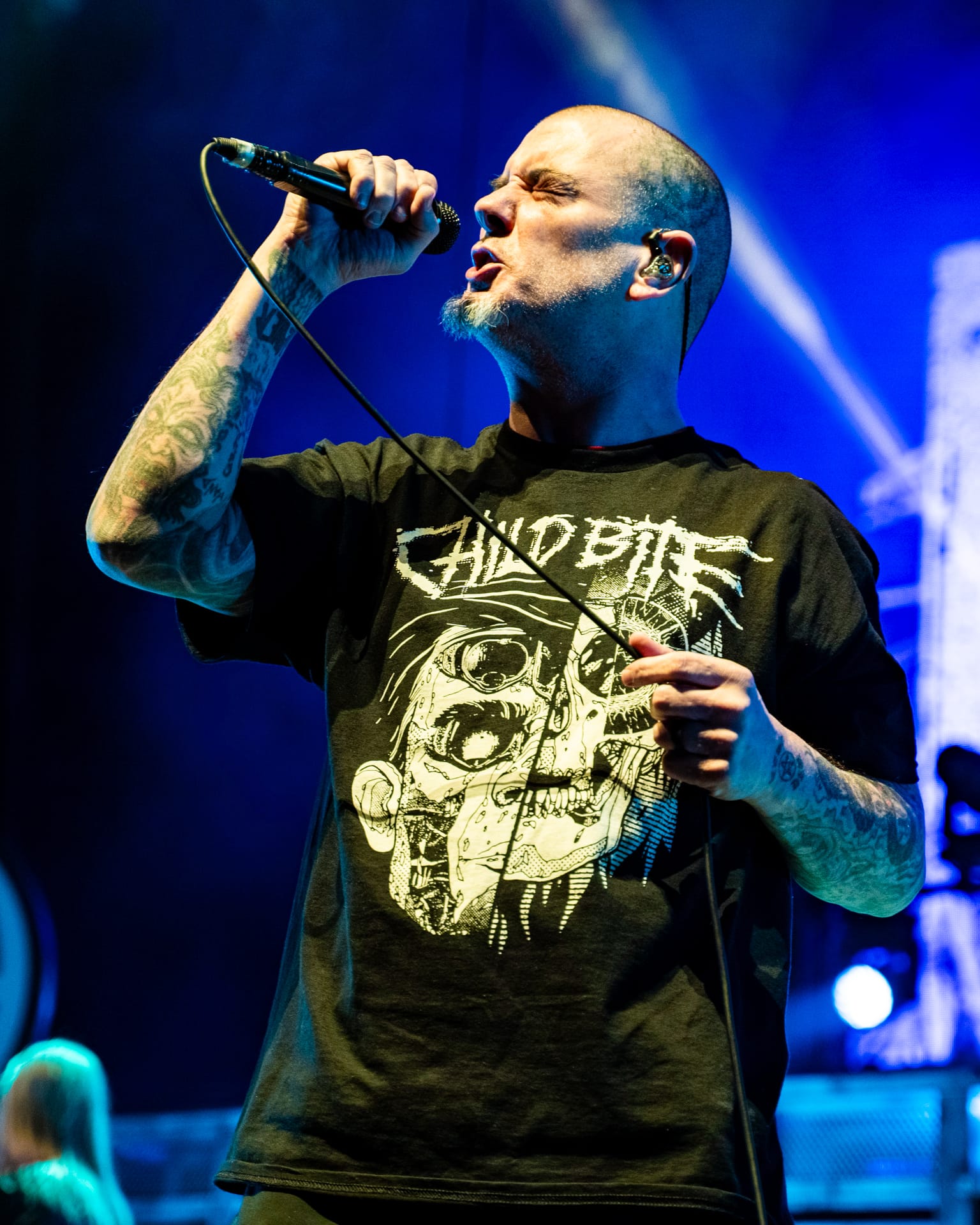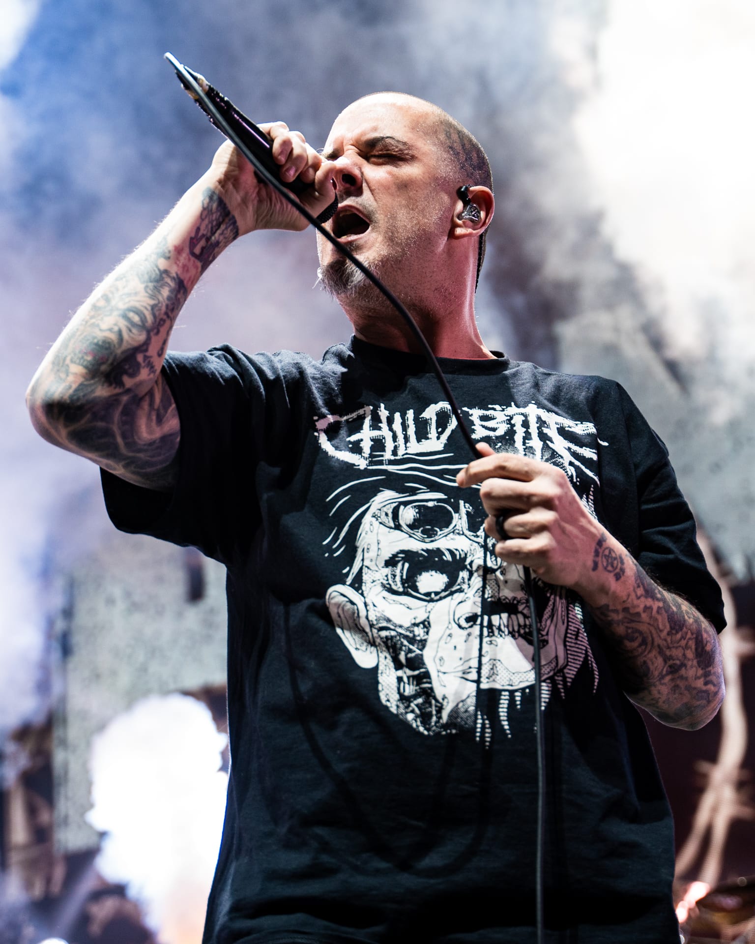 Opener Child Bite immediately set the tone for the crowd at the Resch Center in Green Bay, Wisconsin. Vocalist Shawn Knight prowled the stage, completely unhinged, as the band ripped through a heavy set. The band gave off backyard wrestling vibes, which gave me the desire to see them at a much grungier venue; I’m sure their stage antics and dropkicked beers would be welcomed tenfold. This wild energy is what an arena crowd needs to jumpstart an evening of heavy metal, getting them off of their feet and getting the mosh pits going early.
