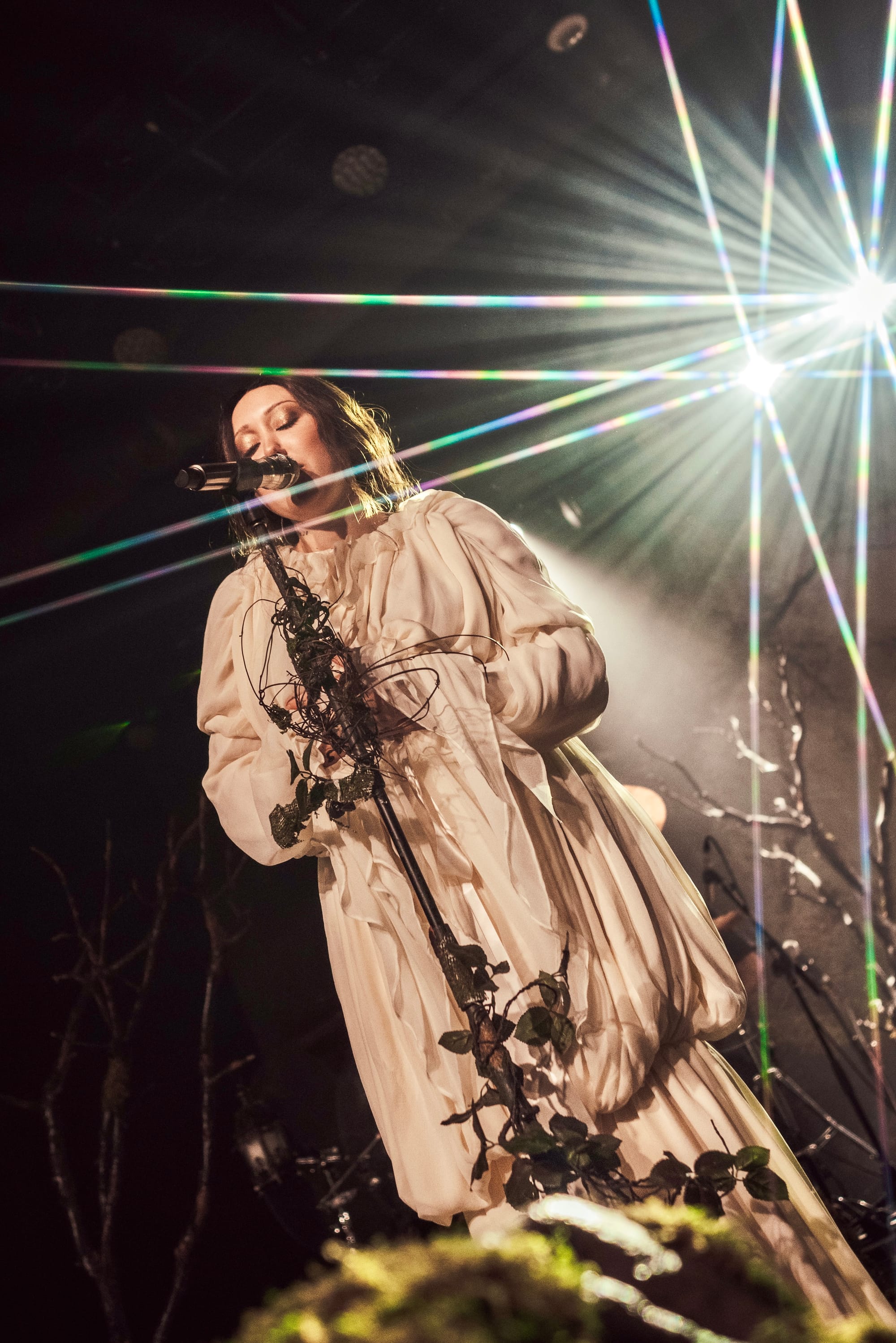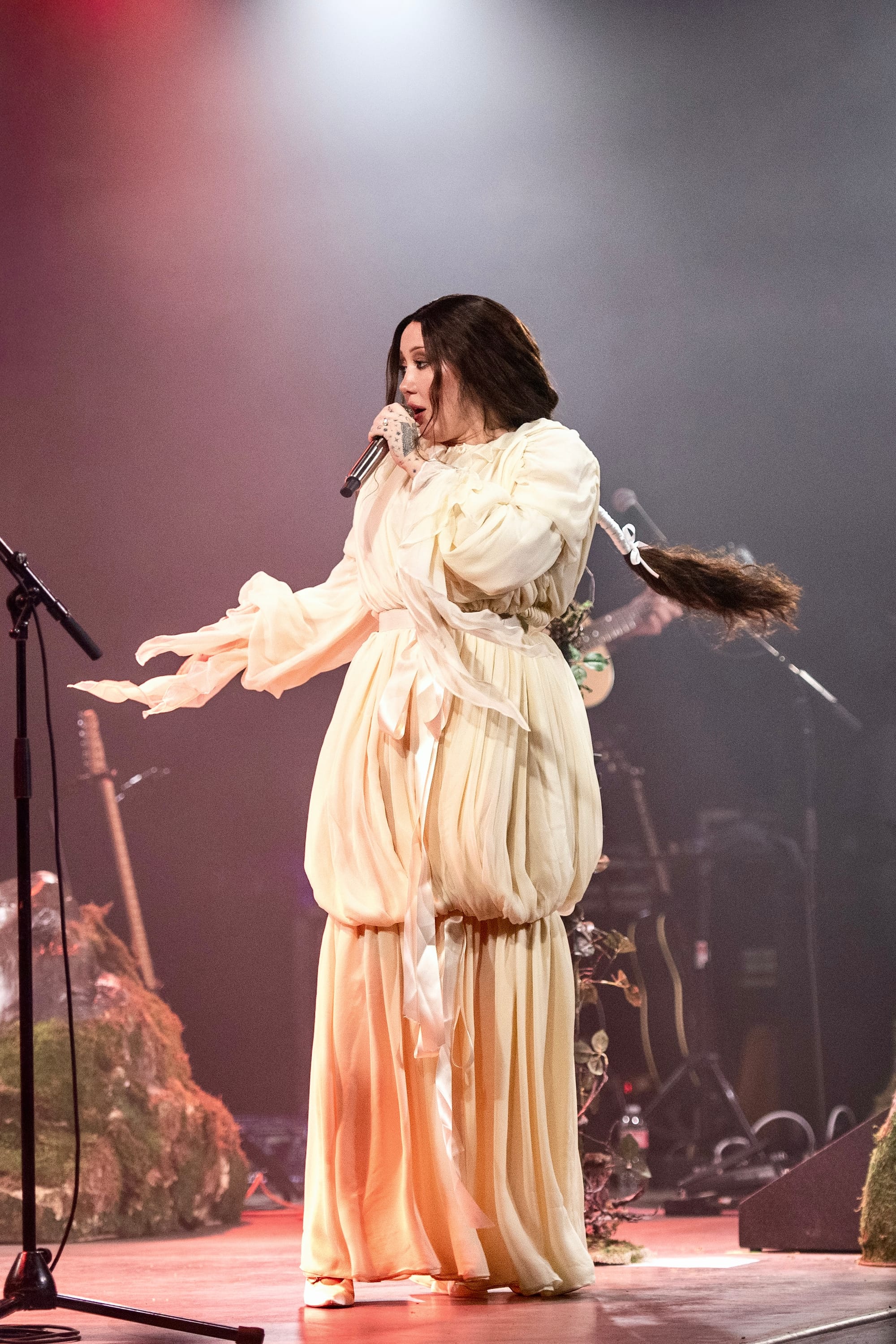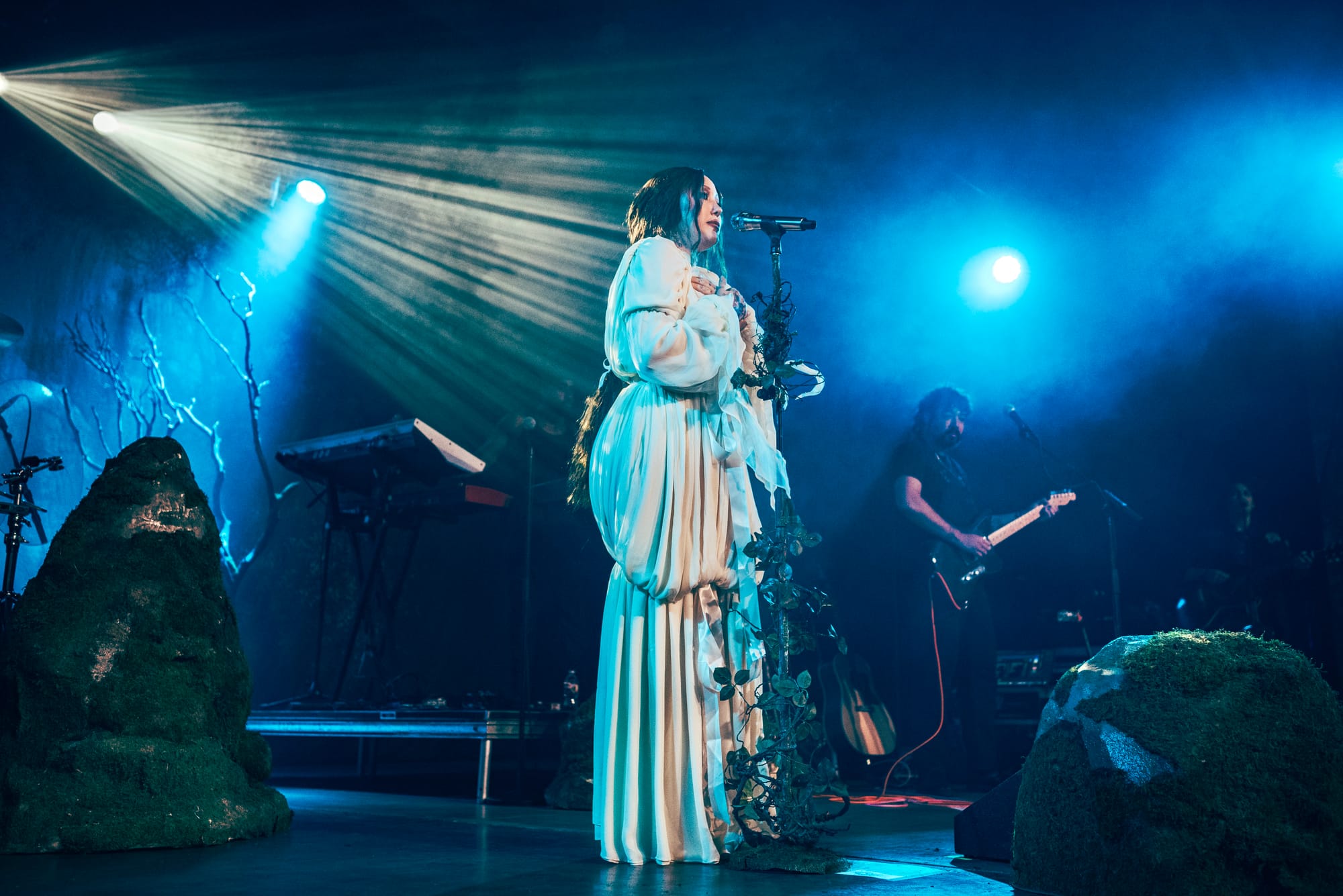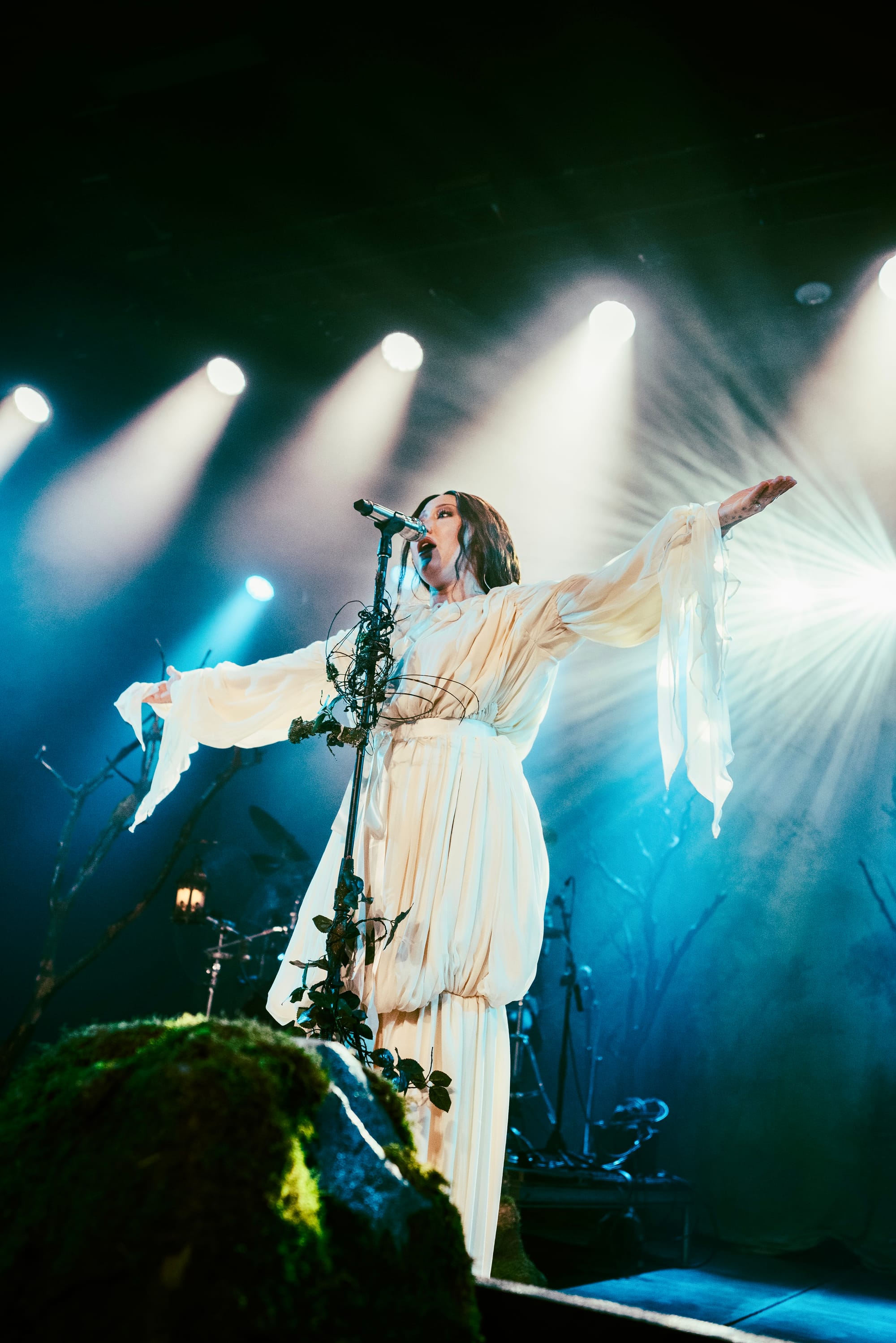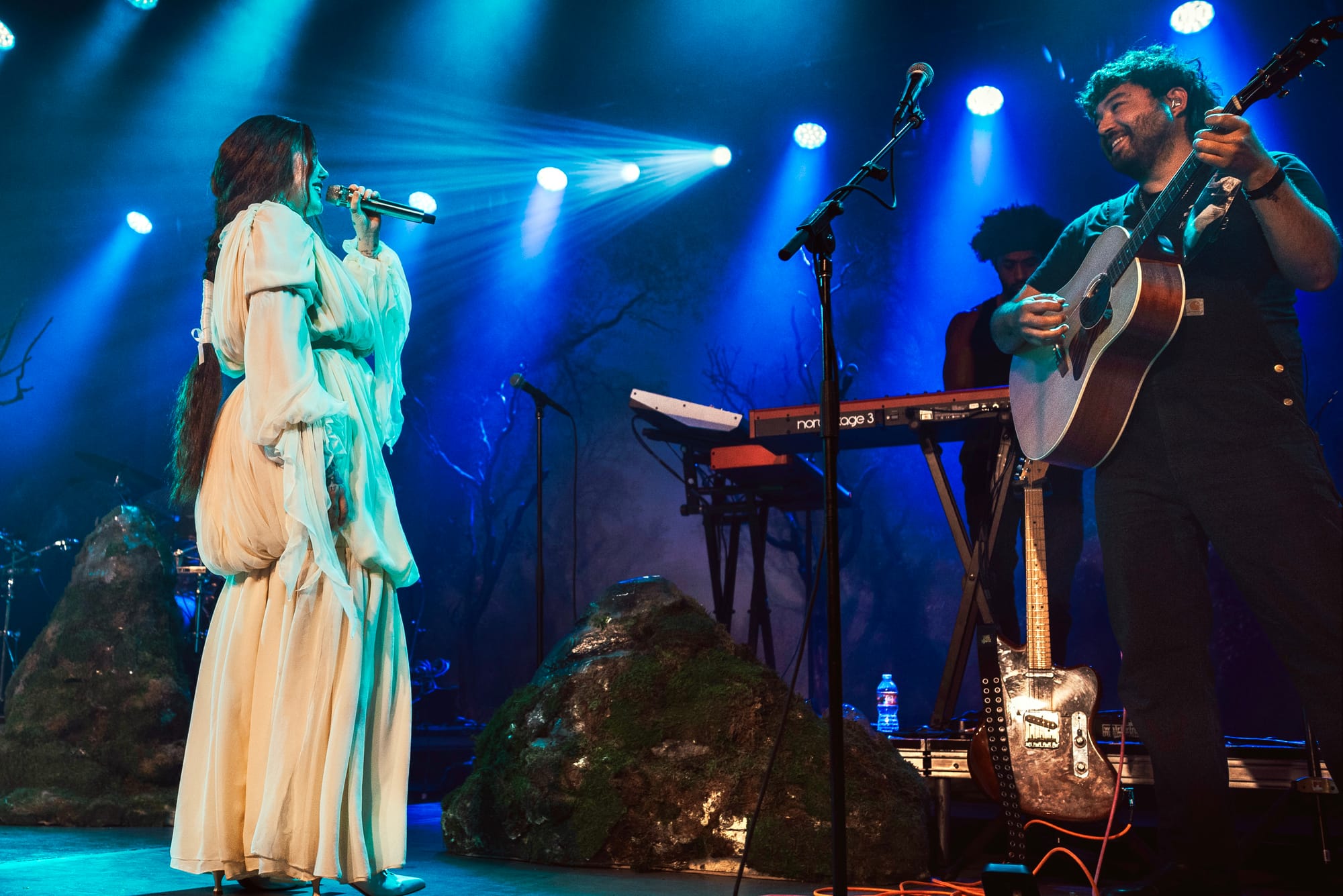 Moss-covered boulders adorned the stage and Noah’s mic was decorated with sprigs and leaves. The vibe was giving “enchanted forest” vibes, and the scene was beautifully set for a night of storytelling through music. Noah appeared through a haze of fog, holding out a lantern and gracefully making her way to the mic as the audience cheered.