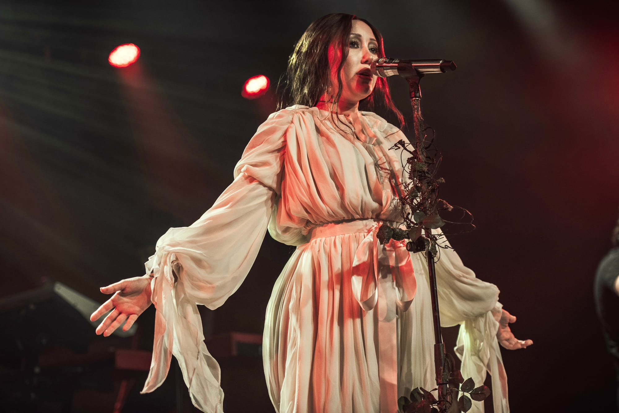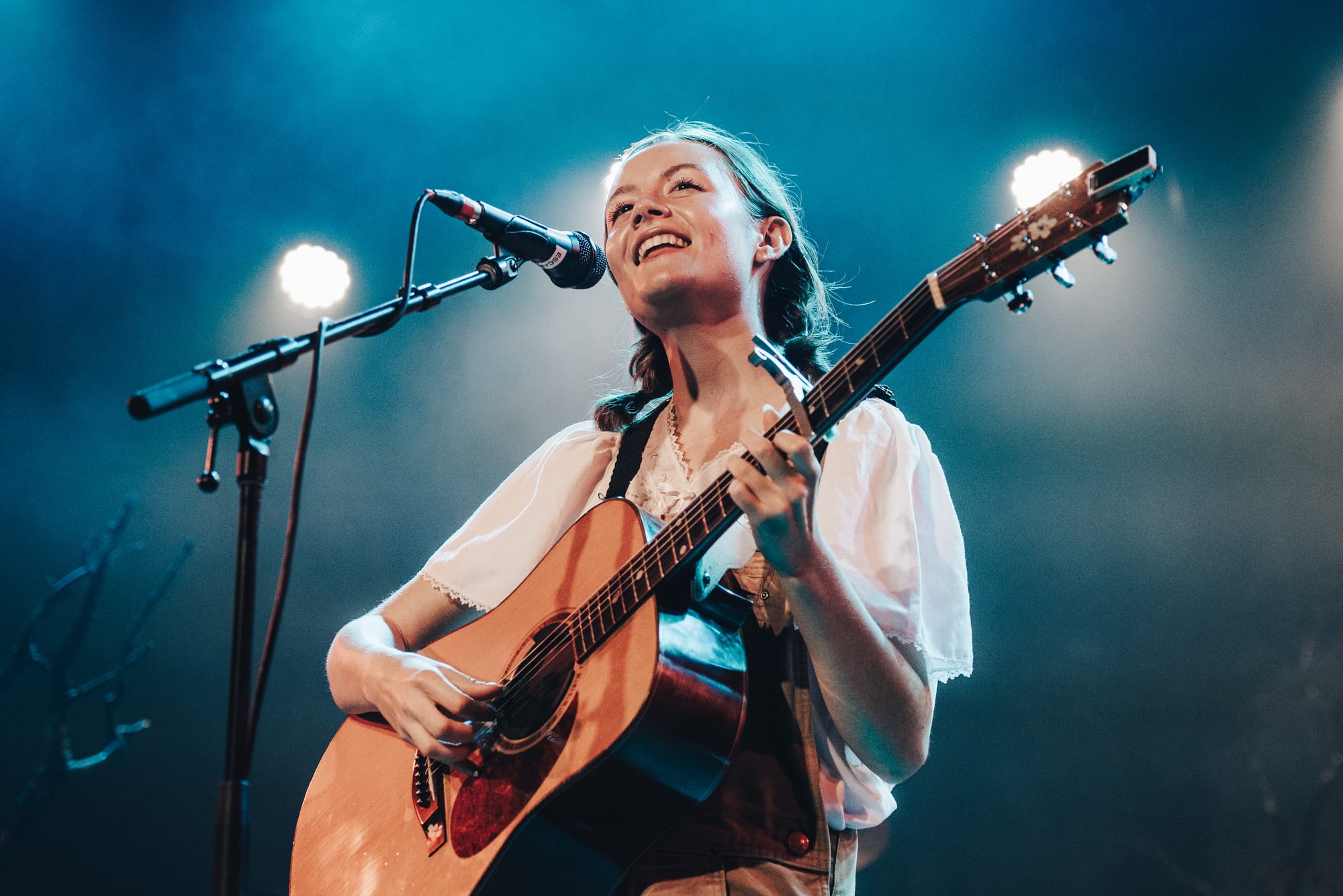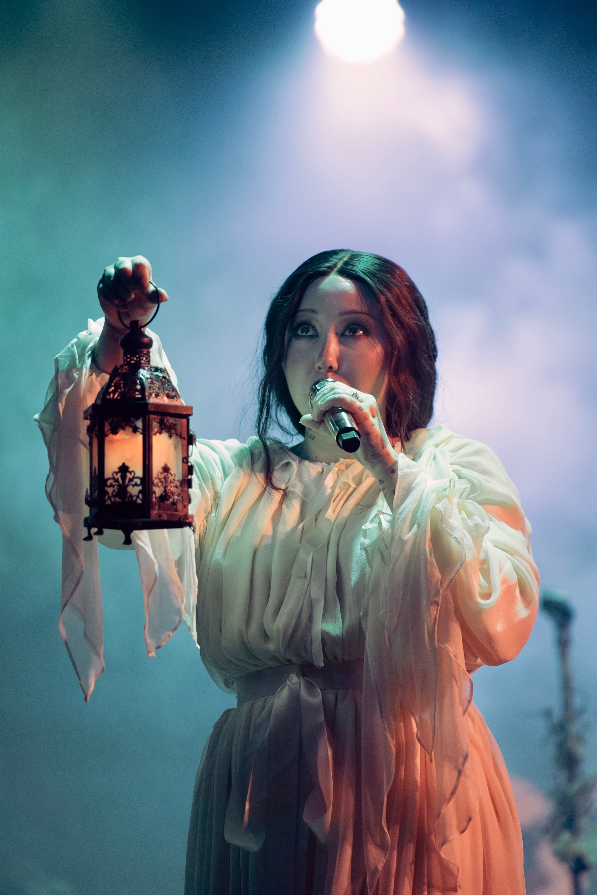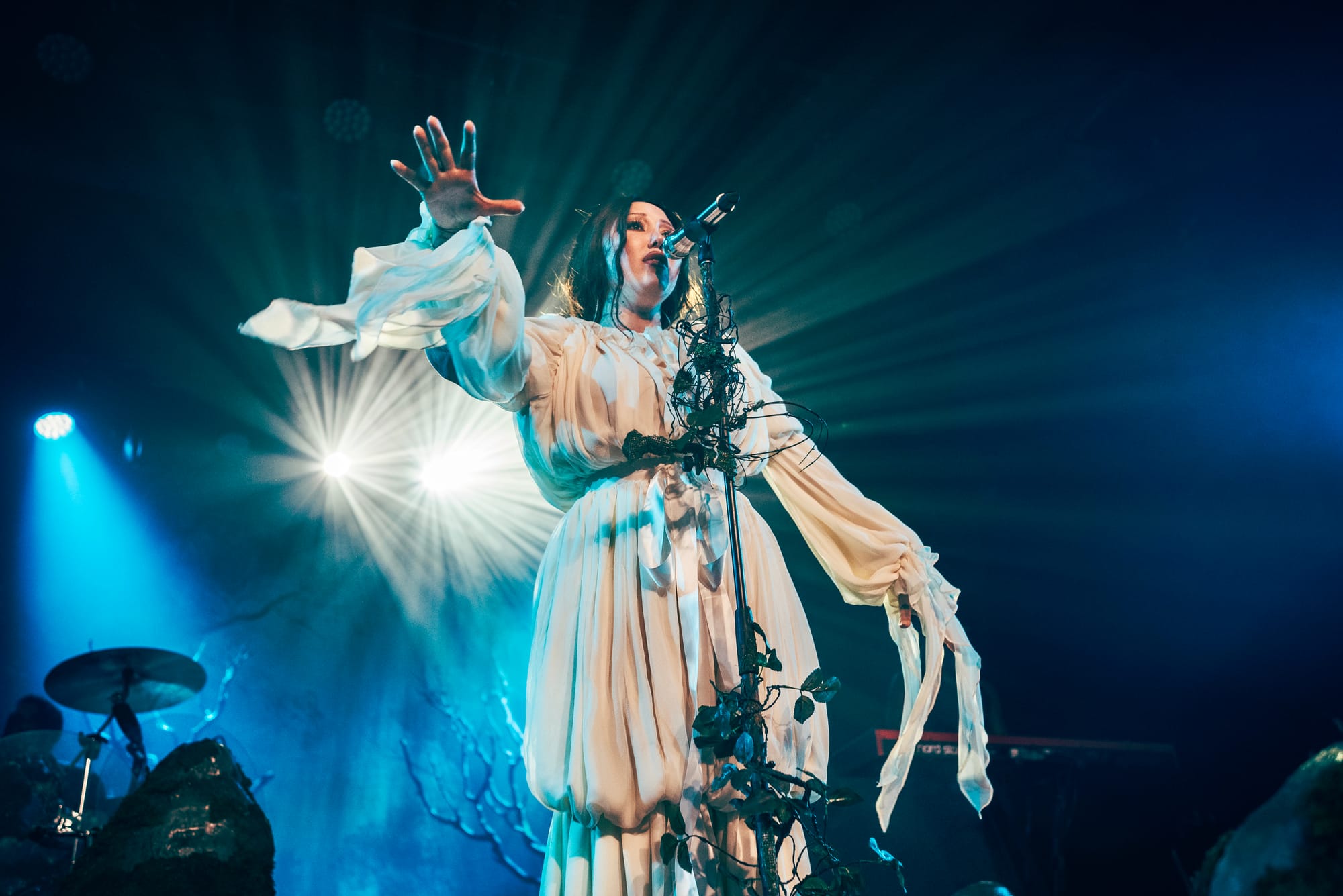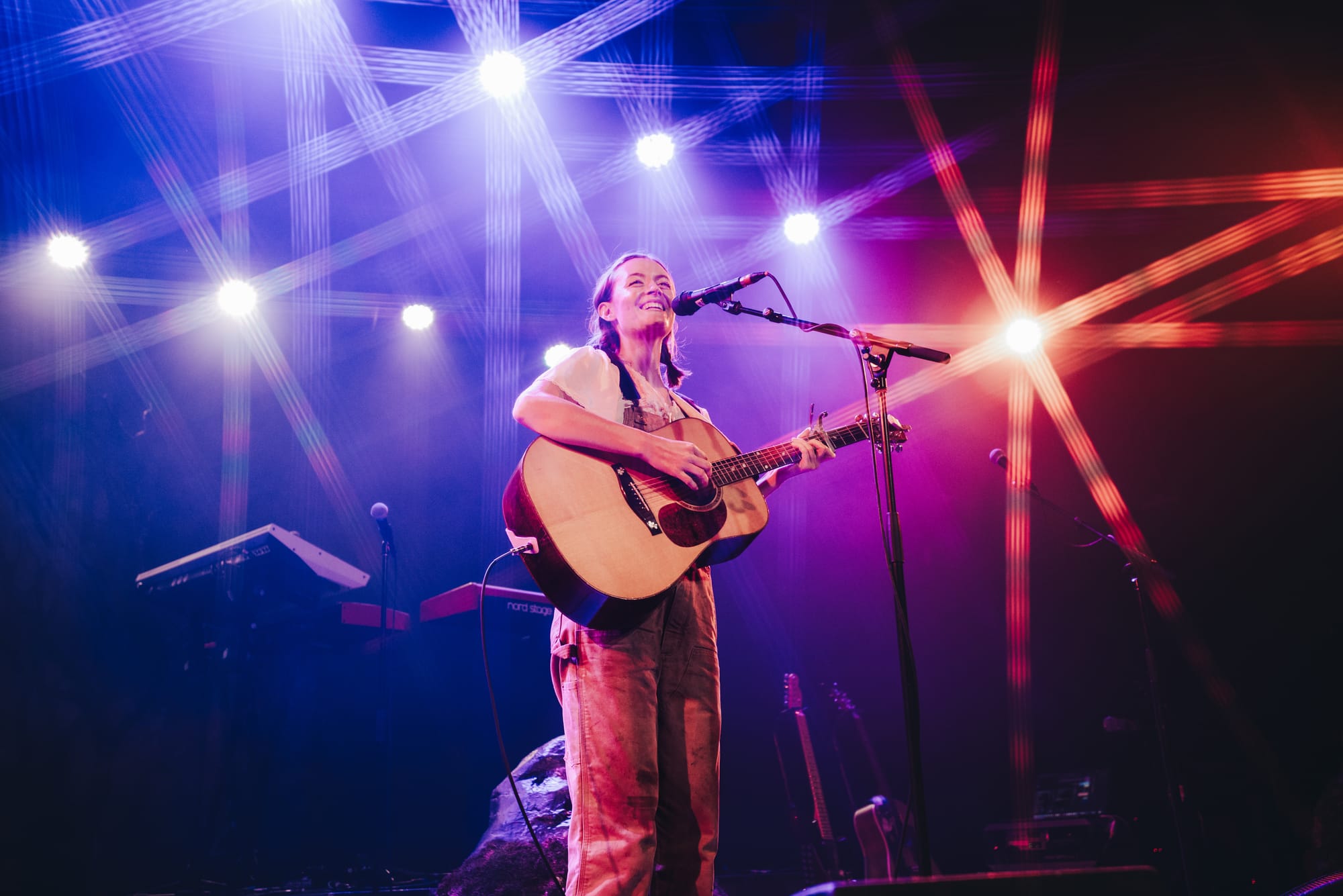 Moss-covered boulders adorned the stage and Noah’s mic was decorated with sprigs and leaves. The vibe was giving “enchanted forest” vibes, and the scene was beautifully set for a night of storytelling through music. Noah appeared through a haze of fog, holding out a lantern and gracefully making her way to the mic as the audience cheered.