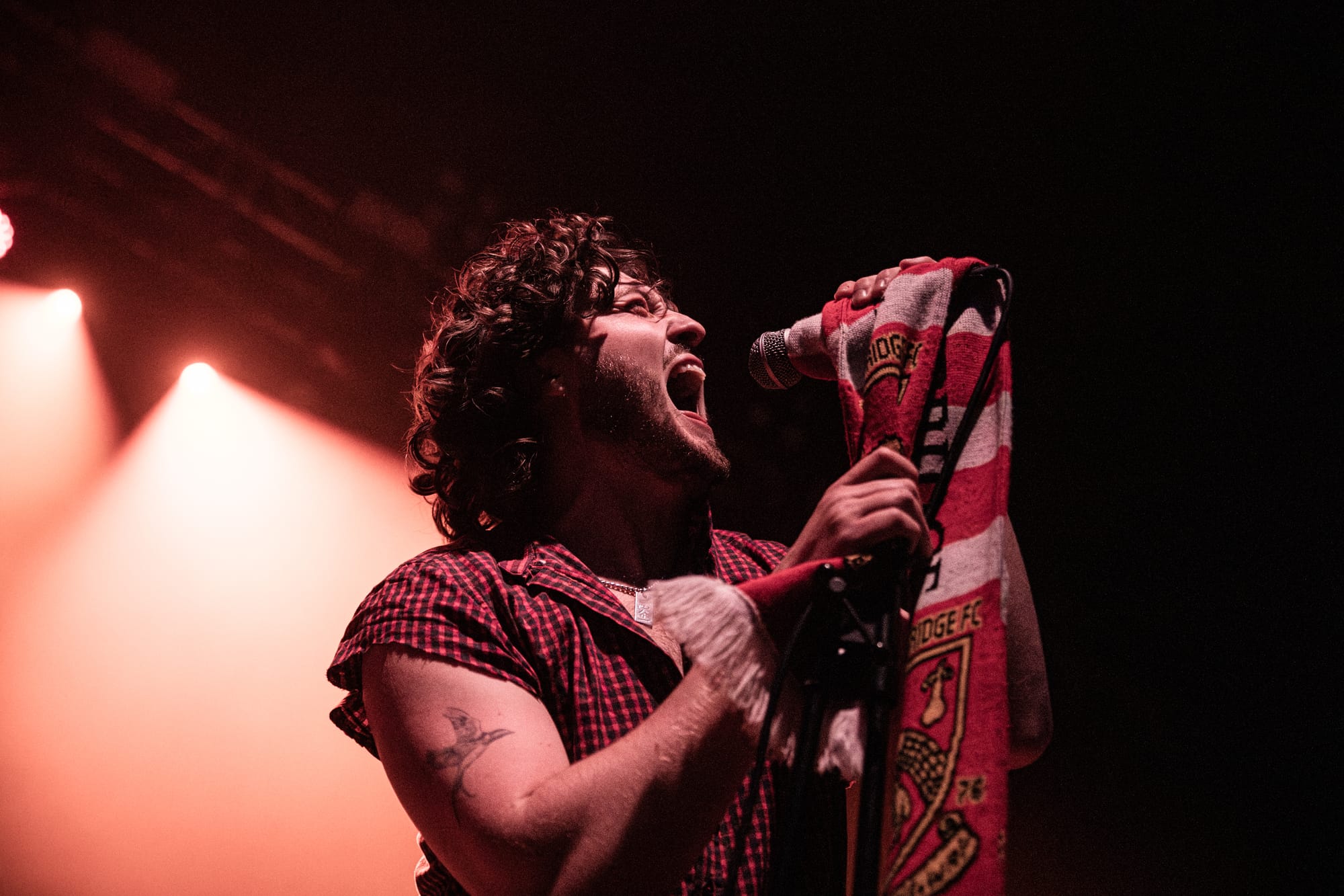 Their frontman emerged onto the stage proudly embellishing a Stourbridge FC scarf wrapped around his neck, displaying it to the crowd before donning it onto his microphone stand.