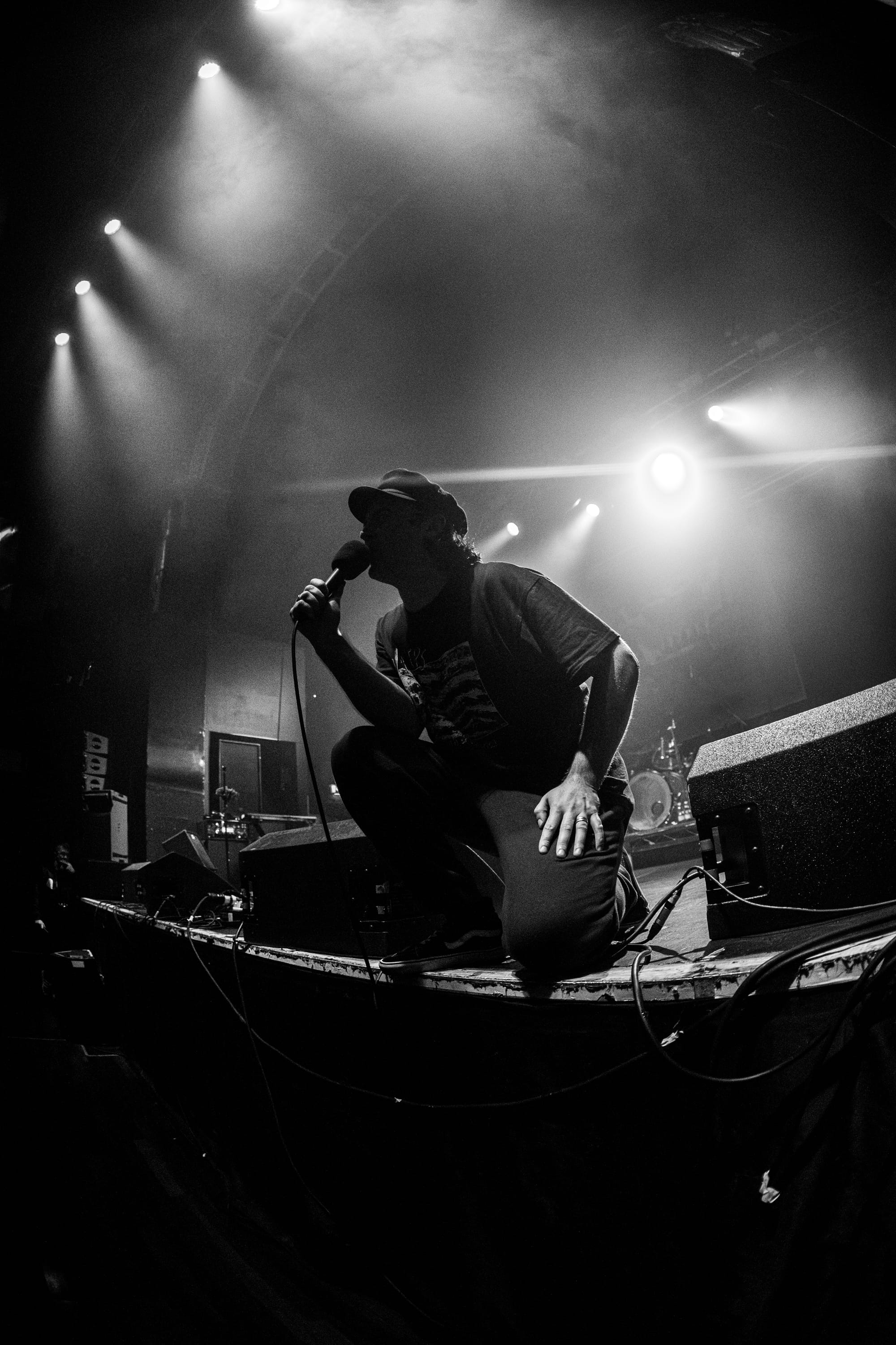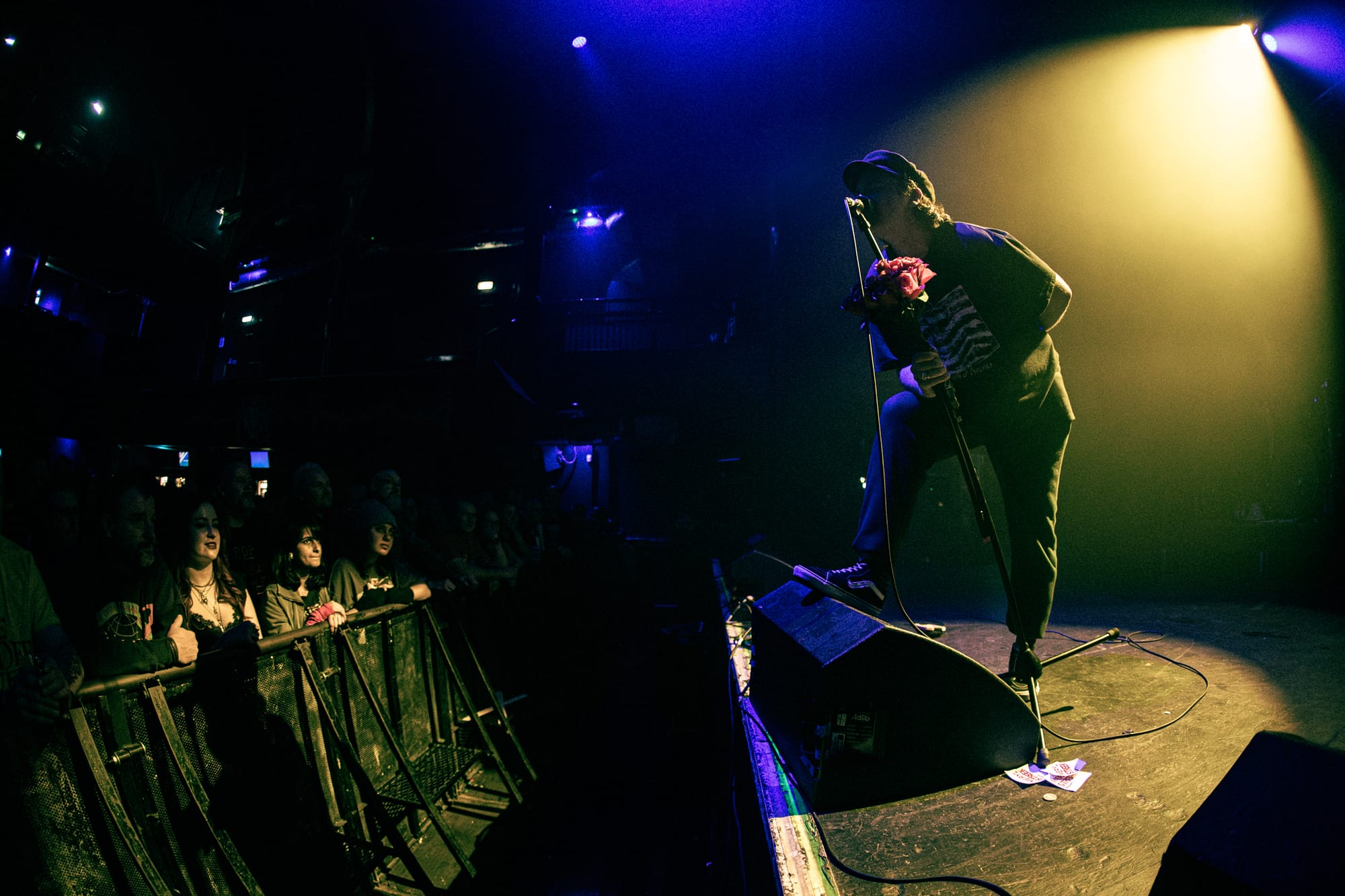 Meryl stalked the stage back and forth, bracing himself for the set, as the crowd watched. As the track ended and kicked into “Fine Jail,” Meryl stepped into almost acrobatics, running up and down the stage, jumping off the wall, as the track began. Meryl wasted no time before descending into “Bertie,” about former Irish Taoiseach (prime minister), known for corruption and his role in the Irish financial and house crashes of 2008, which echoes are still felt to this very day.
