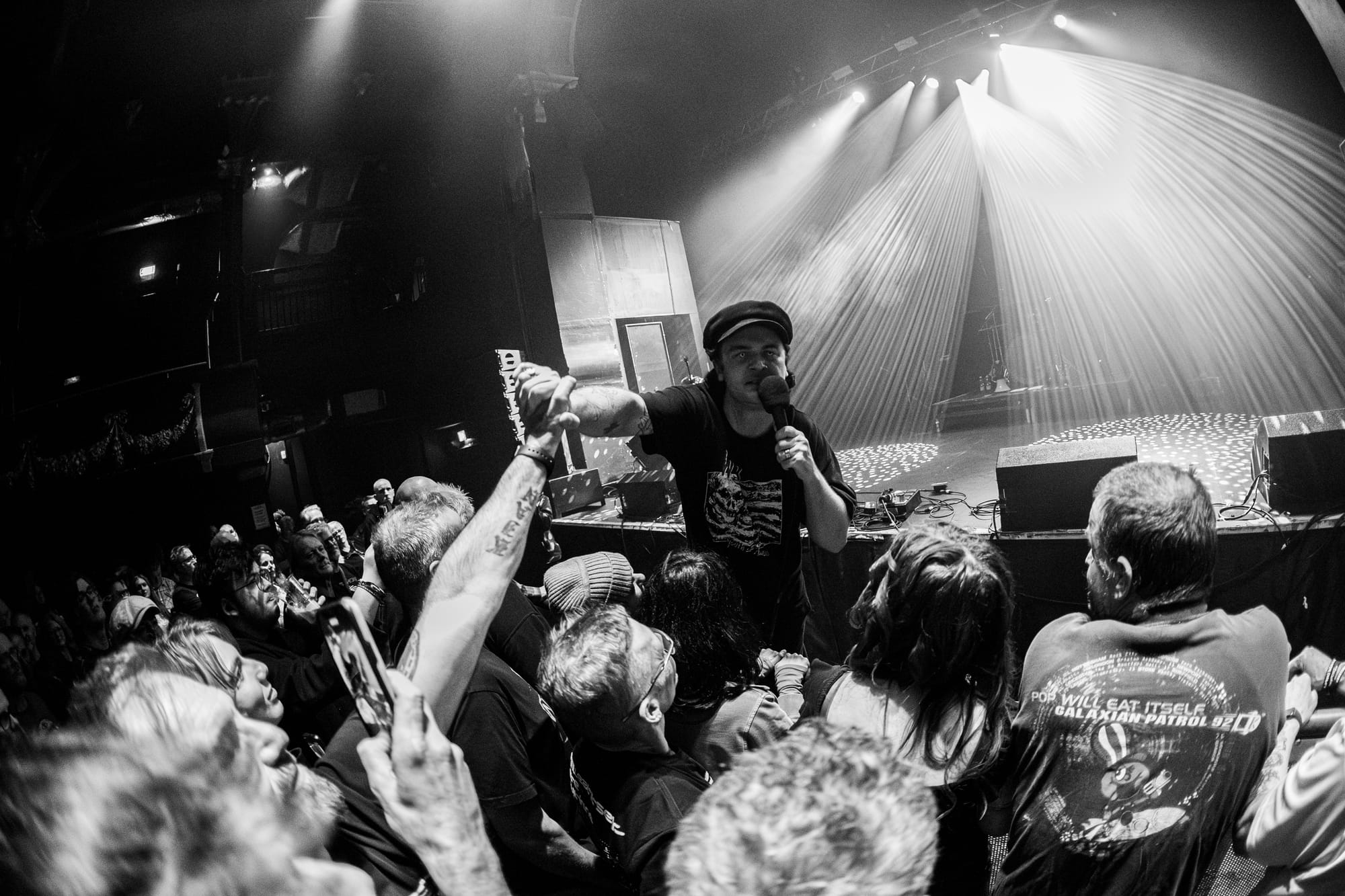 Meryl then descended into the crowd for his tale of financial woes and gambling addiction, which affects not only a huge number of people in Ireland, but also the world — “Gambling Death.” Moving up and down, immersed in the crowd with reckless abandon, and no holds barred with this punk’s confrontational music about real cases, real people, and real problems that the working class faces day-to-day.